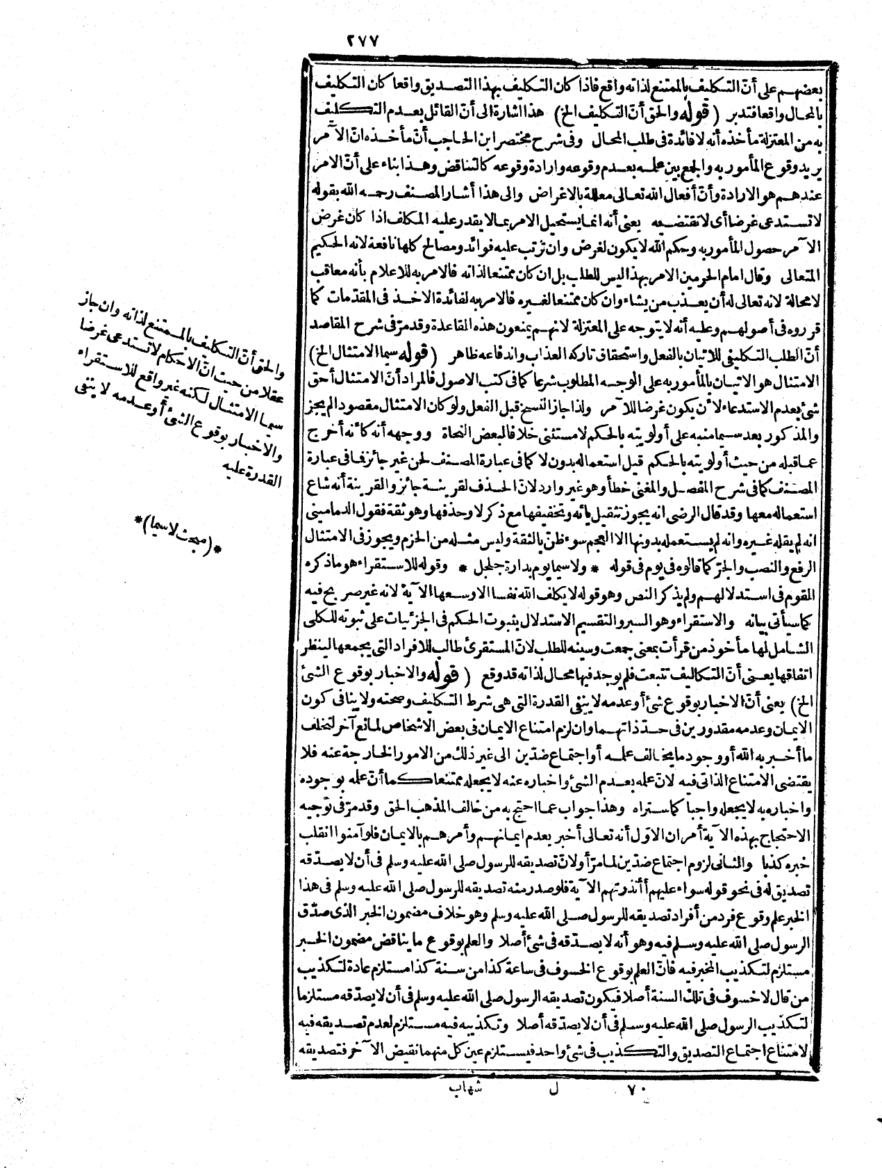 عادة، فلا يكون التكليف به تكليفاً بالمحال وتعلق العلم أو الإخبار بعدم صدوره منهم لا يخرجه عن الإمكان لأنهما تابعان للوقوع لا سببان له على أنا لا نسلم أنهم أمروا به بعدما أنزل أنهم لا يؤمنون. قوله: (كإخباره إلخ) هذا تلخيص لما قاله الإمام من أنّ ما يدل على العلم بعدم الإيمان لا يمنع من وجود الإيمان لأنه لو كان كذلك وجب أن لا يكون الله قادراً على شيء لأنّ ما علم وقوعه يكون حينئذ واجباً فليس للقدرة فيه أثر وأمّا الممتنع فلا قدرة عليه، فلا يكون تعالى قادرا على شيء أصلاً، وهو كفر فثبت أنّ العلم بعدم الشيء لا يمنع من وجوده، والعلم متعلق بالمعلوم على ما هو عليه فإن كان ممكناً فعلمه به ممكن، وان كان واجباً كان واجباً ولا شك أنّ الإيمان والكفر في حد ذاته ممكن، فلو وجب بسبب العلم كان العلم مؤثراً في المعلوم، وقد ثبت أنه محال، وأيضا لو كان العلم والخبر مانعا لم يكن العبد قادرا على شيء أصلاَ كالجماد، وأفعاله كلها اضطرارية ونحن نعلم بالبديهة خلافه فدل على أنّ كلا منهما غير مانع من الفعل والترك، ولو مغ العلم بالعدم عن الوجود كان أمره تعالى الكافر بالإيمان أمراً بإعدام علمه، وهو غير معقول والإيمان في نفسه من الممكنات، فيجب أن يعلمه الله كذلك لئلا ينقلب علمه سبحانه جهلاً، أو يجتمع في شيء واحد كونه واجباً وممكناً وهو محال وقوله باختيار. قيد لفعل العبد إشارة لما تقرّر في الأصول من أنّ الإكرا. الملجىء يمنع التكليف، لزوال القدرة عليه بالاتفاق وأمّ غير الملجىء ففيه خلاف والأصح عند المصنف أنه لا يمنعه بهما ذكره في المنهاج. قوله: (وفائدة الإنذار إلخ) هذات مة لما قبله فإنّ المنكرين له كما في التفسير الكبير قالوا لا يجوز ورود الأمر بالمحال في الشرع لأنه كأمر الأعمى بنقط المصاحف والمقعد بالطيران، وهو كبعثة الرسل للجماد فأشار إلى جوابه بما ذكر، وينجع مضارع نجع بنون وجيم وعين مهملة بمعنى أفاد ونفع وأصله من نجع الدواء إذا نفع المريض ففيه تشبيه لإنذار الرسل بالدواء النافع ولطفه ظاهر كما قال تعالى وننزل من القرآن ما هو شفاء ورحمة والزام الحجة أن لا يبقى لهم شبهة يجيبون بها، أو يقولون ما جاءنا من نذير، وحيازة الرسول صلّى الله عليه وسلّم أي تحصيله ووصوله لها من حازه إذا ضمه وجمعه كما في القاموس وغيره، وتفسيره بالإحاطة على أنه من الحيز وهو المكان تكلف، ولم يقل سواء عليك لأق الإنذار وعدمه ليس سواء لديه لفوات فضيلة الإنذار الواجب عليه على تركه وإذا أربد بالموصول ناس معينون على أنّ تعريفه عهديّ، كما هو الأصل فيه كان فيه معجزة لأخبار. بالغيب وهو موت هؤلاء على الكفر كما كانوا بخلاف ما لو كان للجنس لعدم التعيين وهو