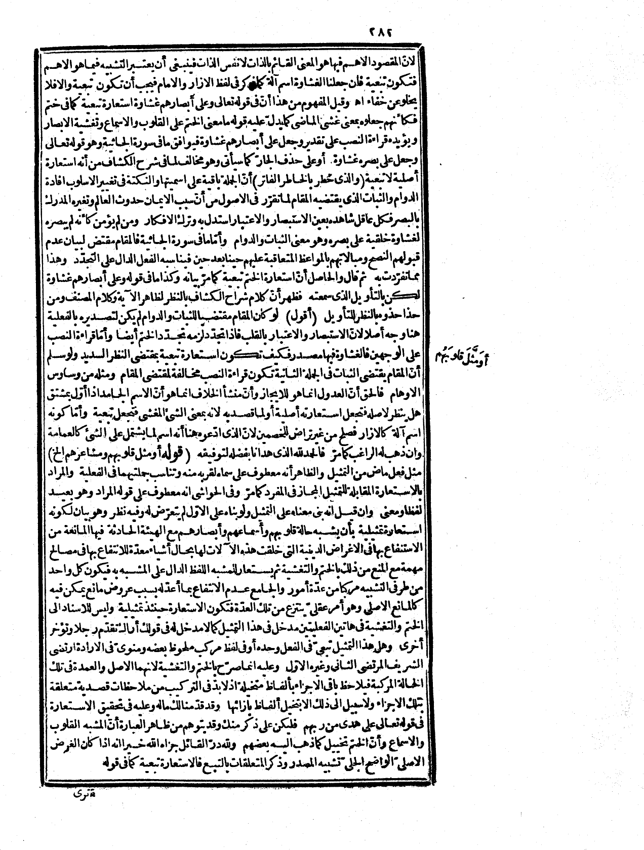 فإنّ حسن التشبيه بحسب الأصالة إنما هو فيمابن هبوب الرياح والقرى لا فيما بين الرياض والضيف أو الإيقاظ والطعام، وإذا كان في المتعلق وذكر الفعل تبعا كما في ينقضون عهد الله، فاستعارة بالكناية لشيوع طشبيه العهد بالحبل، وان كان الأمران على السواء كما في نطقت الحال، فمحتمل إذ كل من تشبيه الدلالة بالنطق والحال بالناطق حسن كما مرّ. قوله: (ومشاعرهم المؤفة إلخ) المشاعر الحواس، وقوله {وَأَنتُمْ لَا تَشْعُرُونَ} معناه لا تدركون بالحواس وهو جمع مشعر بفتح الميم وكسرها لأنه محل الشعور أو آلته إلا أنه لا يعرف في الاستعمال كالجمع، والمؤفة بزنة معونة بفتح فتضم يليه واو ونون وهاء أي التي أصابها ما أفسدها وأبطل إحساسها، وهي اسم مفعول من الآفة بمعنى العاهة أعل إعلال مقولة إلا أنّ فعله لازم وهو آف الزرع إذا اً صابته آفة وقد سمع قعديه في قولهم ايف الزرع بزنة قيل فصيغة المفعول على هذا مقيسة، وعلى ما قبله على خلاف القياس ولذا أنكره بعض اللغويين.