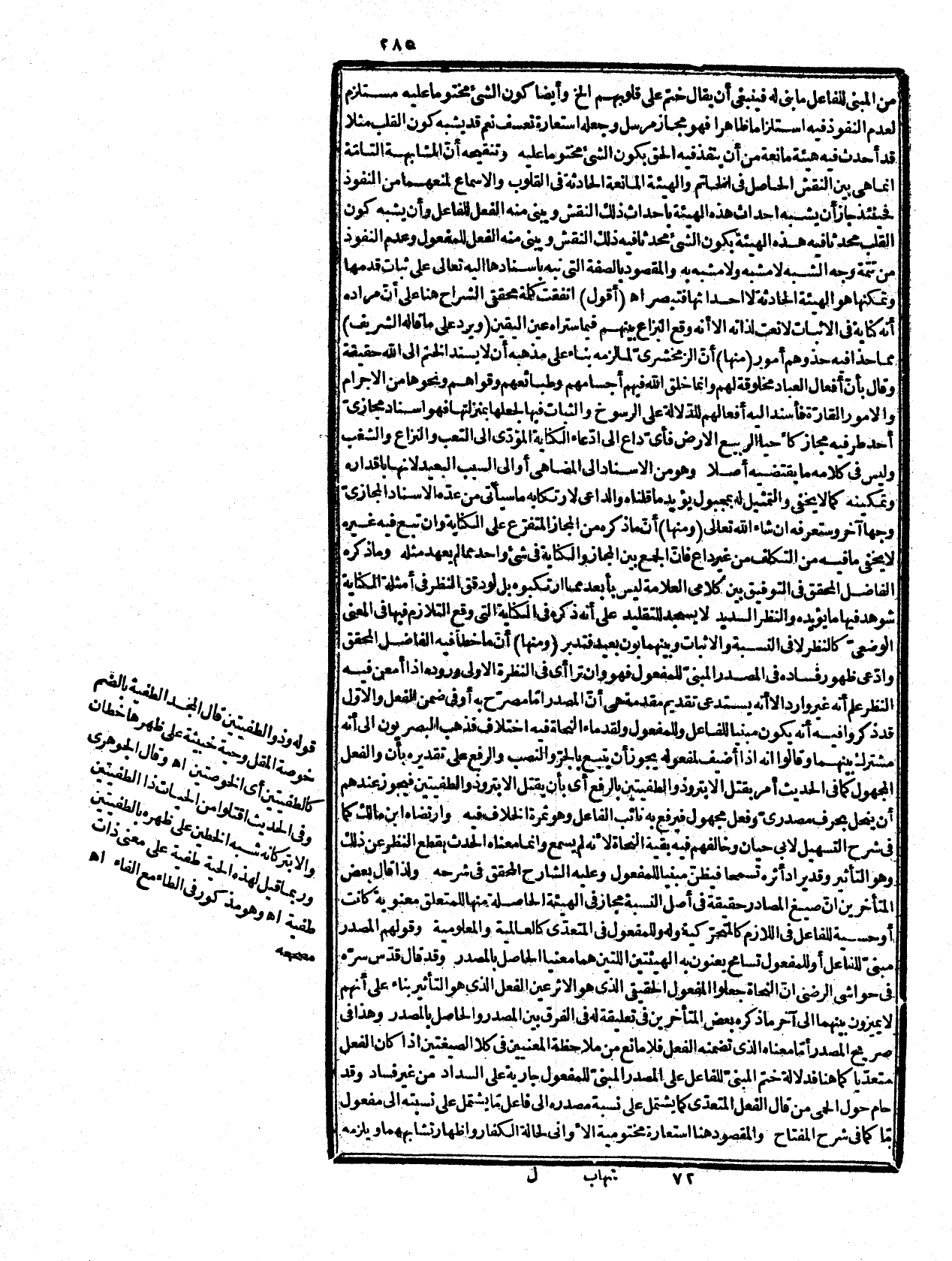 (ومنها) أنّ قوله: إنّ كون الشيء مختوما عليه مستلزم لعدم النفوذ فيه قيقتضي أن يكون مجازاً مرسلاً وجعله استعارة تعسف لا وجه له، لأنّ اللزوم لا بدّ منه في جميع المجازات ألا ترى أنّ استعارة الطيران لشدة العدو استعارة لا شبهة في حسنها، والجامع بينهما السرعة اللازمة للطيران لزوماً ظاهراً ولم يقل أحد أنه ينبغي أن يكون مجازاً مرسلاَ عن السرعة اللازمة له، وكما في النطق والدلالة على ما بين في المعاني. قوله: (شبه بالوصف الخلقي المجبول صليه الم يرد بالتشبيه التشبيه الذي يفاد بنحو الكاف بل الجهة التي راعاها المتكلم حين أعطى الوصف الذي أوجده العبد حكم الخلقي في إسناده إلى الخالق كما تال في دلائل الإعجاز أنّ لشبيه الربغ بالقادر في تعلق وجود الفعل به ليس هو التشبيه الذي يفاد بكأنّ والكاف ونحوهما هانما هو عبارة عن الجهة التي راعاها المتكلم وإذا جاز أن يشبه الفاعل من حيث هو فاعل بالفاعل استلزم أن يشبه فعله بفعله في أمرمّ، وقد ذكر في شرح التلخيص أنّ المجاز الإسنادي ليس بمقصور على ما ذكروه، فأيّ مانع من أن يقصد في الإسناد تشبيه الفعل بالفعل خصوصا إذا تضئن معنى بديعاً، فلو قلت في عدم تحرّك عطيم، وقيامه إلاً إذا غزا فيتحرّك بحركته ما سواه إنما تتحرّك الأرض إذا زلزلت شبهة حركته بحركتها وأسندت ما له إلى محله من غير نظر لتتشبيهه بالأرض، فهنا أيضاً شبه فعل العبد بفعل الله في الثبات والرسوخ، ولم ينظر إلى الفاعل تأدّبا عن تشبيه السيد بعبيده، وإن لزم كما قيل كل ما يصلح للمولى على العبد حرام فبطل ما قيل من أنّ المراد أنه استعارة تبعية شبه إعراضهم عن الحق المانع عن نفوذه بالوصف الخلقي للشيء المانع عما هو مطلوب منه في التمكن والاستقرار، ولم يصرّح بالمشبه بل كنى عنه بالختم المسند إلى الله، وهذا مقتضى عبارة الكتاب، وسقط ما قيل: من أنه مضطرب من وجوه.