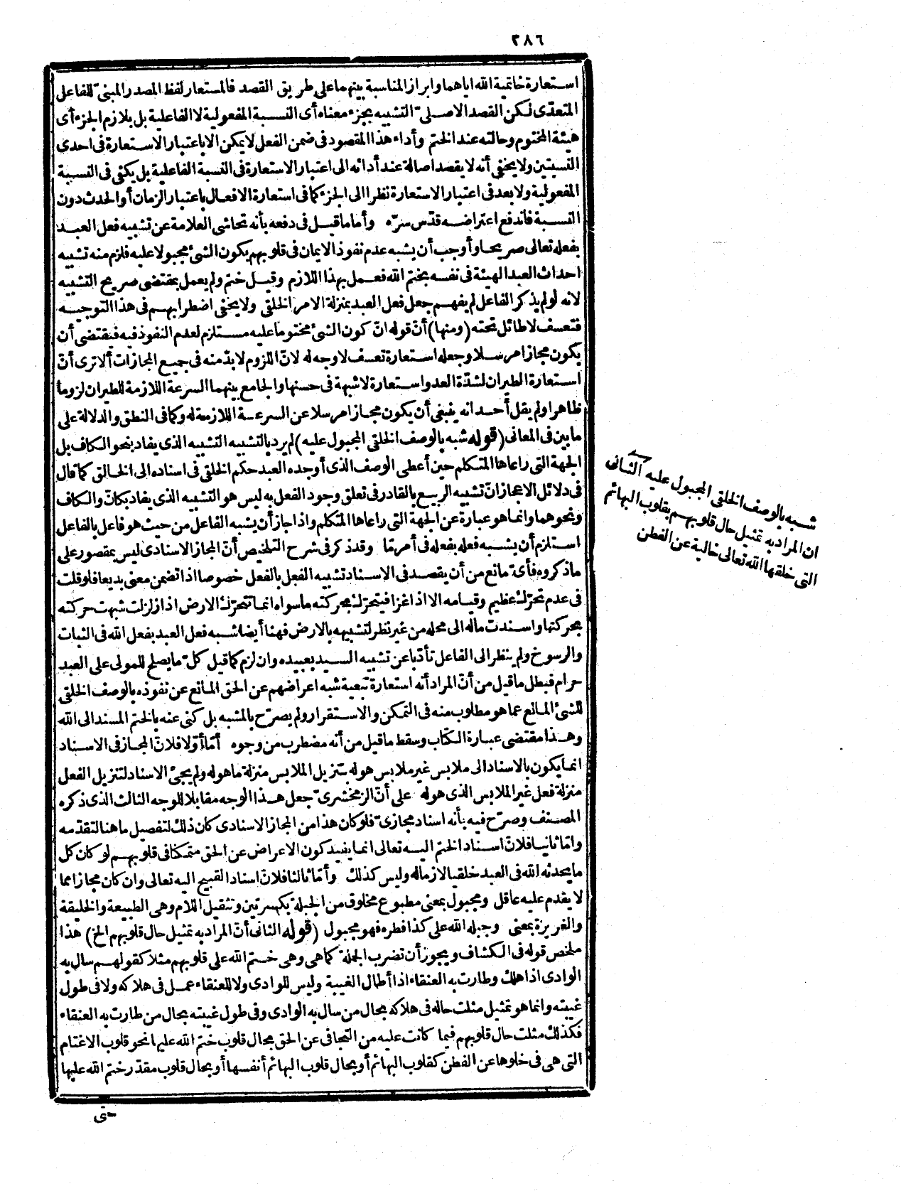 حتى لا تعي شيئاً ولا تفقه وليس له عز وجل فعل في تجافيها عن الحق ونبوّها عن قبوله، وهو متعال عن ذلك اهـ وفي قوله تضرب الجملة إشارة إلى الفرق بين هذا التهثيل والتمثيلى السابق، وهو أنّ العمدة ثمة والتصرّف في الختم وهنا في مجموع الجملة وتحقيقه أنه لما ذهب إلى أنّ القبائح الصادرة من العباد مخلوقة لهم، ولا يجوز صدورها عنه تعالى بناء على قاعدة الحسن والقبح، فلا يجوز حينئذ أن تنسب-قيقة إلى الله تعالى على زعمهم كما فصل قبولاً وردا في الأصلين وشهرته تغني عن ذكره توجه السؤال على إسناده في الآية، فأجاب أولاً بأنه إنما يمتنع حقيقة، وهو هنا إسناد مجازيّ للدلالة على تنزيله منزلة الجبليّ المطبوع عليه، وثانياً بأنه لو سلم إسناده إليه على الحقيقة فليس الختم فيه بالمعنى السابق حتى يلزم المحذوو على زعمهم إذ المراد به خلقهم على فطرة خالية عن الفطنة غير قابلة لانتقاش صور كثيرة من المدركات كالبله المجاذيب، أو البهائم الغلف ومثله مما ينسب إلى الله بالإتفاق لخلقه الذكيّ والأحمق، والمعتزلة يؤوّلون ما يدل على خلقه تعالى للأفعال بجعلها عبارة عن التوفيق، ومنح الألطاف في الحسن والخذلان ومنعها في ضده، ونحو ذلك من إفاضة الاستعداد وعدمها، ثم شبهت حال هؤلاء في الاعراض عن الحق، والإصرار على عدم النظر والإصغاء له بحال أغتام، أو أنعام ختم الله على مشاعرها بخلقها كذلك، فالختم بمعنى ذلك الختم مجاز لكنه مسند إلى الله حقيقة لصدور ذلك المعنى المجازي عنه ومجموع ختم الله مجاز مركب قد تجوّز في بعض مفرداته، ومثله مشهور لا تكلف فيه، أو شبهت حالهم بحال مخلوق لا نعرفه قد ختم الله على قلبه من غير واسطة بطابع حقيقيّ فالاستعارة تمثيلية لا تجوّز في شيء من مفرداتها إلاً أنّ