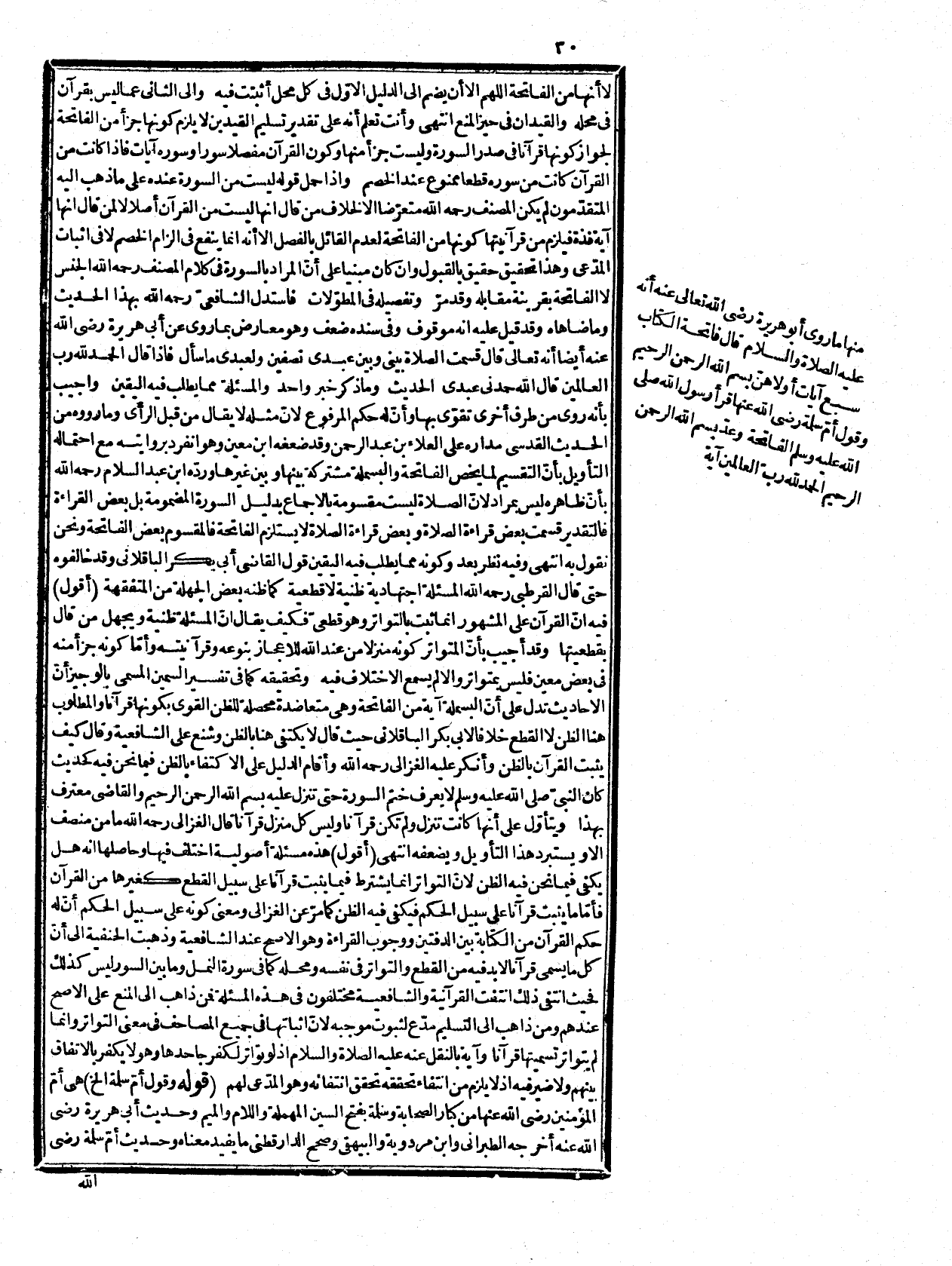 والثاني: من غير جنسها، ويتلو وجوده ذكرها، وهو القراءة، وتلو كل واحد منهما مستلزم تلو الآخر، فصرّح بتلوّ الأوّل ليفهم الثاني مع المحافظة على التجانس، وإنما قلنا إذا أمكنت الرعاية، لأن تسمية الذابح مثلاً لا يتلوها إلا الذبح لتبع وجوده لذكرها، وأمّا المذبوح فلا يتغ ذكرها لا في الوجود ولا في الذكر فلا يستقيم أن يقال ما يتلو التسمية مذبوح انتهى. فإن قلت على تقدير كونها من القرآن أو السورة كيف يتأتى تقدير أقرأ فعل المتكلم وهي متقدمة على قراءة هذا القارىء بل على وجوده وكيف يتأتى أن يقال القراءة قرينة لهذا المقدر، فينبغي أن يقدر اقرؤا من أمر الله للعباد ليتحد قائل الملفوظ، والمقدر، ويكون على نسق ما نطق به التنزيل. قلت: الظاهر أنه على هذا يقدر قبل قراءة كل قارىء ويكون إخباراً منه تعالى عما يصدر من عباده وليس المراد باقرأ متكلما مخصوصا، بل من يصح منه التكلم على حد قوله: {وَلَوْ تَرَىَ إِذْ وُقِفُواْ عَلَى النَّارِ} [الأنعام: 27] وبعد الوقوع ينوي كل بالضمير نفسه كما في الاستفتاح بقوله: " وجهت وجهي " الخ ومن هنا يتبين لك وجه جعل القرينة المقروّ دون القراءة، لأن ذلك القدر اقتضى تقديره في الأزل يدل عليه المقروّ قبل وجود القراءة، فعبر به