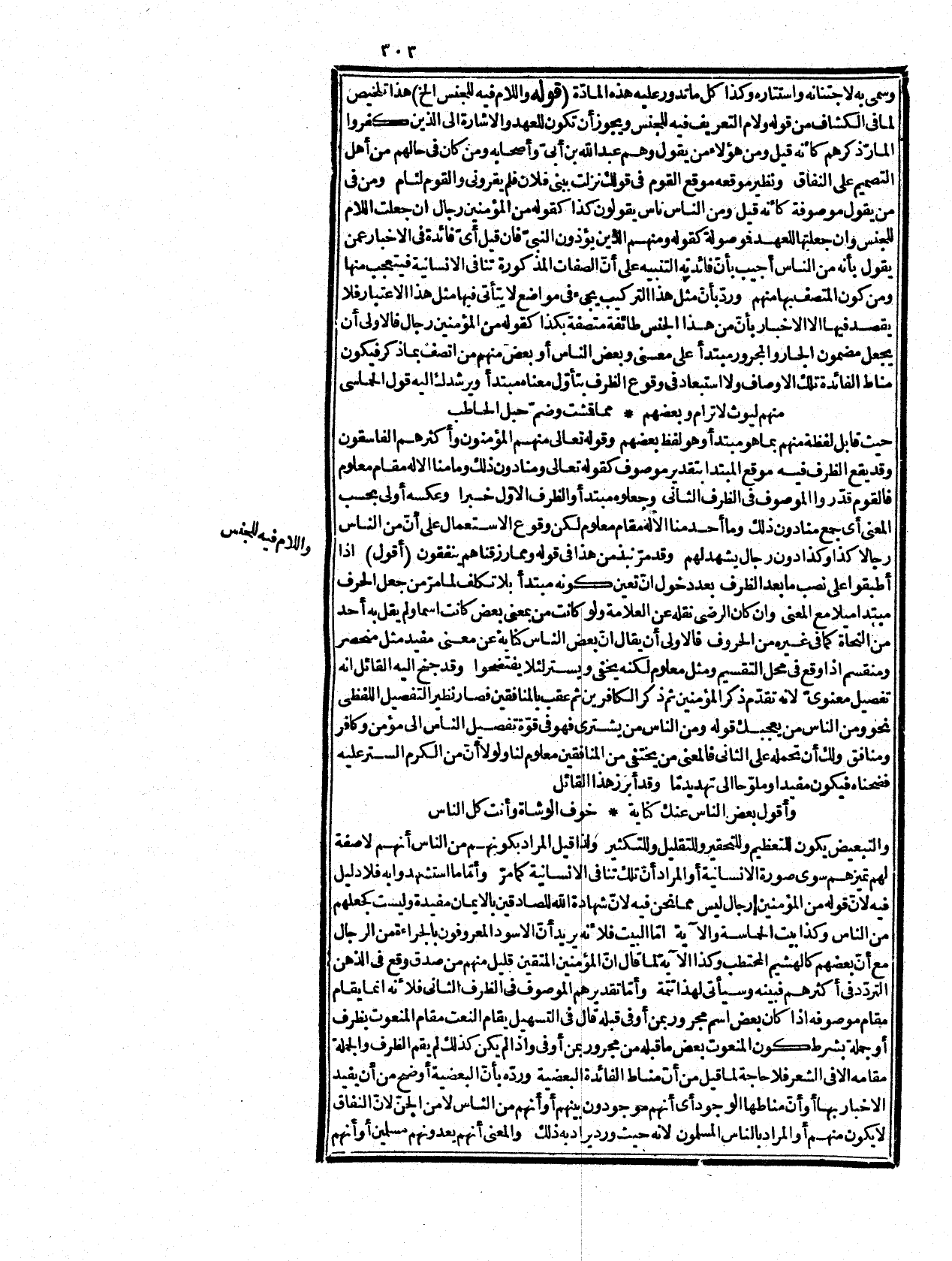 بوجه مّا، وبعض القوم المعينين المعهودين قد يجعل باعتبار حال من أحواله كأهل محلة محصورين فيهم قاتل لم يعلم بعيتهءص نه قاتلاً، وان عرف شخص " فنقول في هؤلاء قاتل لهذا القتيل، ومجيب موجه لما ذكر على وجوه شتى، فقيل: إن هذا هو الأنسب فإذا اقتضاه المقام تعين في كلام البليغ، لأنّ المعرّف بلام الجنس لعدم التوقيت فيه قريب من النكرة وبعض النكرة نكرة فناسب من الموصوفة للطباق، والأمر بخلافه في العهد، ويدلّ عليه وروده على هذا الأسلوب نصاً في القرآن ففي قوله {مِنَ الْمُؤْمِنِينَ رِجَالٌ} لما أريد الجنس جعل بعضهم رجا لاً موصوفين، وفي قوله عز وجل {وَمِنْهُمُ الَّذِينَ يُؤْذُونَ النَّبِيَّ} [التوبة: 61] لما كان مرجع الضمير طائفة معينة من المنافقين قيل الذين يؤذون، وتحقيق السرّ فيه أنّ قولك من هذا الجنس طائفة من شانها كذا يفيد التقييد بالجنس فائدة زائدة، أمّا إذا قلت من هذا الجنس الطائفة الفاعلة كذا فمن عرفهم عرف كونهم من الجنس أو لا وإذا قلت من هؤلاء الفاعل كذا حسن، لأنه زيادة تعريف، ولا يحسن فاعل كذا لأنه عرفهم كلهم إلاً إذا كان غرض في التنكير كستر عليه أو تجهيل، والكلام الآن في الأصل اهـ وتابعه السيد السند مع تمريضه ما حققه في غيره، وكذا الفاضل التفتازاني إلاً أنه استشهد له بكلام للإمام المرزوقي لم يزك شاهده، ثم قال: وقد يقال إنّ العلم بالجنس لا يستلزم العلم بابعاضه، فتكون باقية على التنكير فتكون من المعبر بها عن البعض نكرة موصوفة وعهدية الكل تستلزم عهدية أبعاضه، فتكون من موصولة، وهذا بعد تسليمه إنما يتم بما ذكر من وجه المناسبة، والاً فلا امتناع في أن يعبر عن المعين بنكرة لعدم القصد إلى تعيينه، وفي أن يعين بعض من الجنس الشائع فيعبر عنه بلفظ المعرفة اهـ.