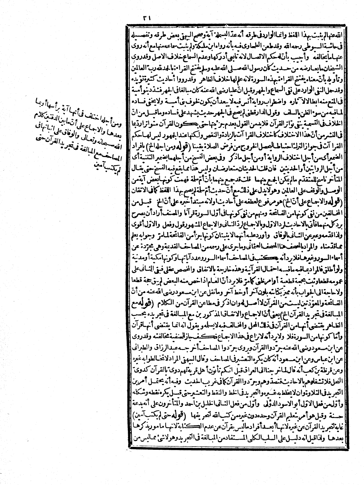 الشاة وإن لم تذبح، فمثله لا يسمى مذبوحا حقيقة، وان أراد بعد تعلق الذبح به، فكونه لا يليه في الوجود غير مسلم إذ المذبوح من حيث هو مذبوح تال له بلا مرية، فإن قلت مقدّرات القرآن هل هي منه حتى يطلق عليها كلام الله أم لا قلت: معانيها مما يدل عليها لفظ الكتاب التزاما للزومها في متعارف اللسان فهي من المعاني القرآنية، وأمّا ألفاظها فليست منه لأنها معدومة، ومنها ما لا يجوز التلفظ به أصلاً كالضمائر المستترة وجوبا، وأمّا جعلها مقدرة فامر اصطلاحي ادّعاه النحاة تقريبا للفهم، فانظره فإنه من الحور المقصورات في الخيام، ثم إنّ في جريان هذا التقدير على القول بأنها آية فذة، ولذا وقف عليها بعض القراء نظر أو بتفسير ما يتلوها بما مر مما قصد جعله تالياً لها، وجعلت مبدأ له، وان كان يقارنه غيره سقط ما قيل من أنّ الذي يتلوها، كما وقع عليه القراءة وقع كثير من الأفعال، ككونه ملفوظا ومحدثا ومؤلفا وغير ذلك، والمراد بقوله: كل فاعل الفاعل الذي جعل التسمية مبدأ لفعله بقرينة السياق لسقوط غيره عن درجة الاعتبار، والمراد بالإضمار معناه اللغوي أي أنّ كل فاعل يتصوّر ما هو بصدده من الأفعال، فالظاهر أن يقدر بحسب الصناعة ما يليق به، فلا يرد عليه ما قيل لا نسلم أنّ كل فاعل يضمر اللفظ المذكور بل يقصد المعنى، وينويه ولا حاجة إلى الجواب: بأن النفس تعوّدت ملاحظة المعاني، وأخذها من الألفاظ حتى تناجي نفسها بألفاظ متخيلة كما نقله السيد عن ابن سينا، وان كان هذا أمراً عقليا وجدانياً لا منطقيا اصطلاحيا كما توهم، ثم اختار مقروّا على متلوّ مع ما فيه من التجنيس حتى قيل: إنّ تقديره أحسن لما فيه من الإبهام المشوس لذهن السامع فما اختاره أظهر، وبمقام التفسير أنسب قوله:) وكذب يضمر الخ) أي كالقارىء الذي يضمر القراءة التي جعلت التسمية مبدأ لها يضمر الخ، وهذا تتميم للفائدة بوضع قاعدة مطردة كلية في تقدير كل متعلق باسم الله، وقد تبع 10 لمصنف في هذه العبارة الزمخشري، وفيها تسامح كما في عامة حواشيه، فإنّ التسمية جعلت مبدأ للفعل الحقيقي كالقراءة والحلول والإرتحال، والمضمر الفعل النحوي الدال عليه فلا بد من تقدير في الكلام في آخره بأن يقدر ما جعل التسمية مبدأ لمعناه أي معنى مصدره، وهو معناه التضمني أو في أوّله بأن يقدر لفظ ما تجعل التسمية مبدأ له وهذا مختار الشريف تبعا للشارح المحقق، وتبعه المحشون للكشاف وهذا الكتاب، وقد قيل عليه إنّ اعتبار الحذف قبل مسيس الحاجة إليه غير مرضي وهنا كما يحتمل أن يكون المراد بكلمة ما في عبارتهم المذكورة المعنى يحتمل أن يكون اللفظ، ووقوعها بعد قوله يضمر الخ يقتضي الثاني، فالأول الحمل عليه بلا تقدير، فإذا جاء قوله ما جعل التسمية الخ مست الحاجة للتقدير فيقدر فيه معنى، ويؤيده أنّ ما جعل التسمية مبدأ له الفعل الحقيقي أي القراءة، والمضمر فعل اصطلاحي، وهو أقرأ والقول بأن أقرأ لفظ للقراءة، كما اقتضاه تقديرهم غير متعارف بخلاف القول بأن القراءة معنى أقرأ