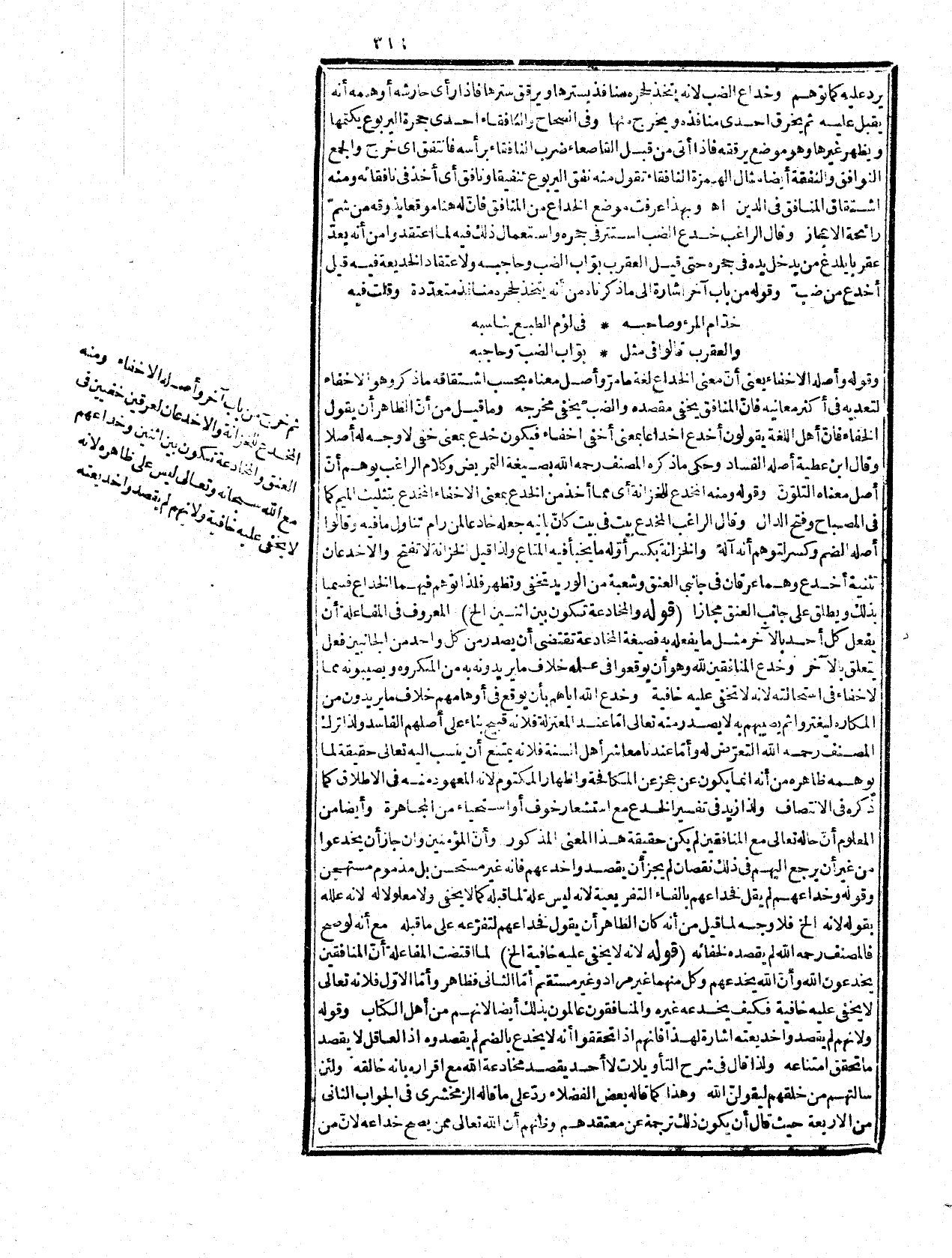كان ادّعاؤه الإيمان بالله نفاقاً لم يكن عارفاً بالله ولا بصفاته، ولا أنّ لذاته تعلقاً بكل معلوم، ولا أنه غنيّ عن فعل القبائح فلم يبعد من مثله تجويز أن يكون الله في زعمه مخدوعا! ومصابا /. بالمكروه من وجه خفيّ، ويجوز أن يدلس على عباده، ويخدعهم لأنه في غاية البعد إذ لا ينكر جاهل علم الله تعالى بجميع الأشياء، حتى المشركون الجاهلون، فكيف يخفى على المنافقين الذين هم من أهل الكتاب، فإن قلت: الحكماء عقلاء وقد ذهبوا إلى أنّ علم الله تعالى لا يتعلق بالجزئيات قلت: الحكماء لا يقولون بهذا، كما نص عليه الطوسي ولو سلم فحينئذ لا يتصوّر الخديعة لأنها فرع العلم بالجزئيات مع ما في. قؤله لأنّ لذته تعالقاً بكل معلوم من! إلاعتزال لإسناده العلم لذاته أ! ماء ففي صفة العلم، فهو من دس السمّ في الدسم، وقد سبقه لهذا بعض المدققين وقال إصابته تعالى بالمكروه للخداع بعيدة جداً إذ في نفافهم اعتراف بعلمه تعالى بالأقوال الظاهرة الجزئية المفضية إلى ما هو تاعث على الخداع من جلب المنافع، ودفع المضار، فلا يتصوّر هذا منهم، وبالجملة ففساد هذا الجواب أظهر من أن يخفى،. ولذا أسقطه المصنف زحمه الله، وان لم يتنبه له بعض أرباب الحواضي. قوله: (بل المراد إما مخادعة رسوله صلى الله عليه وسلّم على حذف المضاف) قيل: إنه نبه بقوله حذف المضاف على أنه لا يصح أن يراد بلفظ الله ورسوله مجازاً، كما هو ظاهر عبارة الكشاف، لأنه لا يصح إطلاق لفظ الله على غيره، ولو " نجازاً كما صرّحوا