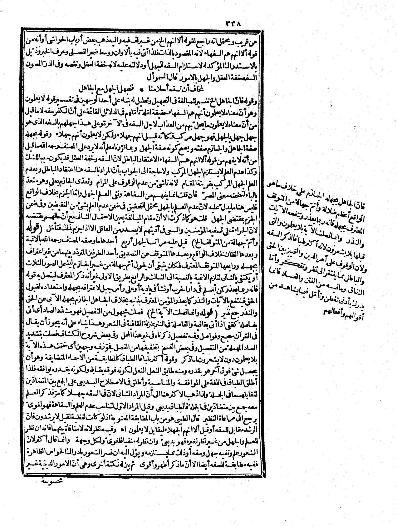 منه في شيء، والثاني لبيان سلوكهم مع المؤمنين ومع شيعتهم، وهما أمران مختلفان، يكن هذا لم يلزم تكرار أيضا، لأنّ المعنى ومن الناس من يتفوّه بالإيمان نفاقا للخداع، لتفوّ. عند لقاء المؤمنين، وليس هذا بتكرار لما فيه من التقييد وزيادة البيان وأنهم ضموا لحداع الاستهزاء، وأنهم لا يتفوّهون بذلك إلا عند الحاجة، وقد قيل أيضاً إنّ المراد آمنا أوّلاً الإخبار عن أحداث الإيمان، وهنا عن احداث إخلاص الإيمان وهذا ما ارتضاه وأيده بأنّ الإقرار اللساني كان معلوما منهم غير محتاج للبيان، وإنما المشكوك ص القلبي، فيجب إرادته هنا، وقولهم للمؤمنين يقتضي ما يظهرونه لشياطينهم من د! م الصادر عن صميم القلب، فيجب أن يريدوا بما ذكروه للمؤمنين التصمديق القلبي أيضا، بعضهم كلام المصنف رحمه الله عليه، وقال: إنه لا ينافيه ما سيأتي من أنهم قصدوا