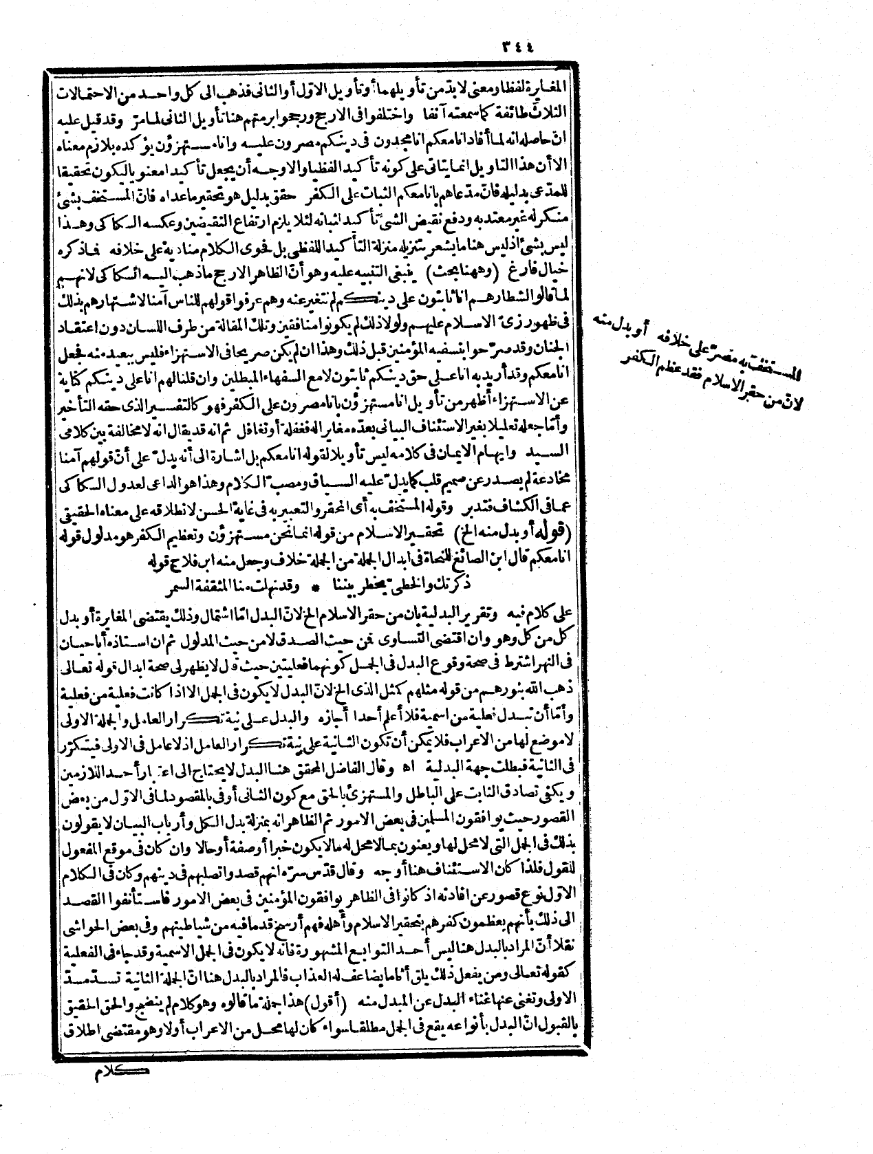 ومنها أنّ قول الفاضل المحقق أنّ البدل لا يحتاج إلى اعتبار أحد اللازمين بخلاف التاكيد السابق ممنوع أيضا لأنا قد بينا لك أوّلا أنهما متغايران متباينان بحسب الظاهر، فلا تتأتى البدلية المعتبرة فيه بدون الاتحاد كلا أو جزءاً أو اشتمال أحدهما على الآخر وتحقير الإسلام وتعظيم الكفر إن لم يتحدا فأحدهما متضمن ومستلزم للأخر كما لا يخفى، ولهذا اتفق الشيخان على تأويله بما ذكر.
