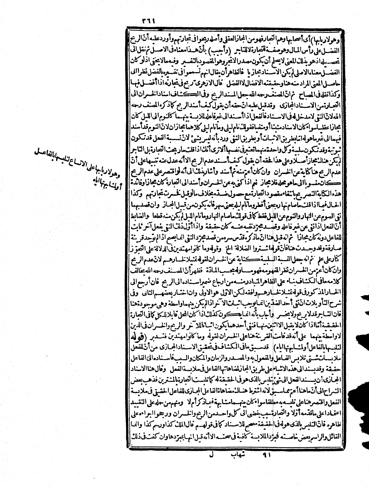 عن عبد القاهر: إنه ليس المراد بالمشابهة بين الفاعلين المشابهة التي تبتني عليها الإشتعارة بل الجهة التي راعاها المتكلم حين أعطى أحدهما حكم الآخر، والظاهر أنها هي الملابسة بعينها، ثم إنه قال إذا أسند فعل الأمير إلى بعض خواصه لم يبعد أن يقصد هناك المبالغة في تشبيهه بالأمير حتى كأنه هو، وهذا مناف لما ذكره هنا وان أمكن التوفيق بينهما فتدبر. قوله: (من حيث أنها) أي التجارة المسند إليها الربح المنفي الذي هو هنا كناية عن الخسران فيصح إسنادهما إليها لأنها سبب لهما باعتبار وقوعهما فيها إذ لولاها لم يتحققا فعلى هذا لو كان مال التجارة مشترى به رقيق جاز إسناد الربح له مع القرينة فيصح أن يقال ربح عبدك، وخسرت جاريتك على الإسناد المجازي واحتمال كون العبد والجارية بنفسهما ربحا أو خسراً للإذن لهما في التجارة لا يضرّ مع وجود القرينة الصارفة فلا وجه لإنكاره إلأ أن يقال إنه أنكر حسنه فهو ممتنع في عرف البلغاء، والبلاغة فله وجه وجيه. قوله: الطرق التجاوة فإنّ المقصود إلخ) هذا ما في الكشاف بعينه، وقال الشارح المحقق: إنه بيان لوجه الجمع بين عدم ربح تجارتهم، وعدم اهتدائهم بالواو وترتيبها على اشتراء الضلالة بالهدى بالفاء مع أنّ عدم الإهتداء تكرار