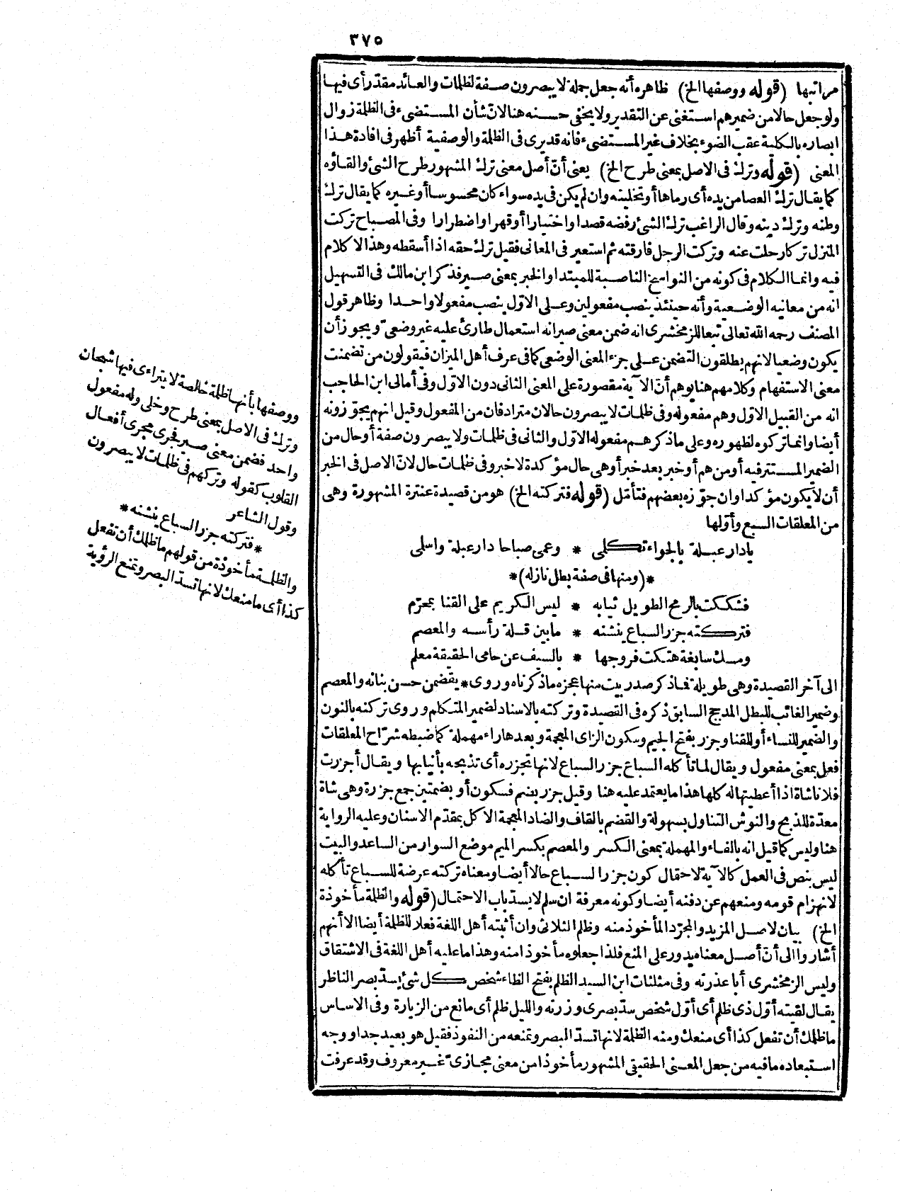 في ظلمة إنطفأ ضوحمه، وظلمة الليل والغمام المطبق لزم أنّ لهم ظلمات متعددة أو ظلمة شديدة بمنزلتها، وفيه نظر وقيل إنه على هذا بتقدير مضاف أي مثل ظلمات، والسرمد الدائم كالسرمدي والمتراكم الواقع بعضه فوق بعض، وقوله فكأنّ الفعل غير متعذ أي نزل منزلة اللازم لطرحه نسيا منسياً، ولعدم القصد إلى مفعول دون مفعول فيفيد العموم. قوله:! (مثل ضربه الله إلخ) في الكشاف على ما قرّره شراحه أربعة أوجه بناء على أنّ التشبيه مركب، أو مفرّق وعبارته المراد ما استضاؤوا به قليلا من الانتفاع بالكلمة المجراة على ألسنتهم ووراء إستضاءتهم بنور هذه البلمة ص ظلمة النفاق التي ترمي بهم إلى ظلمة سخط الله، وظلمة العقاب السرمدي، ويجوز أن يشبه بذهاب الله بنور المستوقد إطلاع الله على أسرارهم، وما افتضحوا به بين المؤمنين، واتسموا به من سمة النفاق، والأوجه أن يراد الطبع لقوله {صا صُمٌّ بُكْمٌ عُمْيٌ} وفي الآية تفسير آخر وهو أنهم لما وصفوا بأنهم {اشتروا الضلالة بالهدى} عقب ذلك جمهذا التمثيل ليمثل هداهم الذي باعوه! بالنار المضيئة ما حول المستوقد والضلالة التي اشتروها، وطيع بها على قلوبهم بذهاب الله بنورهم، وتركه إياهم في الظلمات، وفي المفتاح وجه تشبيه المنافقين بالذين شبهوا بهم في الآية هو رفع الطمع إلى شيء مطلوب بسبب مباشرة أسبابه القريبة مع تعقب الحرمان والخيبة لإنقلاب الأسباب وأنه أمر توهمي كما ترى منتزع من أمور جمة، وللشراح في كون السؤالي عن وجه الشبه أو عن المشبه كلام لا مساس له بكلام المصنف رحمه الله لعدم ذكره لمنشئه ومبناه، وتقرير ما في الكشاف إنه شبه إجراء كلمة الشهادة على ألسنتهم، والتحلي بحلية المؤمنين ونحوه مما يمنع من قتلهم، ويعود عليهم بالنفع الدنيوي من الأمن! والمغانم ونحوها وعدم إخلاصهم لما أظهروه بالنفاف الضار في الدارين بإيقاد نار مضيئة للإنتفاع بها هبت عليها، الرياح والأمطار وأطفأتها، وصيرت موقدها في ظلمة وحسرة، وهذا معنى قوله المراد صا إستضاؤوا به إلخ أو النور والاستضاءة ما أظيس وه من الإسلام بإجراء الكلمة أيضاً وظلمته إقتضاحهم وظهور نفاقهم، وهذا معنى قوله ويجوز إلخ أو النور الإيمان والإسلام المتحلين بحليتهما، وظلمته طبع الله- على قلوبهم الذي صيرهم صما عميا وهذا هو الوجه الثالث أو النور الهدى الذي تمكنوا منه، أو فطروا عليه والظلمة الضلالة المشتراة ويجري في هذا كله التفريق والتركيب كما سيصرّح به مع ترجيحه للتركيب فالوجوه أربعة مضروبة، في إثنين فهي ثمانية، وهذا هو الذي إرتضاه الشريف المرتضى حيث قال: إنه إشارة إلى تركيب وجه الشبه وأنه منتزع من أمور متعددة في المشبه، وأما إنتزاعه من متعدد في المشبه به فمما لا شبهة فيه، ولا يخلو كلامه من تلويح إلى