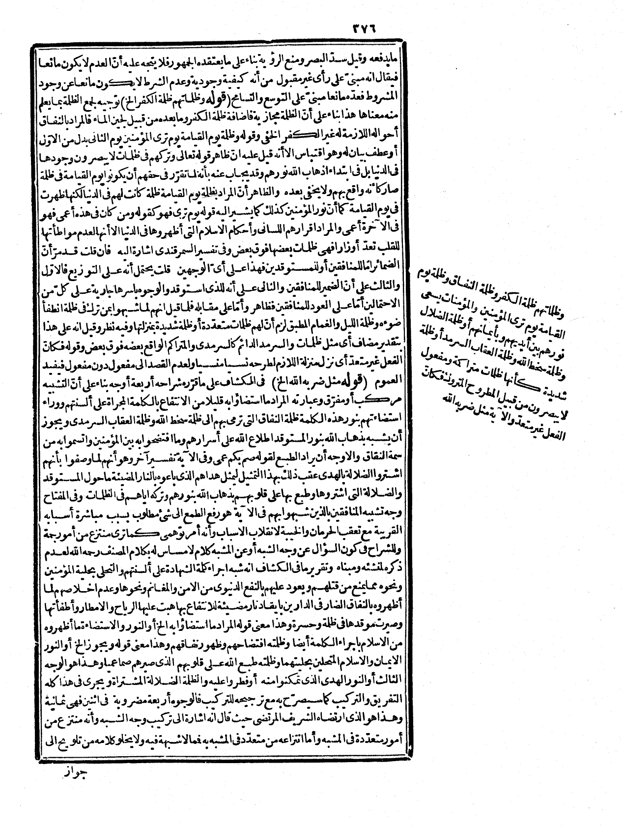ولفظ المثل هنا إن نظر إلى ظاهره فهو تشبيه مفرد بمفرد كقولنا الدنيا خيال باطل، وان نظر إلى ما اشتملا عليه كان تشبيه مركب بمركب بحسب الظاهر ويجوز أن يعتبر فيه التفريق على اللف والنشر الإجمالي فإن رجح هذا لم يمنع الأوّل، ولا يخطأ من ذهب إليه، فإن قصد الفاضل ردّ قوله إنه تشبيه مفرد بمفرد لم يسمع منه، وان ذهب الشرّاج إلى خلافه وأمّا ما تعجب منه
