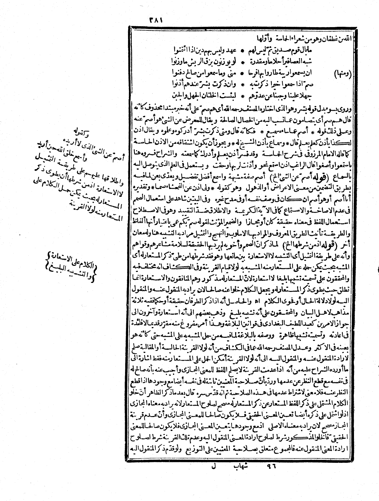 عدمت القرينة لا يصلح اللفظ للمعنى المجازي، وأجيب عنه بأنه صالح له في نفسه مع قطع النظر عن عدمها، وردّ بأنّ صلاحية المعنيين ثابتة له في نفسه أيضا مع وجودها إذا قطع النظر عنه فلا معنى لإشتراط عدمها في هذه الصلاحية، ثم إنه قدس سرّه قال: بعدما ذكر الظاهر أن خلو الكلام المشتمل على ذكر اللفظ المستعار عن ذكر المستعاو له مصحح لصلوج المستعار لأنه يراد به معناه المجازي إذ لو اشتمل على ذكره أيضاً تعين المعنى الحقيقي فلا يكون صالحا للمعنى المجازي، وأنّ عدم قرينة المجاز مصحح لأن يراد به معناه الأصلي، إذ مع وجودها يتعين المعنى المجازي فلا يكون صالحا للمعنى الحقيقيّ فالخلو المذكور شرط لصلوج إرادة المعنى المنقول إليه، وعدم تلك القرينة شرط لصلوح إرادة المعنى المنقول عنه فالمجموع متعلق بصلاحية المعنيين على التوزيع، ولو قدم ذكر المنقول إليه كان أولى، وقد يقال كون الكلام مع عدم القرينة صالحا لإرادة المعنى المجازي مبني على ادعاء دخول المشبه في جنس المشبه به حتى كأنه من أفراده فيصلح له لفظه كما يصلح لإفراده الحقيقية واشتراط نفي القرينة إنما هو لصلوج إرادة المعنى الحقيقي، ويرد عليه أنه يلزم أن يكون للخلو عن ذكر المستعار له مدخل في الصلاحية المذكورة إلا أن يجعل عبارة عن ذلك الإدعاء، ولإخفاء في بعده عن الإفهام جدا، ثم إن الكلام وان كان ظاهرا في الاستعارة المصرحة إلا أنهم أدخلوا فيه المكنية بناء على مذهب الزمخشري فيها، والمصنف رحمه الله تبعه كما سيأتي تحقيقه في تفسير قوله تعالى {يَنقُضُونَ عَهْدَ اللَّهِ مِن بَعْدِ مِيثَاقِهِ} [البقرة 27] فلا حاجة إلى السؤال والجواب المذكورين في شروح الكشاف واعترض عليه بأنه ليس في عبارة المصنف ما يدل على مدخلية الخلو في الصلاحية بل يدل على اشتراط تلك الصلاحية مع الخلو في حقيقة الاستعارة، ثم إنه لا يخفى أن الاية من قبيل قولنا الحال ناطقة، وهذا لا يحتمل التشبيه بل هو استعارة تبعية، لا يقال ي! عل الصم البكم العمي من قبيل الأسماء فهو من التشبيه لأنا نقول يبقى الكلام في مثل جعلناهم حصيدا خامدين حيث صرح المصنف فيه بالتشبيه، ويمكن أن يقال إنه بتقدير لفظ مثل أي مثل صم فيصير تشبيها وإن لم يقدر فهو استعارة فالكلام يحتمل كليهما فلا يتم طي ذكر المشبه بالكلية في الاستعارة التبعية، ولذا لم يشترط صاحب المفتاح في الاستعارة طي ذكر المشبه على الاطلاق أقول: هذا زبدة ما هنا من القيل والقال، والذي يميط عن وجهه نقاب الاشكال أن ما ذكره الفاضل المحقق تبعا للطيبي ومن مشى على أثره من الشراح كلام لا غبار عليه، وما أورده عليه من أنه يلزم أن لا يكون للخلو عن ذكر المستعار له مدخل في الصلاحية المذكورة غير مسلم فإنه إذا ادعى أن للأسد فردين متعارفا، وهو معروف وغير متعارف وهو الشجاع كان صالحا لكل منهما في نفسه فإذا لم يخل عنه الكلام، فقد صرح بأحد فرديه فيه فيدل على أنه المراد منه إذا حمل عليه مثلاً لئلا يحمل فرد على غيره فإذا خلا عته كان صالحا لكلى منهما، فالخلو شرط لصحة الادعاء والشمول لهما لا أنه عبارة عنه كما قاله واستبعده ولا