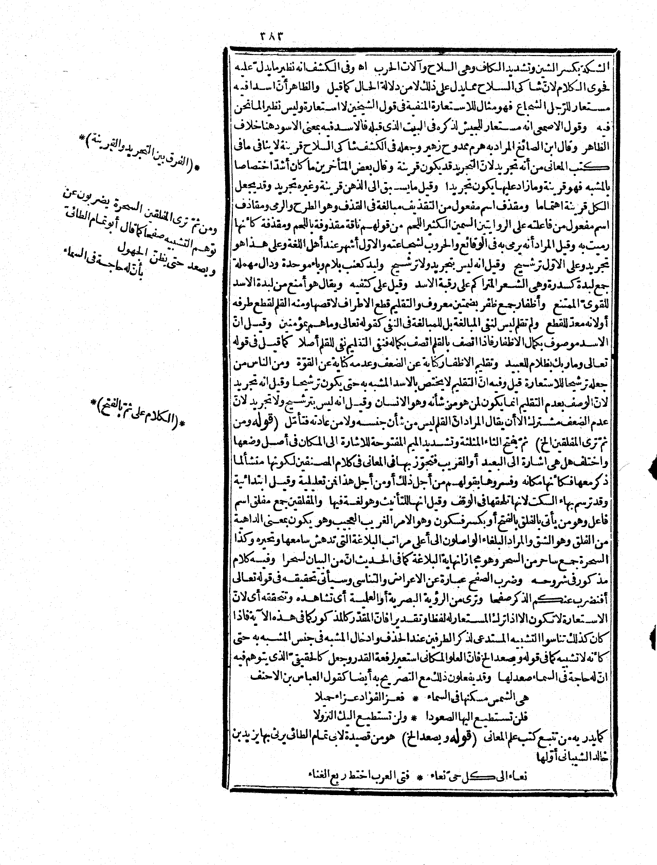 الآية الكريمة فهو في حكم المنطوق، وفي ذكر البيت إشارة إلى أنه لا ينافي التشبيه أن يذكر بعد المشبه به ما يشعر بأنه ليس بمعناه الوضعي كقوله عليّ هنا، وفي الحروب المتعلق بنعامة، وغزالة ممنوع من. الصمرف لأنه علم إمرأة رجل من الخوارج سث! هور يقا! ل ل! شبيب، وكان الحجاج قتله فلما أتى خبره لامرأته وكانت من الشجاعة بمنزلة عجيبة لم يعهد مثلها في النساء لبست درعا وتققدت بسيف ورمح وركبت في ثلاثين فارسا من الشجعان الخوارج، وكانت نذرت أن تغزو الحجاج بالبصرة نهارا وتصلي في جامعها بسورة البقرة ففعلت ذلك، وبالبصرة أكثر من ثلاثي! ألف مقاتل، وهرب الحجاج منها ولم يبرز فلمح في هذا الشعر لقصتها وعير الحجاج بها، والنعامة طائر معروف بالجبن وشدة الهرب، والفتخاء المسترخية الجناحين اللينة المفاصل وهو من صفاتها والصفير صوت بغير حروف، والصافر الريح أو كل مصوّت والظاهر الثاني، وكررت بمعنى رجعت ويروى برزت بدله، والوغى أصله الأصوات المرتفعة المختلطة وبه سمي الحرب وهو المرادء وغشيت بمعنى نزلت وحفلة مرّة الحفل من قولهم رجل ذو حفل أي مبالغ فيما يفعله والمعنى ذات حفلة كما في الكشف، والتشبيه بأمس الدابر أي الماضي في العدم حقيقة أو حكماً وكون قلبه في جناحي طائر من بليغ الكلام وبديعه لأنه عبارة عن ذهابه فارا وقلبه في غاية الخفقان من شدة خوفه، وهذا لا يدرك حسنه إلاً من رزقه الله ذوق حلاوة العربية، وهو تصوير لفراره مرعموبا وفي الكشف فتخاء من باب التصوير كيقولون بأفواههم وقال بعض المتأخرين: كما رأيته بخطه بل هو لبيان وجه الشبه على طريق الإشارة لترتيب، 1 لحكم على المشتق وفيه نظر، وفتخاء بفاء ومثناة فوقية وخاء معجمة ممدوداً.