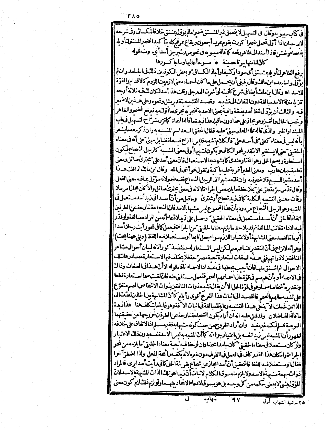 رأيت أسداً يرمي رجلاَ شجاعا يرمي وظهر عدم الفرق بينهما فيما يتعلق بالغرض إلاً أنّ سوق هذا لإثبات الرؤية لتلك الذات، وهذا الإدعاء الإتحاد بينهما، وقيل أيضاً إنّ الشجاع في قوله كالرجل الشجاع قيد للمشبه لا جزؤه حتى يكون المشبه مركباً فليس بمناف لقولهم إنّ الشجاعة خاوجة عن الطرفين مع أنّ الحق أنّ الشجاعة ليست قيدا أيضاً لشيء من الطرفين لأنّ المقصود نقل الشجاعة الكاملة من المشبه به إلى المشبه، والظرف متعلق بمضمون الكلام بحسب المآل أي مجترىء كامل، وقى عليه نعم المتبادر من العبارة تعلق الظرف بالمشبه على وجه القيدية بل بالمشبه به على تقدير التشبيه لا الاستعارة.