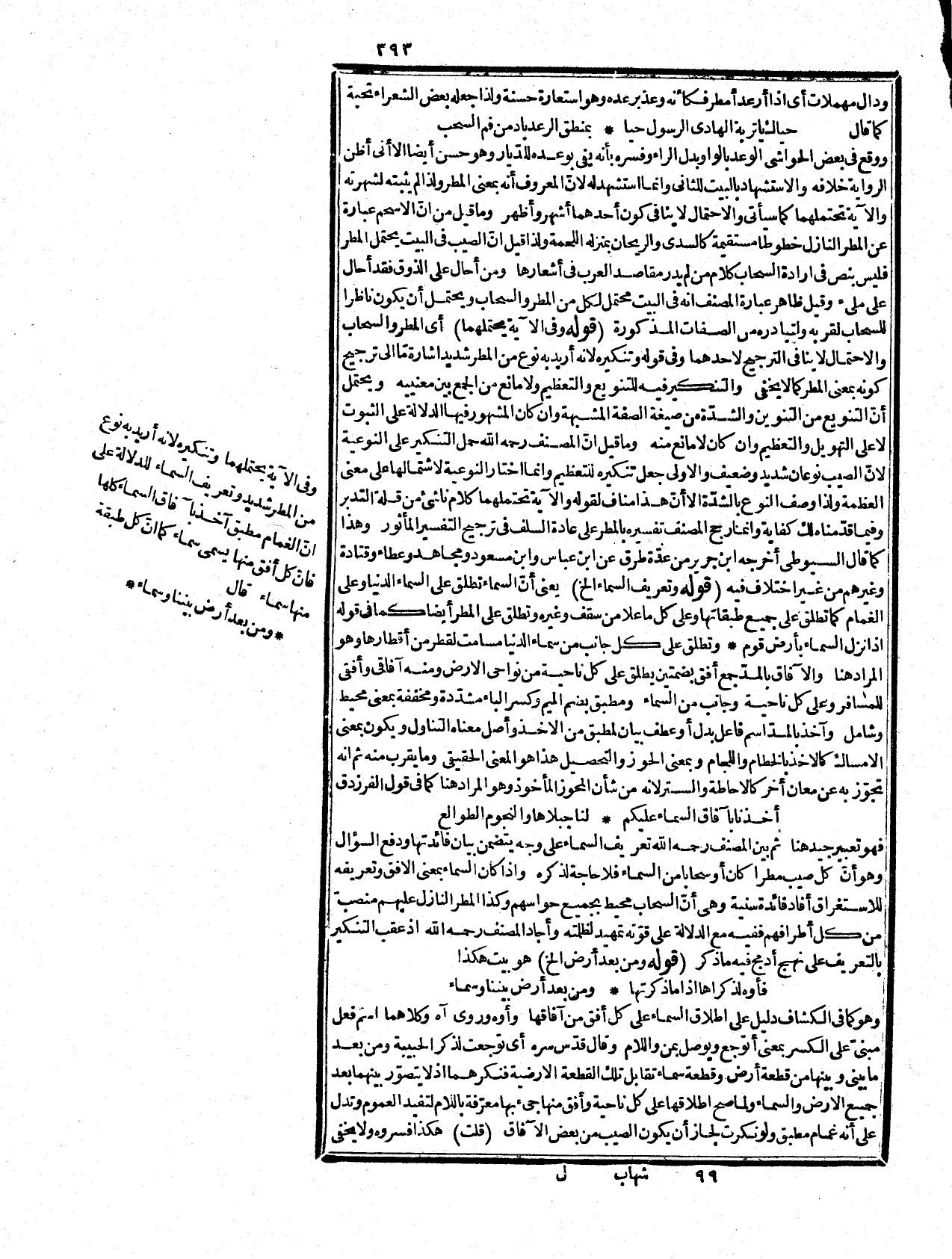 وأمّا تباعد ما يقابلها من السماء ففي غاية البعد عن مواطن الاستعمال، وما ذكروه معنى لا حاصل له، فالظاهر أنّ هذا جار على ما عرف في التخاطب إذا وصفوا الشيء بغاية التباعد يقولون بي! نهما ما بين السماء والأرض فأصله ومن بعد كبعد أرض وسماء فاقام المشبه به مقام المشبه مبالغة، وأمّا ما قيل من أنه إنما ذكر سماء مع أنه لا يزيد على ما أفاده بعد الأرض لأنه كما تكون موانع الوصول من الأرض تكون من السماء كشدة البرد، والحرّ والأمطار فبعده عن السياق بعد ما بين السماء والأرض. قوله: (أمذ به ما في صيب إلخ) خبر آخر لقوله تعريف السماء، وأمد بمعنى قوّى وأكد كما مرّ في قوله تعالى: {وَيَمُدُّهُمْ فِي طُغْيَانِهِمْ} وقوله (من المبالنة إلخ) بيان لما في صيب لأنّ تعريفه يفيد المبالغة بإطلاقه على جميع الأقطار كما سمعته آنفاً، وصيب يفيد مبالغة باصله أي مادّة حروفه من الصاد المستعلية، والياء المشدّدة والباء الشديدة الدالة على شدة نزوله، والبناء بمعنى البنية والصيغة لأنّ فيعل صفة مشبهة مفيد للثبوت، والدوام المستلزم للكثرة فسقط ما توهم من أنّ الثبوت لا يدل على المبالغة كما أشرنا إليه، وتنكيره دال على التهويل والتكثير، وقوله وقيل المراد بالسماء السحاب أشار بتمريضه إلى أنّ المرضيّ عنده تفسيره بالمطر كما مرّ، وقوله واللام لتعريف الماهية أي على هذا، وليس المراد بالماهية الحقيقية من حيث هي بل في ضمن فرد مّا وهو العهد الذهني، وإنما تعين على هذا لأنه لم ينزل من جميع السحاب ولا من سحاب معين، ولا يصح قصد الأوّل إدّعاء للمبالغة كما في جميع الآفاق لأنه لا يخفى ركاكة أن يقال نزل ليهم مطر شديد من جميع السحاب دون من جميع الآفاق والنواحي فلا حاجة إلى ما قيل من أنّ المصنف ضرب على هذا بقلمه، وما يتوهم من أنّ المراد بالط هية، والحقيقة ما يشمل الاستغراق حتى لا ينافي ما مرّ فخبط بما لا يخفى فساده فتأمّل، وما قيل: من أنّ قوله من السماء يبطل ما قيل من أنّ السحاب يأخذ ماءه من البحر أو أنّ ماءه يكون من أبخرة متصاعدة من الأرض في الهواء لأنّ نزوله من جهة السماء لا ينافي شيئا مما ذكر، ولذا تركه المصنف. قوله: (إن أريد بالصيب المطر الخ) الإضافة في ظلماته لأدنى ملابسة لا بمعنى في وتكاثفه بتتابع القطر لأن تلاصق القطرات وتقاربها يقتضي قلة تخلل الهواء المنتشر المستنير، وظلمتة بسحمته وسواده لأنه لا ظلمة له في نفسه كالمطر، وقوله مع ظلمة الليل أي منضمة إليها ولم يقل وظلمة الليل لأنها ليست في المطر بل الأمر بالعكس، ثم إنّ الظرف بينه وبين المظروف ملابسة تامّة فاستعيرت الأداة الدالة على تلك الملابسة لمطلق الملابسة الشاملة للسببية، والمجاورة وغيرهما فلا يتوهم أنه جمع فيه بين معنيين أو معان مجازية، والأحسن أن يقال إنها بمعنى مع كمال في قوله تعالى {ادْخُلُواْ فِي أُمَمٍ} [الأعراف: 38] فإنه أحد معانيها ال مذكورة في المغني وغيره، ولك أن