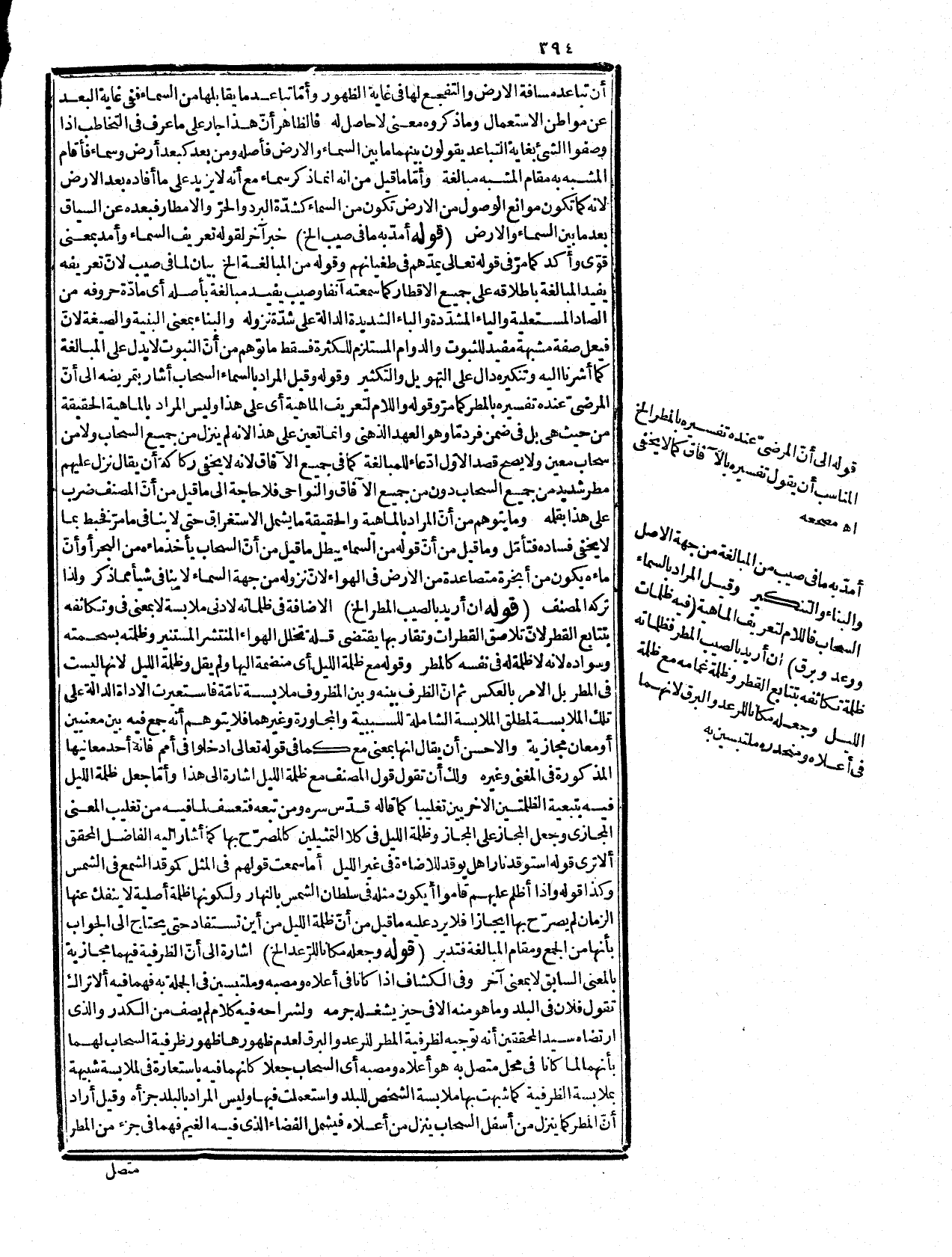 متصل بالسحاب كالشخص في جزء من البلد وهذا أقرب إلى المثال وذاك إلى عبارة الكتاب، وقد تبع فيه الشارح المحقز،، وترك ما فيه من أنّ من الناس من ذهب إلى أنّ المراد بالبلد جزؤه، وزعم أنّ الأعلى والمصب جزء من المطر وليس بذاك، ومنهم من جعله من إطلاق أحد المجاورين على الآخر والأعلى والمصب سحاب والتمثيل لمجرّد التلبس، ولمجاورة ورد بأنه يكون المعنى حيحئذ في السحاب رعد وبرق لا في المطر على ما هو المطلوب.