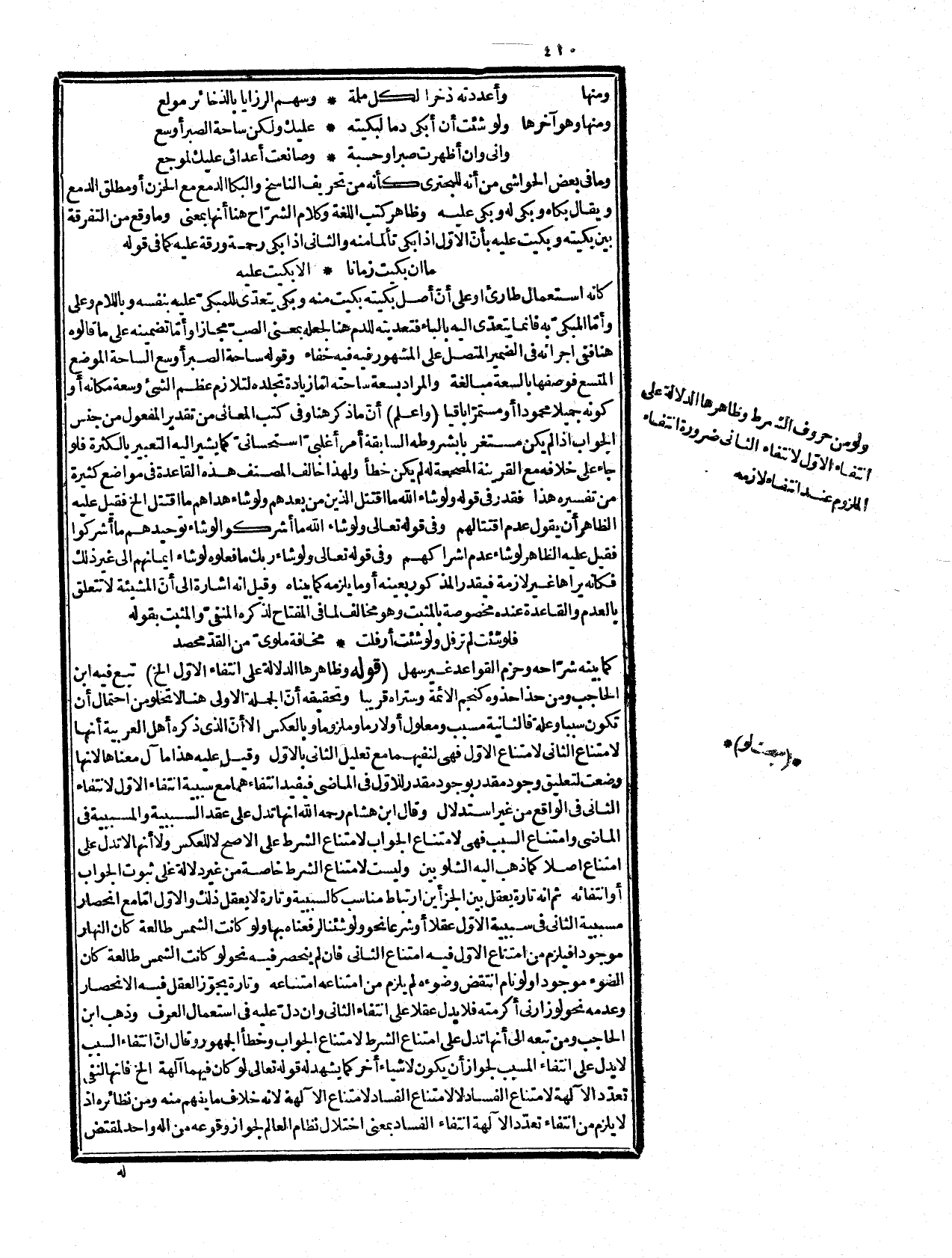 له، وقال بعض المحققين دليله باطل، ومدعاه حق لأنّ الشرط النحوي أعمّ من أن يكون سبباً نحو لو كانت الشمس طالعة كان العالم مضيئا أو شرطا نحو لو كان لي مال حججت أو غيرهما، وأمّ الثاني فلأنّ الشرط ملزوم والجزاء لازم وانتفاء اللازم يوجب انتفاء الملزوم دون العكس فوضعها ليكون جزاؤها معدوم المضمون فيمتنع مضمون الشرط الملزوم لامتناع لازمه، وهو الجزاء فهي لامتناع الأوّل لامتناع الثاني فيدل انتفاء الجزاء على انتفاء الشرط، ولهذا قالوا في القياس البرهاني إنّ رفع التالي يوجب رفع المقدم دون العكس كما ارتضاه الفحول، وقال المحقق التفتازاني في شرح التلخيصى نحن نقول ليس معنى قولهم لو لإمتناع الثاني لامتناع الأوّل إنه يستدل بامتناعه على امتناعه حتى يرد أنّ