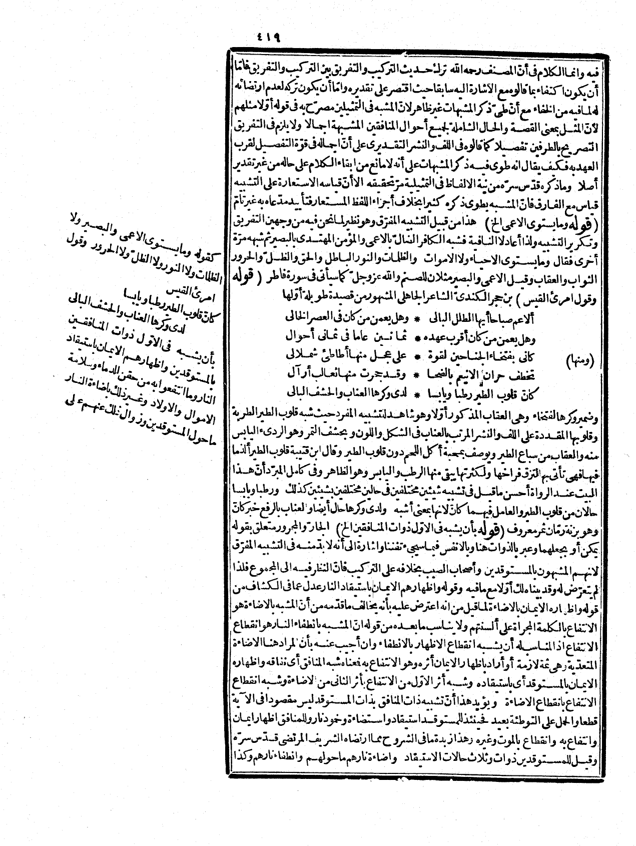 ظهر لك بلا اشتباه أنّ إظهار إيمانه في لحقيقة بدلالة الكلمة المجراة لا أنه نفسها، والمشبه بالإيقاد حقيقة إجراء الكلمة، فالمشبه بالإضاءة إظهار الإيمان كما في الكشاف، إلا أنه لقرب الإيقاد من الإضاءة وتلازمهما يجوز أن يقال شبه إظهار الإيان بالإيقاد، والانتفاع بالإضاءة، وان كان استضاءة لأنهما كشيء واحد كما قيل في التعليم والتعقم، فسقط ما أورد على المصنف رحمه الله في الإطفاء والانطفاء، والعجب مما توهم من منافاة قول الزمخشريّ هنا شبه إظهار الإيمان بالإضإ ءة لقوله: أوّلاً المراد ما استضاؤوا به قليلاً من الانتفاع بالكلمة المجراة على ألسنتهم، وبين الاستضاءة والإضاءة بعد ما بين المشرقين، والباء في قول المصنف رحمه الله بإهلاكهم سببية متعلقة بزوال، وفي قوله بإطفاء متعلقة بيشبه السابق لا بمثله مقدرا ولا بإبقاء. قوله: (وفي الثاني أنفسهم بأصحاب الصيب إلخ) معطوف على قوله في الأوّل، وأنفسهم بالرفع معطوف على قوله ذوات أ، ئب فاعل يشبه المجهول، وبأصحاب معطوف على قوله بالمستوقدين، وأصحاب إشارة إلى ذوي المقدّر، وقوله حذراً إلخ، لنكايات جمع نكاية من نكأت بالهمز، ونكيت معتل الآخر وهي ما يؤلمهم ألماً شديدا، وطرق يطرق من باب كتب إذا أتى ليلاَ، والمراد به ما يصيب الكفرة من الإذلال والإهلاك، فشبه حذرهم منهم بسدّ الآذان للإتقاء به، وقوله (من حيث إلخ) هو وجه الشبه، وانتهزوها بالزاي المعجمة بمعنى اغتنموها وبادروا لها بسرعة، وفرصة كغرفة أصل معناه النوبة والشرب، ثم شاع في كل مطلوب يبادر له خثية فواته وهو منصوب على الحال أو التمييز، أو هو مفعول ثان لانتهز بتضميته معنى التصيير والإيجاد، وأصل معنى الانتهاز الدفع، ثم قيل انتهز بمعنى نهض وبادر، وخطا بضم الخاء مقصور جمع حظوة، ومتقيدين مجاز أو كناية بمعنى واقفين، وحراك بفتح الحاء المهملة بمعنى حركة، وقوله: خفقة بمعنى لمعة، وخفي بمعنى فتر هنا من خفي البرق كرمى إذا لمع بضعف، وفي قوله: يمكن إشارة إلى مرجوحية التفريق بالنسبة إلى التركيب لأنه أبلغ كما صرّح به الشيخ ويس هـ من أهل المعاني. قوله: (وقيل شبه الإيمان إلخ) هذا تفسير لقوله {أَوْ كَصَيِّبٍ} إلخ على أنّ التشبيه مفرّق أيضاً وقائله قيل: إنه الراغب في تفسيره، وقريب منه ما اختاره السمرقنديّ رحمه الله تعالى فقال: جعل الدعاء إلى الإسلام كالصيب وما فيه من الجهاد