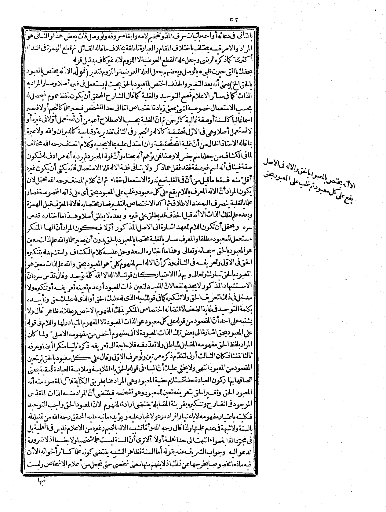 فيها ضرورة ملجئة إلى جعلها علماً جنسياً اعتراف منه بوروده، فذكره في صدد الجواب من العجب العجاب وأما ما ذكره في تفسير كلمة التوحيد من قوله: أي لا معبود بحق إلا ذلك الواحد، فلا يقتضي ما أورده عليه لأنه تأييد لعلمية الله وهو لا يقتضي اختصاص المنكر، وهو من قبيل العام المخصوص بقرينة، ولذا فسره بذلك كما بين في محله، وما ذكره في توجيه التنكير غير لائق بنظره اللطيف، ومقامه الشريف، وقيل في الجواب عما قاله الشريف إنّ ما قاله السعد في غاية القؤة والمتانة، وتقريره أنّ الشارع جعل هذه كلمة توحيد وهو مستلزم لكون الله علما لما ذكرنا مما لا مجال لمنعه كما سيأتي تحقيقه وإشارة تعريفه وتنكيره لما ذكره ليست مبنية على الوضع اللغوي والمعنى الأصلي بل هي من نكات البلاغة والاعتبارات المناسبة فحيث لم يكن في المعنى تعين بوجه لم يورد في الكلام تعريفاً أصلاً، فقلت اسم الله يقع على كل معبود بحق أو باطل فإذا حصل بالعلمية تعين ما أورد في الكلام المعبر عنه تعريفاً، فقال: ثم غلب على المعبود بحق، فإذا ازداد التعريف زاد فيه تعريفاً، ولا يخفى على المنصف أنه اعتبار مناسب صالح لكونه، إشارة لما ذكره ولا يرد عليه ما أورده قدس سره نظراً إلى الوضع اللغويّ مع أنّ قوله لا مدخل في ذلك لتعريف الحق، وتنكيره محل نظر إذ تعريفه إذا كان إشارة إلى الحق المختص بالله تعالى يفيد تعين ذات المعبود إفادة تامّة واضحة، فلا يصح القول بأنه لا مدخل لتعريفه وتنكيره في ذلك، ولا يخفى أنه لا معنى له، فإنّ نكات البلاغة لا بد لها من دليل في الكلام وضعي أو تابع له، فلا تثبت بمجرّد التشهي، وقد عرفت ما يغنيك عن مثله، ثم إنّ قوله: إن مفهومه المقابل للباطل لا تعدّد فيه ممنوع سواء أراد في نفس الأمر، أو في الذهن وعند العقل*