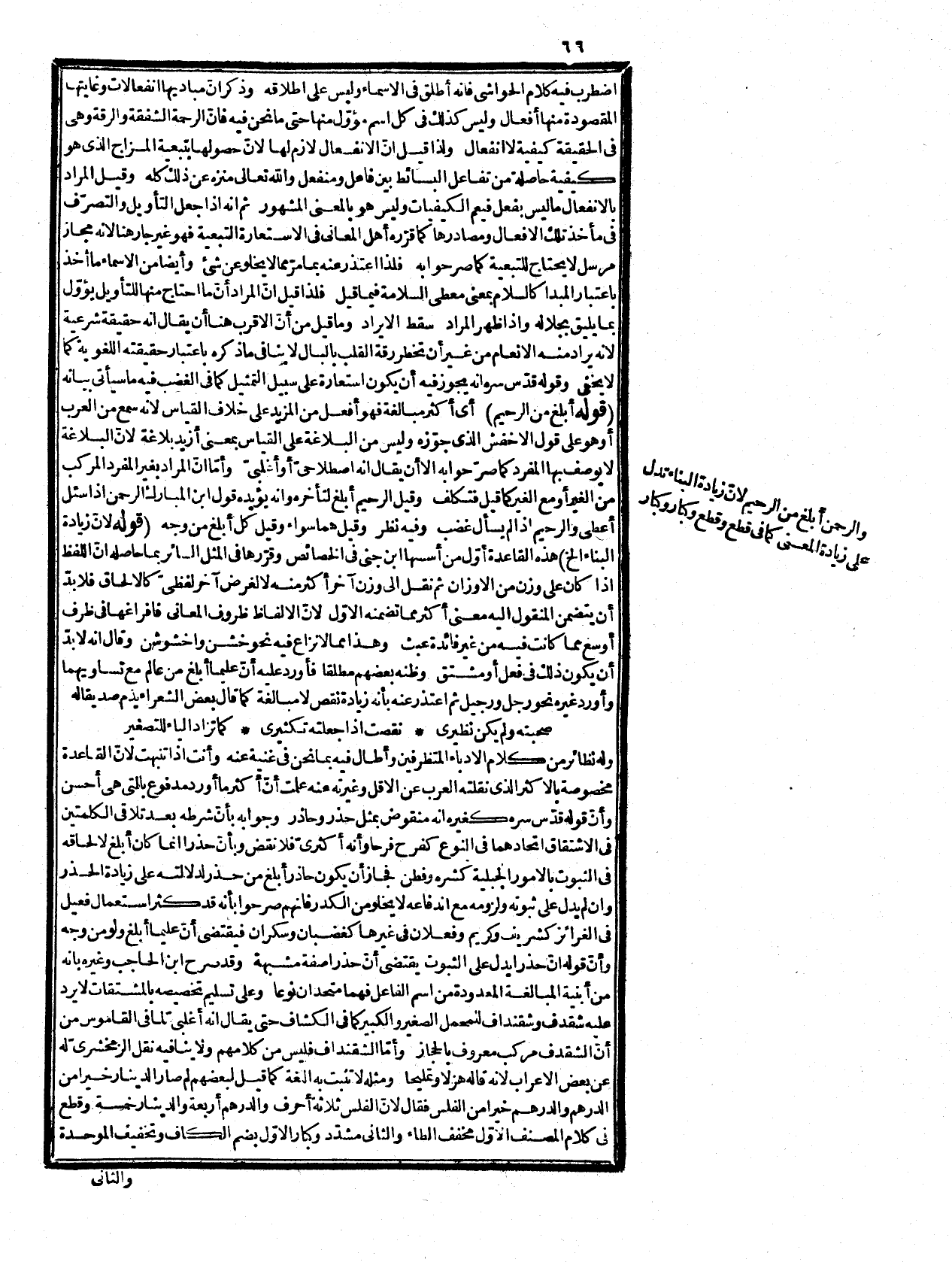 والثاني بتشديدها مبالغة في كبير بمعنى عظيم. قوله: (وذلك إنما ثؤخذ الخ) إشارة إلى الزيادة المدلول عليها بزيادة البناء المستلزمة للأبلغية، وهي أمّا باعتبار الكمية في مبدأ الاشتقاق، وهو الرحمة والكمية العدد نسبة إلى كم بعد ما شدّدت ميمه جريا على القاعدة المعروفة في باب النسب والكيفية نسبة إلى كيف التي يسأل بها عن الحال الذي يسمونه مقولة الكيف، وكيفيتها جلالتها وعظمتها ونفاستها، وكثرة كميتها إمّ باعتبار كثرة افراد متعلقها من المرحومين، أو بتعدد ما تتعلق فيه من الدنيا والآخرة أو باعتبار كثرة ما يحصل به من النعم أو بكثرة زمانه الواقع فيه كزمان الآخرة