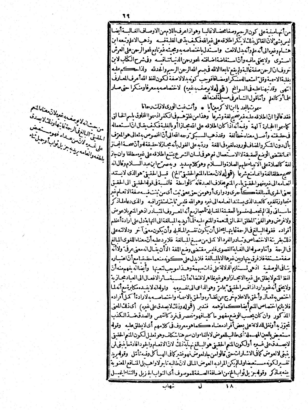 وهو لبيان الواقع إذ الثناء لا يكون إلا جميلاَ، والثواب سصكماعف كما وعد الكريم به فهو جزيل بالنسبة بما أعطاه أبدا، فلا وجه لما قيل من أنّ الأظهر أن يقول يريد به ثوابا إذ العموم أنسب، فيعتذر بأنه لموازنة ما بعده، ويزيح بزاي معجمة وحاء مهملة مضارع أزاج بمعنى أزال، وفي نسخة مزيح بصيغة اسم الفاعل منه معطوف على مستعيض وهذه أعواض سلبية بخلاف ما قبلها. وقوله: (أنفة الخسة) الأنفة كثمرة ما يستنكف من عاره، والخسة بالخاء المعجمة الدناءة أي يقصد بما يعطيه ذلك أو عدم لحوق عار الخسة، وفي نسخة رقة الجنسية وهي الأصح رواية عند الفاضل الليثي، والمراد ألم رقة الجنسية كما وقع كذلك في عبارة الغزالي، ونقله هذا الفاضل في حواشيه يعني أنه يرق قلبه، ويتأثر بما يشاهد. من احتياج أبناء جنسه وسوء حالهم فيزيل ذلك الألم عنه بإحسانه، وهذا عوض وفائدة عائدة عليه ولو قيل الرقة هنا بمعنى الضعف، كما في قوله عجبت من قلة ماله، ورقة حاله، كما في الأساس لم يبعد فسقط ما قيل من أنه وقع بهذه العبارة في كتب الكلام في مبحث الحسن والقبح، وليس لها كبير معنى. قوله: (ثم إنه كالواسطة الخ أقيل: إنّ ما قبله تعليل لعدم صدق البالغ في الرحمة غايتها على غير.، وهذا تعليل لعدم صدق المنعم الحقيقي على غيره، وقيل: إنه بيان لكونه منعما حقيقيا إذ لولاه لم يكن محسن، ولا إحسان، والأظهر أنه بيان لأنه لا منعم غيره مطلقا وهو أبلغ مما قبله، ولذا عطف بثم لتفاوت رتبتهما لأنه في الأوّل أثبت لغيره إنعاما وهنا نفاه، وقال: كالواسطة دون واسطة لأنها ما يتوقف عليه فعل الفاعل وفعله تعالى لا يتوقف على شيء، وقيل: لأنّ كل ما له دخل في الإنعام فهو بخلقه تعالى حتى الكسب على رأي الأشعري. . قوله: (لأن ذات النعم الخ) أي ذات النعم حاصلة من خلقه لها، ومعنى كون وجودهاً من خلقه أنّ ثبوته لها مستند له
