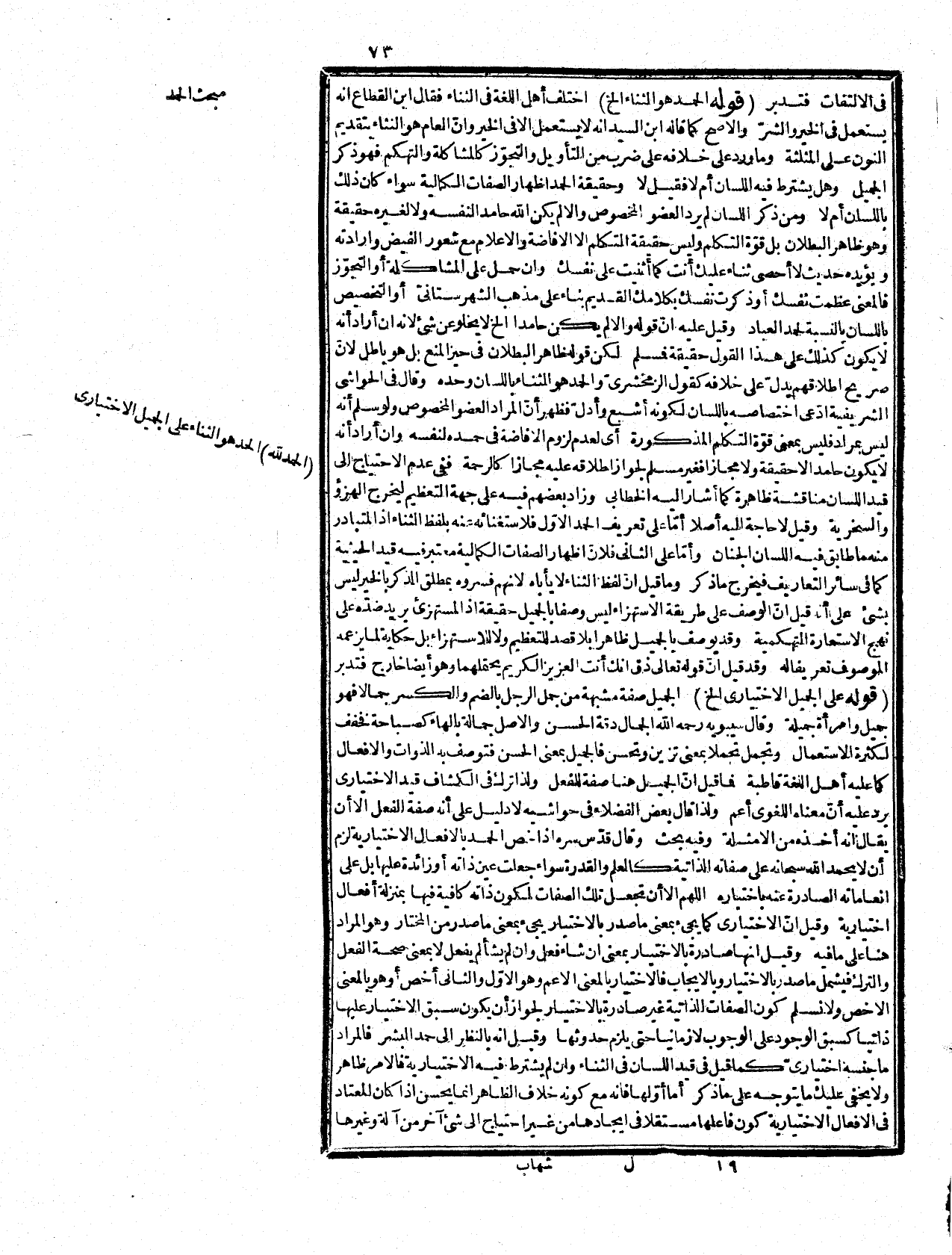 ليظهر استقامة تثبيه الصفات الذاتية بها، وتنزيلها منزلتها لذلك وليس كذلك، فإن كل فعل اختياري يحتاج إلى علم فاعله وقدرته، وأكثرها محتاج إلى آلات وأسباب أخر كما ذكر. بعض الفضلاء، وانه على تسليم استعمال الاختياري بالمعنى الثاني لا نسلم اتصاف الصفات الذاتية بالصدور إلا بتكلف يأباه لفظه، وأمّا كونها صادرة بالاختيار بالمعنى الأخص على ما قرّر في الكلام من أنّ الفلاسفة ادّعوا إيجاد العالم بطريق الإيجاب فلزمهم أن لا يكون لموجده إرادة واختيار، وقيل بانهم يقولون بأنه فاعل مختار بمعنى إن شاء فعل الخ. وصدق الشرطية لا يقتضي وجود مقدمها ولا عدمه، فقدم الشرطية الأولى بالنسبة إلى وجود العالم دائم الوقوع ومقدّم الثانية دائم اللا وقوع، ولهذا أطلق عليه الصانع وهو من له الإرادة بالإتفاق وهذا وأن ارتضوه ففي نهاية الطوسي إنه كلام لا تحقيق له لأنّ الواقع بالإرادة والاختيار ما يصح وجوده بالنظر إلى ذات الفاعلى، فإن أريد بالدوام واللا دوام المذكورين أنه مع صحة وقوع نقيضهما فهو مخالف لما صرحوا به من أنه موجب بالذات للعالم بحيث لا يصح عدم وقوعه منه، وان اريد دوامهما مع امتناع نقيضهما فليس هناك حقيقة الإرادة، والاختيار بل مجرّد اللفظ، ومتعلق الإوادة لا محيص عن حدوثه، والعالم عندهم قديم، فما هذا إلا تمويه وتلبيس انتهى. وأيضا ما ذكر من تفسير الاختيار بمختار المتكلمين لا الفلاسفة، مع أنه قد قيل عليه هنا أنه لا يجري في صفة المشيئة، وما يسبق عليها من الحياة والعلم والقدرة، ولذا قال في رسالة الحمد: إنه تكلف لا يتأتى في صفة القدرة، لأنّ صدورها ليس بالاختيار والألزم تقدّم الشيء على نفسه، فما ذكر ليس بحاسم للسؤال، ولا قاطع لمادّة الإشكال ولك أن تدفع ما ذكر باختيار الشق الأوّل، فتقول الصادر عن الموجب بالذات ليس واجبا بالدّات بل باعتبار صدوره عن الواجب