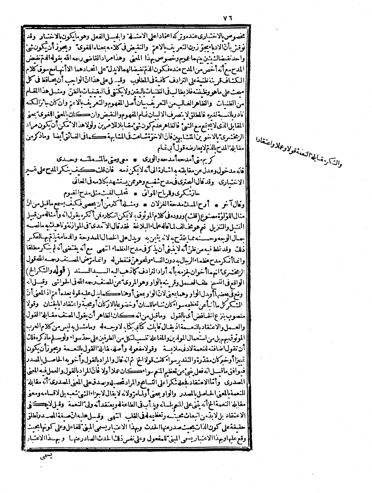 وبيانه أنه جعلها بإزاء النعمة جزاء لها متفرعا عليها، وكل ما هو جزاء للنعمة عرفا يطلق عليه الشكر لغة، ومن لم يتنبه لذلك زعم أنّ المقصود مجرّد التمثيل لجميع شعب الشكر لا الاستشهاد على أن لفظ الشكر يطلق عليها، فإنه غير مذكور، وما يقال من أن الشاعر جعل مجموعها بإزاء النعمة، فيستفاد منه أنه يطلق عليه لا على كل واحد منها، فجوابه أنه لا شبهة في إطلاقه على فعل اللسان حتى توهم كثير اختصاص الشكر لغة به، وإنما الاشتباه في إطلاقه على فعل القلب والجوارح فلما جمع مع الأوّل علم أن كلا شكر على حدة، فكأنه قيل كثرت نعماؤكم عندي وعظمت، فاقتضت استيفاء أنواع الشكر، وبولغ في ذلك حتى جعلت مواردها واقعة بإزاء النعماء ملكا لأصحابها مستفاداً منها، وفي وصف الضمير بالحجب إشارة إلى أنهم