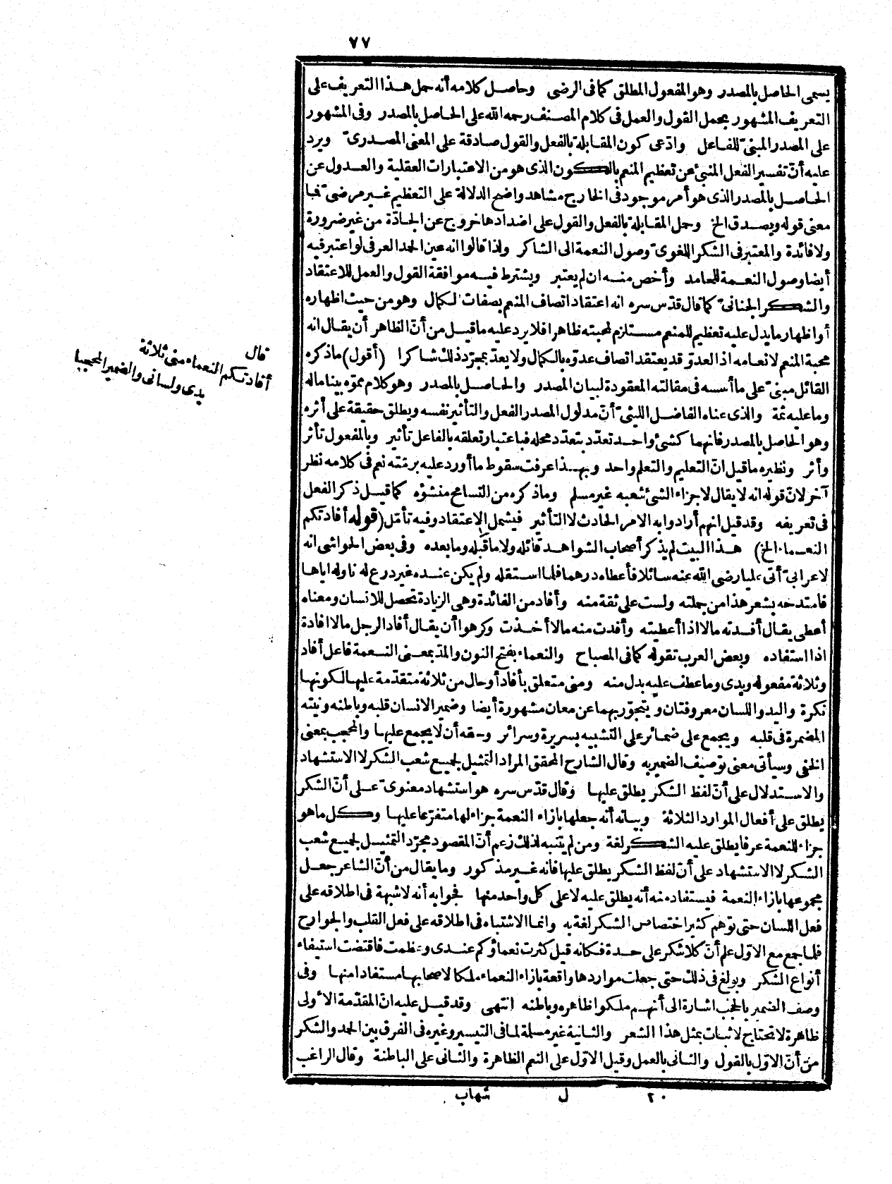 الشكر هو الثناء على المحسن كيف، وقد ذكر هو أنّ كثيراً من الناس ذهب إلى تخصيص الشكر باللسان، ومثله لا يندفع بمجرّد دعوى القائل من غير دليل، ويرد عليه أيضاً أنّ كون المقدمة الأولى ظاهرة في غاية الخفاء لاحتمال أن يكون مراد الشاعر أنكم ملكتم بإحسانكم ظاهري، وباطني، وأسرتموني جملة، فلا قدرة لي على مفارقتكم كقول بعض العرب علي يدا مطلقها، وأرق رقبة معتقها، ومنه أخذ أبو تمام قوله: