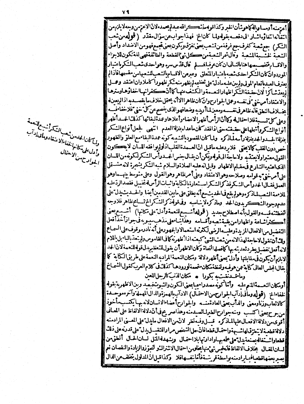 العبد بإنعام مولاه ويثنى عليه لم يظهر منه شكر ظهوراً تاما، وإن اعتقد أو عمل لا يعذ شاكرأ لأن حقيقة الشكر إظهار النعمة، كما أن الكفران سترها.