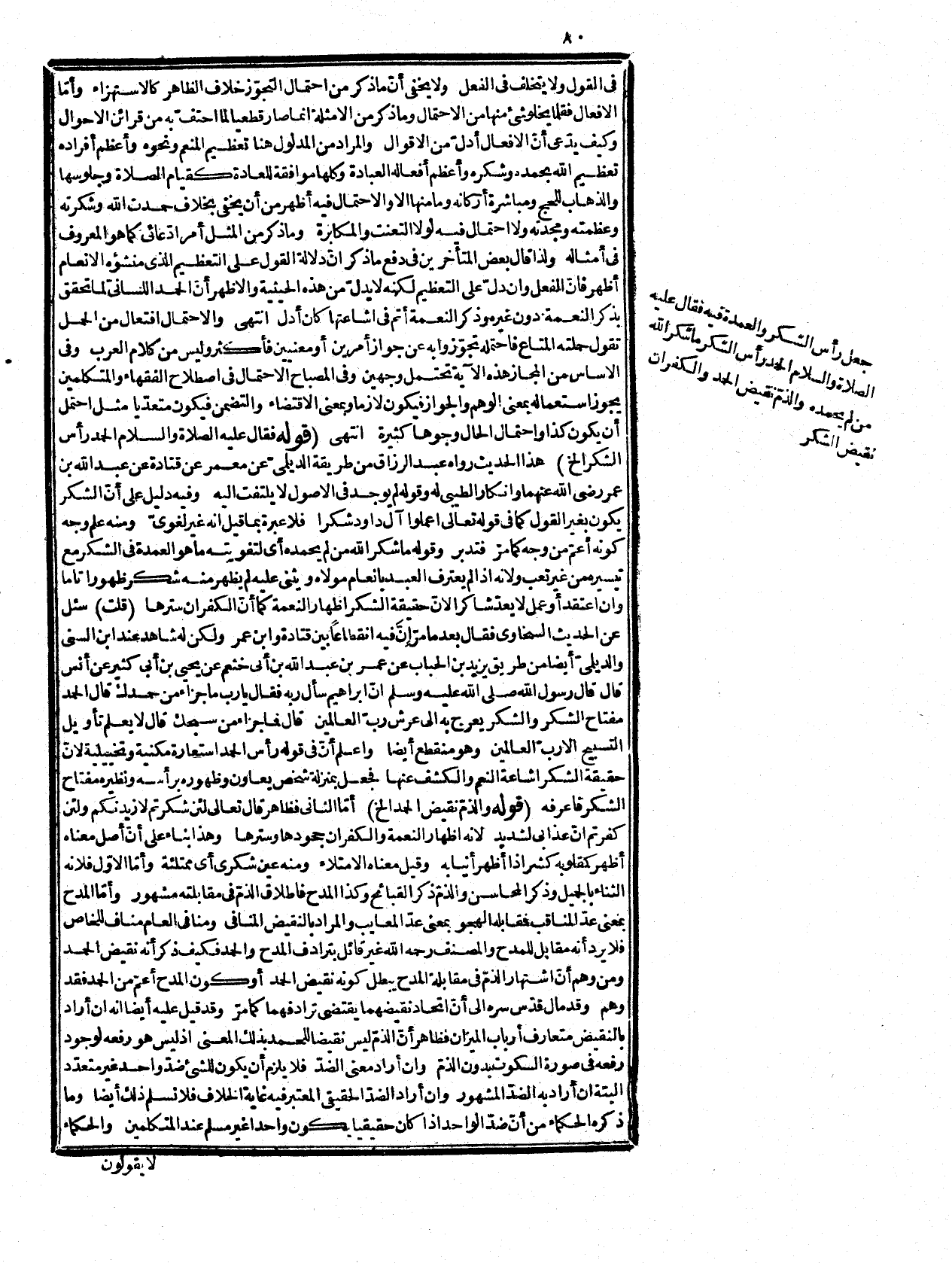 أن تدل على نسبتها إليها، والأصل في بيان النسب والتعلقات هو الأفعال، فهذه مناسبة تستدفي أن يلاحظ مع المصادر أفعالها لفظاً، فتسدّ مسدّها وتستوفي حقها لفظاً، ومعنى فلا يستعملونهما معا ويجعلون ذكر أفعالها، كالشريغة المنسوخة في أنه خروج عن طريقة معهودة إلى طريقة مهجورة يستنكرها المتدين بعقائد اللغة، ولا يرد عليه ما قيل من أنه لا يدل على أنّ أصله النصب بل على أنّ المقام مقام الأتيان بالجملة الفعلية لأنه حينئذ إذا أتى بمصادرها كان حقها النصب كما سمعته عن سيبويه، وقراءة النصب هنا شاذة منسوبة لهرون بن موسى العتكي، والقراءة الشاذة يستدل بها النحاة، والنصب على المصدرية بفعل محذوف تقديره نحمد بنون الجماعة لأنه مقول على ألسنة العباد ومناسب. لقوله: (نعبد ونستعين الا بنون العظمة لعدم مناسبته لمقام العبادة المقتضي لغاية التذلل والخضوع وليس مفعولاً به بتقدير اقرؤا، وأن جوّزه بعضهم لما مرّ، وقراءة الرفع أولى لدلالة الجملة الإسمية على الدوام والثبوت بقرينة المقام بخلاف الفعلية فإنها تدل على التجذد والحدوث، واذا كان الخبر ظرفاً