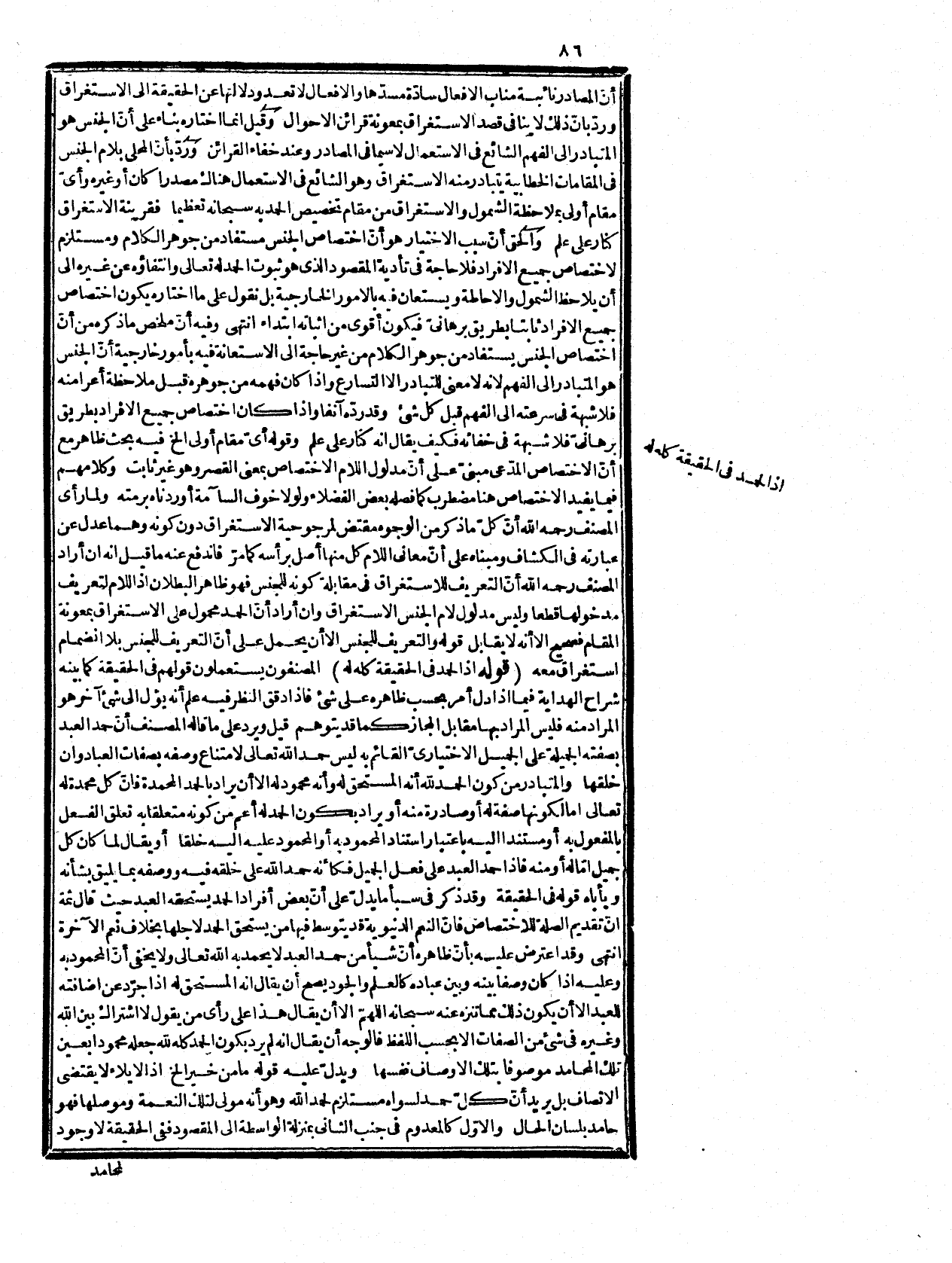 لمحامد الغير، وانما الموجود في كل حمد حمده، وأيضا حمل الحمد على المحمدة، قيل إنه لا يفيد لأنّ الكلام في الحمد بمعناه الحقيقيّ لا بمعنى المحمدة، والأولى أن يقال الحصر بناء على عدم الاعتداد بحمد العبد باعتبار كسبه، وأيضاً قوله ويأباه قوله في الحقيقة ليس بمسلم على ما مرّ من معناه.