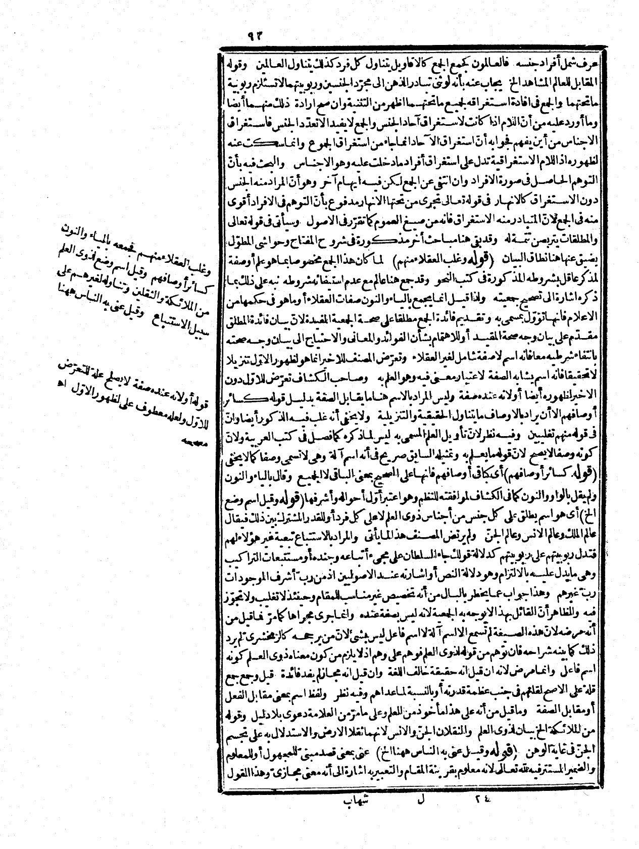 وهو منزع صوفيّ، فمن قال في شرحه: إنّ تخصيصه بهم لأنّ المقصود بالذات من التكليف بالأحكام من الحلال والحرام وإرسال الرسل عليهم الصلاة والسلام، وانزال الكتب هو الإنسان قال الله تعالى {لِيَكُونَ لِلْعَالَمِينَ نَذِيرًا} [الفرقان: ا] لم يقف على مراده، ولم يحم حول مرامه، وعلى هذا هو شائع في أفي اد البشر مشترك بينها اشتراكا معنويا فكل فرد منه بمنزلة جنس من تلك الأجناس، ومرّضه المصنف رحمه الله لمخالفته لأصله من غير مقتض، ولا دليل يدل عليه إذ المناسب للمقام التعميم، فلا يرد عليه أنه قد يختص بهؤلاء كما في قوله تعالى {وَفَضَّلْنَاهُمْ عَلَى الْعَالَمِينَ} [الجاثية: 116. قوله: (من حيث أنه يشتمل إلخ) قيد الحيثية في كلام المصنفين يستعمل على وجوه هي الإطلاق كمايقال إنّ الإنسان من حيث هو إنسان مدرك للكليات والجزئيات، والتقييد كما يقال دلالة التضمن دلالة اللفظ على جزء معناه من حيث هو جزؤه، والتعليل كما يقال الأفيون من حيث إخراجه للحرارة الغريزية يسخن ظاهر البدن وهذا هو المقصود هنا، ويشتمل افتعال من الشمول وهو الإحاطة والفرق بين الاشتمال، والشمول أنّ الشمول يوصف به المفهوم الكليّ بالنسبة إلى جزئياته، والاشتمال يوصف به الكل بالنسبة لأجزائه وهذا أغلبيّ، فلا يرد عليه ما يخالفه، والمراد بالعالم الكبير عالم الملك وهو السماء، وما تحويه بأسره، واشتماله كما في حاشية متقولة عنه لأنّ ما في ذلك العالم من شيء إلا وفي الإنسان نظيره مما يحكيه، ويفيد ما يفيده