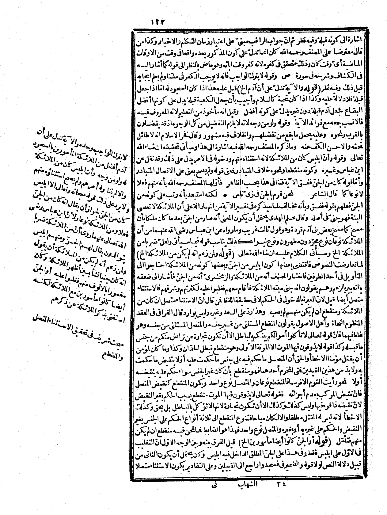 لا منقطعا. (أقول (: الظاهر أنّ المصنف رحمه الله أراد الوجه الذي ذكره الإمام بقوله أو يقال: إنه أمر بلفظ غير مذكور في القرآن لقوله تعالى: {إِذْ أَمَرْتُكَ} [سورة الأعراف، الآية: 2 ا] يعني أنه يقتضي أن يكون مأموراً صريحا لا ضمناً فيكون مقدراً وهو وقلنا للجن اسجدوا وقوله فإنه إذا علم الخ بيان للقرينة الدالة عليه فالفرق بينه وبين الأوّل عموم الأمر للجن، والدلالة على ذلك بلفظ مقدر فليس من التغليب في شيء وأمر الضمير ظاهر حينئذ. قوله: (وأنّ من الملائكة من ليس بمعصوم الغ (عطف على انّ إبليس وهو مبنيّ على ما ارتضاه من أنه ملك قال علم الهدى زوال العصمة عن أفراد الملائكة بتحقق المعصية منهم جائز إذا تعلق به عاقبة حميدة لا وخيمة بخلاف الأنبياء عليهم الصلاة والسلام عندنا، وسيأتي الكلام عليه في قصة هاروت وماروت، وفي التيسير وأمّا وصف الملائكة بأنهم لا يعصون ولا يستكبرون فدليل لتصوّر العصيان منهم ولولا تصوّره لما صرّح به لكان طاعتهم طبع وعصيانهم تكلف وطاعة البشر تكلف ومتابعة الهوى منهم طبع ولا يستنكر من الملائكة صدور العصيان مع قصة هاروت وماروت. قوله: (ولعل ضرباً من الملانكة الخ (قال ابن إسحق: الجن اسم للملائكة أيضا لاجتنانهم أي استتارهم عن أعين الناس وهذا معنى قول المصنف يشملهما أي بحسب الاشتقاق وأصل اللغة وقال تعالى: {وَجَعَلُوا بَيْنَهُ وَبَيْنَ الْجِنَّةِ نَسَبًا} [سورة الصافات، الآية: 158] فسر بالملائكة، وورد مثله في كلام العرب قال الأعشى في سليمان عليه الصلاة والسلام: