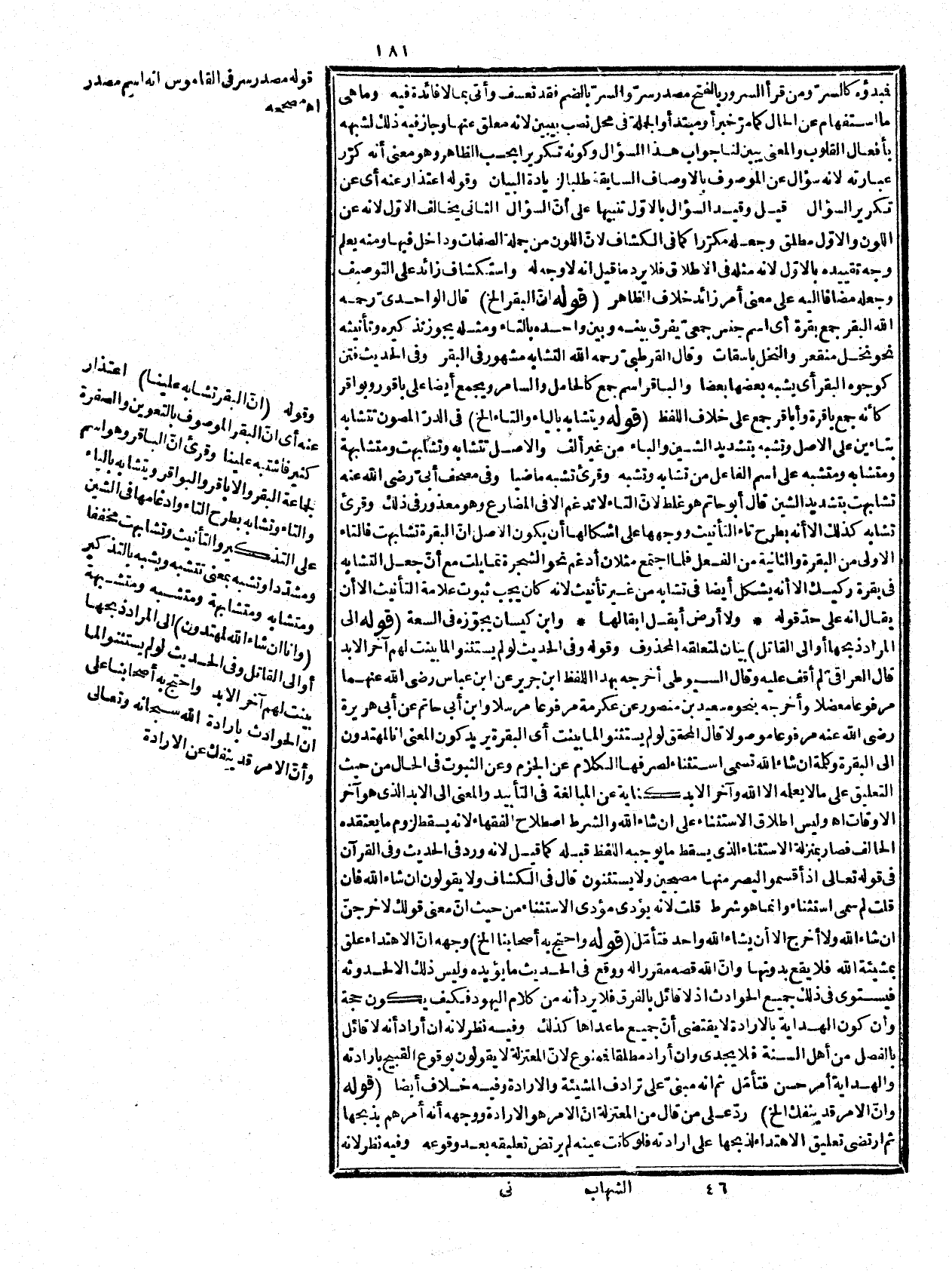 إنما يتم أن لو أريد بالاهتداء الاهتداء إلى المراد بالأمر وقد فسر بغيره أيضاً مع أنّ اللازم من الغرض! المذكور أن يكون المأمور به وهو ذبح البقرة مراداً ولا يلزمه الاهتداء إذ يجوز أن يكون لتلك الإرادة حكمة أخرى وقوله: للشرط أراد به التعليق وهو يطلق عليه وعلى أداته وعلى الجملة الأولى. قوله: (والمعتزلة والكرامية الخ) عطف على فاعل احتج وتقدم ضبط الكرامية فراجعه، ووجهه أنّ دخول كلمة أنّ عليها يقتضي الحدوث لأنه علق حصول الاهتداء على حصول مشيئته وهو حادث فكذلك مشيثته محدثة والا يلزم التخلف، وحاصل الجواب أنّ اللازم حدوث التعلق ولا يلزمه حدوث نفس الصفة وتفصيله في الكلام. قوله: (أي لم تذلل للكراب الخ) الكراب بالكى إثارة الأرض للحرث وتذلل بمعنى تستعمل له ولا ذلول صفة بقرة ولا بمعنى غير قيل: فكأنها اسم على ما صرح به السخاوي لكن لكونها في صورة الحرف ظهر إعرابها فيما بعدها، ويحتمل أن تكون حرفاً كما تجعل إلا بمعنى غير في مثل: {لَوْ كَانَ فِيهِمَا آلِهَةٌ إِلَّا اللَّهُ} [سورة الأنبياء، الآية: 22] مع أنه لا قائل باسميتها وأما الثانية فحرف زيد لتأكيد النفي وهو لا ينافي الزيادة مع أنه يفيد التصريح بعموم النفي إذ بدونها يحتمل نفي الاجتماع ولذا تسمى المذكرة، وصرح بأنّ الفعلين صفتا ذلول إشارة إلى أنّ تثير منفيّ لكونه صفة للمنفيّ فيصح في