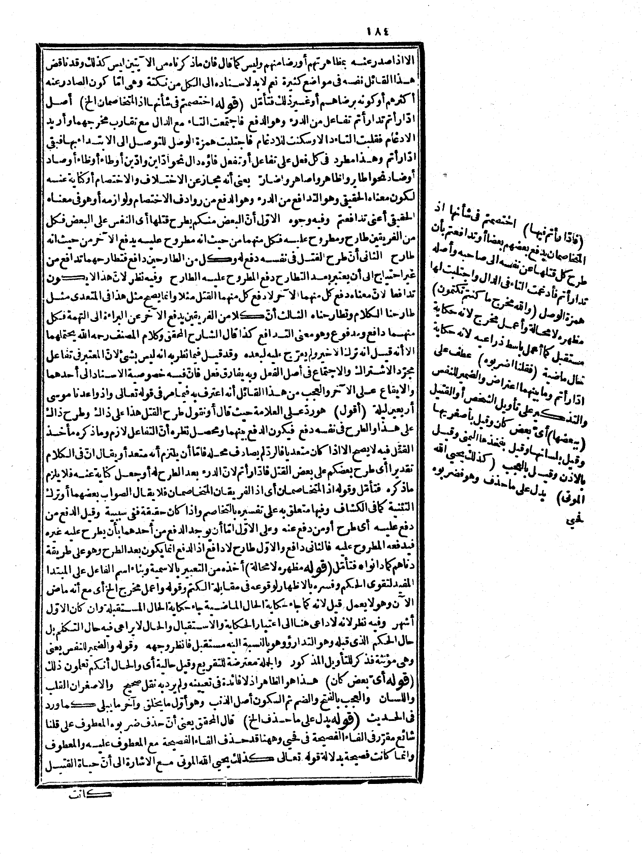 يلقي إليه الكلام فلا يجري فيه الالتفات وقد وقع من العلامة إجراؤه فيه تارة ومنعه أخرى بناء على المسلكين ومن غفل عن هذا قال: كان حقه أن يؤخر هذا عن قوله لعلكم تعقلون لئلا يتوهم أنّ المراد الخطاب في كذلك فإنه لا يصح خطابا لمن حضر حياة القتيل لأنهم معدومون وقت الخطاب بل هو خطاب لمن يتلقى الكلام ثم إنه على هذا التقدير لا بد من تقدير القول قبل كذلك أي وقلنا لهم أو قلنا بدون واو استئنافا بخلاف الوجه الثاني فإنه ينتظم بدونه بل يخرج معه عن الانتظام، فتأمّل والخطاب على الثاني مع كل من يقف عليه. قوله: (لكي يكمل عقلكم الخ) أوّله لأنّ كونهم يعقلون أمر محقق لا في صورة المرجوّ لكن جعلوا لعدم الجري على موجب العقل كأنهم لا يعقلون ولو قدر له مفعول ولم ينزل منزلة اللازم لم يحتج إلى هذا التأويل فالمراد إمّا العقل الكامل أو أثره الذي هو العلم ولك أن تجعل قوله أو تعلمون الخ إشارة إلى تقدير المفعول لكن تأخير قوله أو تعملون يأباه، والتقزب بالذبح، وأداء الواجب بامتثال الأمر واليتيم هو صاحب البقرة والتوكل من أبيه كما مرّ وكذا الشفقة، والطالب القوم الطالبون لمعرفة القاتل وقصة عمر رضي الله عنه مذكورة في سنن أبي داود والنجيبة الجيدة من الإبل ويقال لراكبها نجاب، وكون المؤثر هو الله لأنّ مس عضو ميت بآخر مثله كيف يكون سبباً لحياة بين موتين، وقوله: ومن أراد في نسخة وأنّ من أراد وهذا مما يشير إليه باطن النص مع ملاحظة المعنى لا أنه تفسير مستقل كما أشار إليه فيما مضى والعدوّ النفس وشبه القوّة الشهوية بالبقرة لكثرة أكلها وعدم إدراكها لما فيه نفع وشرّة الصبا بكسر الشين وتشديد الراء خيانته وحمله على ما لا يليق، ويجوز فتح الشين والراء المخففة بمعنى الحرص والأوّل أولى وهذا مع ما بعده مأخوذ من قوله لا فارض ولا بكر، وكونها معجبة رائقة من قوله تسرّ الناظرين، وقوله: لا سمة بها أي علامة معنى لاشية لأنّ اللون المخالف يكون علامة لما فيه وليس معنى آخر كما توهم، وقوله فتحيا الخ من حياة القتيل وتكلمه وحمل التدارئ على ما بين العقل والوهم لأنه ينازعه دائما وهو ظاهر. قوله: (لقساوة الخ) أي القسوة معناها الحقيقيّ الييس والكثافة والصلابة ثم تجوّز بها عن عدم قبول الحق والاعتبار فالاستعارة في قست تبعية