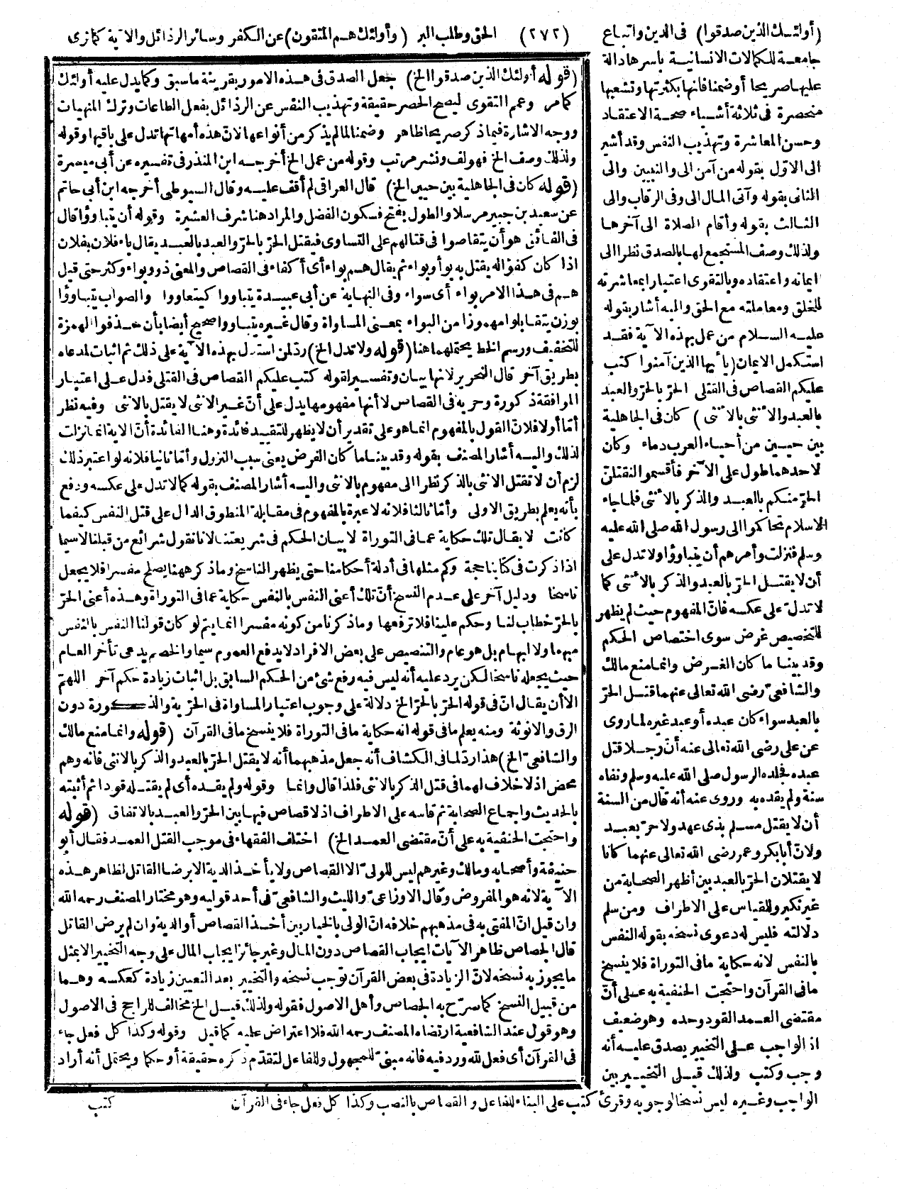 الحياة من الآفات، ومعناه أنّ الحياة الحاصلة بالارتداع أو الحياة العظيمة إنما تحصل بشرعية القصاص لا غير فالظرفية مجازية تفيد بحسب الوضع اجتماعهما وهما ضدان فيقصد بها هذا المعنى البديع في نفسه الغريب في مأخذه فلا يرد عليه شيء. قوله: (وعرف القصاص الخ (يعني أنّ التعريف للجنس والتنوين للتنويع والتعظيم لأنه يردع القاتل عن القتل فيكون سبباً لحياة نفسين أو يمنع أن يقتل غير القاتل كما كان في الجاهلية فتحيا به نفوس، فعلى الأوّل فيه إضمار أي شرع القصاص أو علم القصاص وعلى الثاني فيه تخصيص الحياة بحياة غير المقتص منه والنوعية أنسب بالأوّل والتعظيم بالثاني ولذا خصه في الكشاف والمصنف رحمه الله لم يعينه لصلاحيته لكل منهما. قوله: (يحتمل أن يكونا خبرين الخ) وقوله: صلة له أي متعلقا بمتعلقه أو به نفسه لنيابته عن المتعلق أو حالاً وقراءة القصص جوّز فيها أيضا أن يكون القصص مصدراً بمعنى القصاص وخص! الخطاب بأولي الألباب لما ذكره، وقيل: لأنّ الحكم مخصوص بالبالغين دون الصبيان، وقوله: في المحافظة إشارة إلى أنه من التقوى بالمعنى الشرعي وقوله: أو عن القصاص فيكون بالمعنى اللغوي. قوله: (كتب الخ (ترك العطف في هذا ونظائره لأنه قصد استقلالها وأن كلاً منها مقصود بالذات وان أمن فيها العطف وملاحظة مناسبة بينها، وقوله حضر
