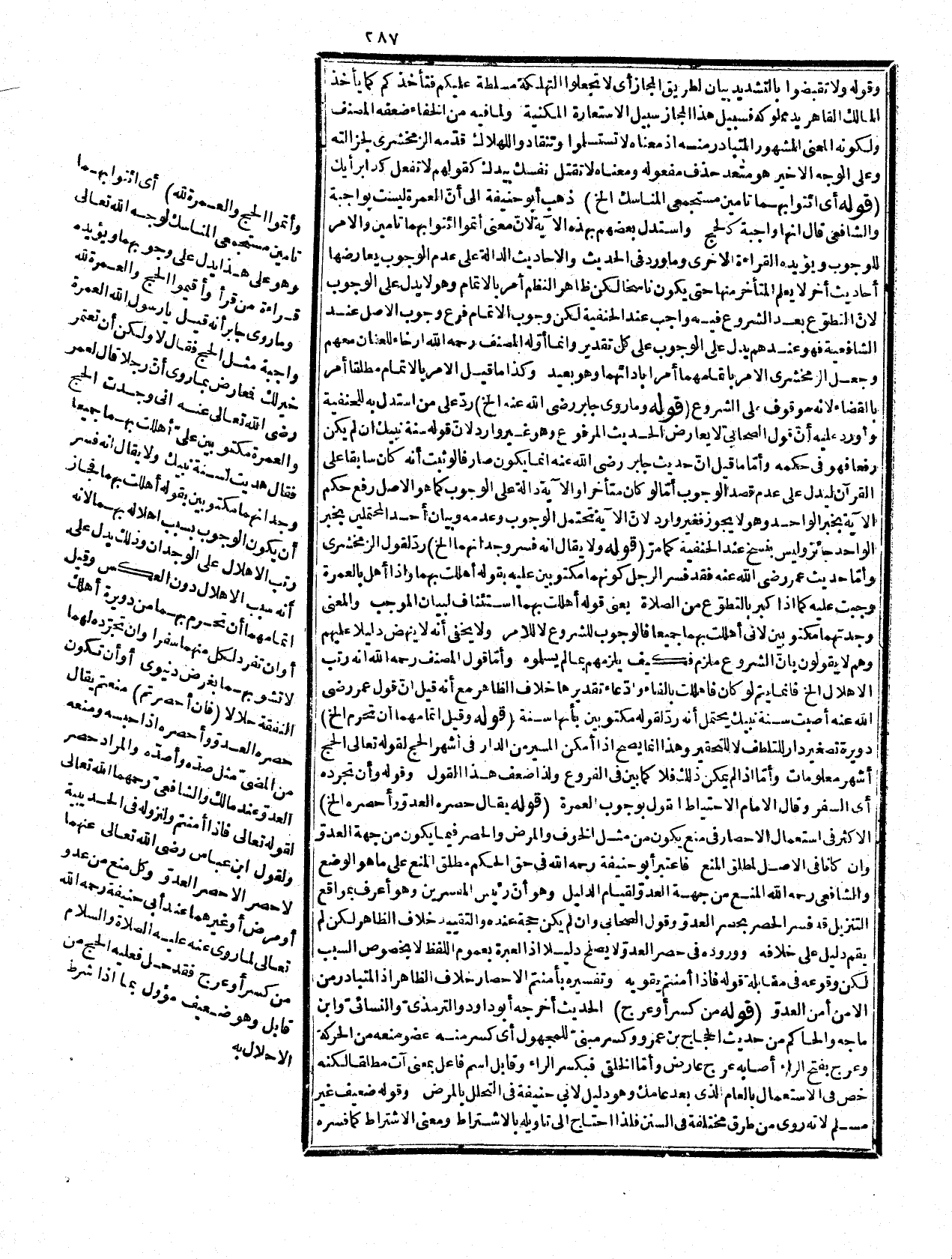 إلى شيء من محظورات الإحرام وقمل كدمل معروف. قوله: (فقد روي الخ) في البخارفي عن عبد الله بن مغفل قال قعدت إلى كعب بن عجرة رضي الله عنه في هذا المسجد يعني مسجد الكوفة فسألته عن قوله ففدية من صيام فقال: حملت إلى النبيّ - صلى الله عليه وسلم - والقمل يتناثر على وجهي فقال: " ما كنت أرى أن الجهد بلغ بك هذا أما تجد شاة قلت: لا قال: فصم ثلاثة أيام أو أطعم ستة مساكين لكل مسكين نصف صاع من طعام واحلق رأسك فنزلت فئ خاصة وهي لكم عامة " وعجرة بضم العين المهملة وسكون الجيم وفتح الراء المهملة، وهو أتك جمع هامّة بتشديد الميم وهي صغار الدوالث غير ذوات السمّ منهئم بمعنى دث وفي الحديث: " أعوذ بكلمات الله التامة من كل شيطان وهافة " والفرق بفتح الفاء والراء وتسكن والقاف مكيال يسع ثلاثة آصع، وانسك بمعنى اذبح وآصع جمع صاع وهو مكيال معروف، وقوله: أمنتم الإحصار يحتمل أنه بناء على مذهب أبي حنيفة وما بعده على مذهبه والمراد بالسعة عدم مضايقة العدوّ وأنه جعل أولاً مفعول الأمن محذوفا وهو الإحصار على طبق مذهب الشافعيّ أنّ المعتبر الإحصار والأمن منه لا من المرض والعدوّ وثانيا جعل أمنتم منزلاً منزلة اللازم أي كنتم في أمن وسعة موافقا لمذهب أبي حنيفة. قوله: (فمن استمتع وانتفع الخ) التمتع هو أن يحرم بالعمرة في أشهر الحج ويأتي بمناسكها ثم يحرم بالحج من جوف مكة ويأتي بأعماله ويقابله القرآن وهو أن يحرم بهما معاً ويأتي بمناسك الحج فيدخل فيها مناسك العمرة والإفراد هو أن يحرم بالحج وبعد الفراغ منه بالعمرة. قوله: (وقيل الخ) فالمعنى على الأوّل من انتفع بالشروع في العمرة ممتد أو منتهيا إلى الانتفاع بالحج وعلى الثاني