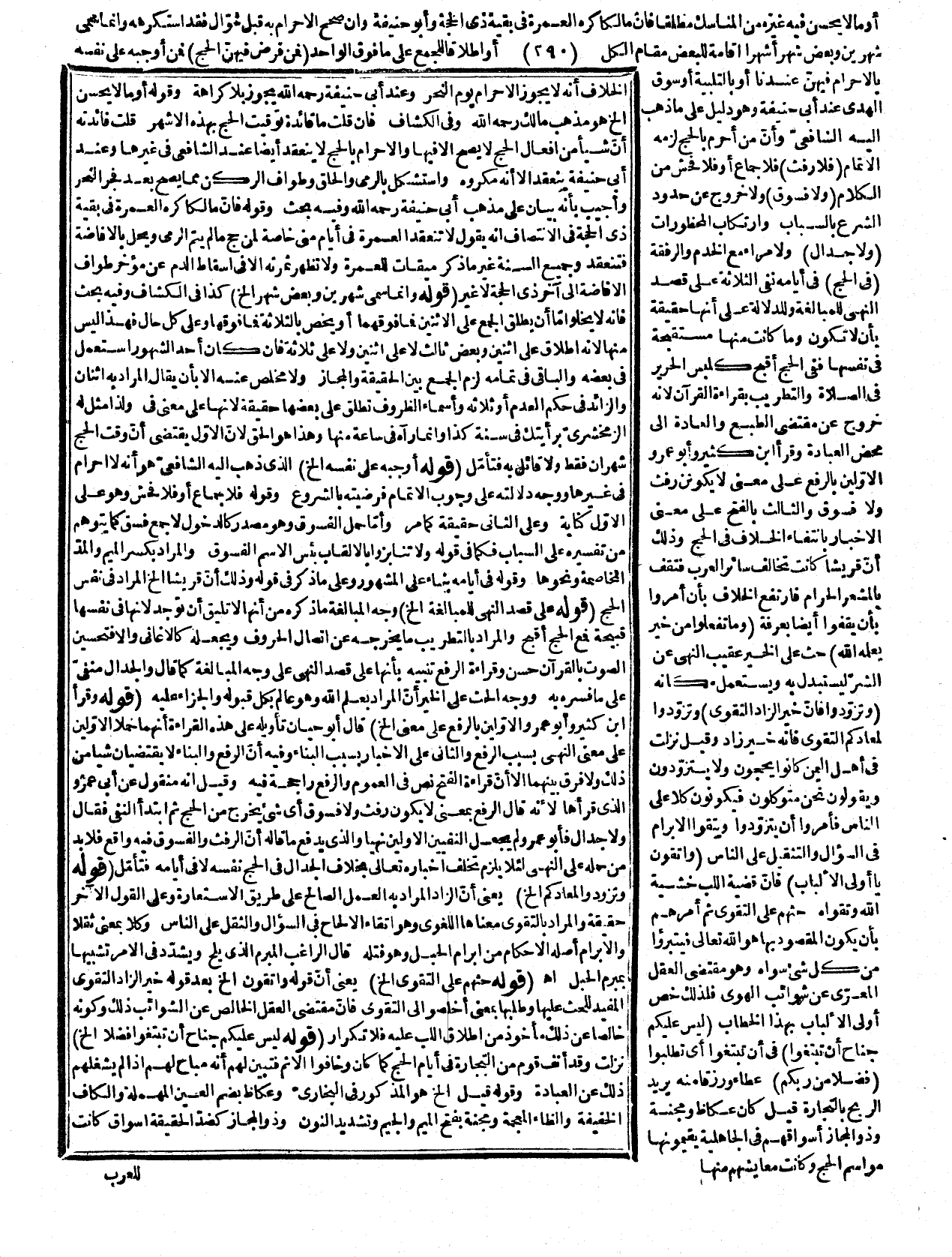 للعرب بقرب مكة وسمي موسم الحج موسماً لأنه معلم يجتمع الناس إليه، وقوله: تأثموا منه أي خافوا الإثم وقوله: في أن تبتغوا بيان للإعراب والظرف متعلق بجناح أو بالظرف الواقع خبر ليس أعني عليكم. قوله: (دفعتم منها بكثرة الخ) يعني أنه من فاض الماء إذا سال منصباً وأفضته أسلته والمراد به هنا دفعتم أنفسكم منها بكثرة تشبيهاً بفيض الماء والمفعول مما التزم حذفه للعلم به. توله: (وعرفات جمع سمي به كأذرعات الخ) أذرعات اسم بلدة بالشأم وهي مثل عرفات في العلمية وأنها لا واحط لها إذ لى ورح أذرعة ولا عرفة،! ال ا! فرّاء: قول الناس نزلنا بعرفة ليس بعربي محض، قيل: ولو سلم فعرفة وعرفات مدلولهما واحد ثم لا كلام في استعماله منوّنا وان حكى سيبويه عدم التنوين فيه! انما الكلام في الصرف وعدمه فعند البعض غير منصرف للعلمية والتأنيث والتنوين للمقابلة لا للتمكين يعني جيء به في مقابلة النون في جمع المذكر السالم ويكسر في موضع الجرّ للأمن بهذا التنوين من تنوين التمكين والكسرة إنما تذهب في غير المنصرف تبعاً للتنوين إذا ذهب من غير عوض أمّا إذا عوض عنه شيء كاللام والإضافة فلا تذهب وهنا عوض! عنه تنوين المقابلة وهذا قول للنحاة في عدم منع الصرف وكون الكسرة تابعة للتنوين واختار الزمخشري أنه منصرف لعدم الاعتداد بالتأنيث لأن التاء للجمع ووجودها يمنع من تقدير أخرى كما في سعاد فعلى هذا لو جعل مثل بنت ومسلمات علما لامرأة وجب صرفه، ومخالقة ابن الحاجب فيه ليست بشيء وفيه أن عرفة كيف يتردد الفزاء في صحته وهو مسموع في كلام العرب وفي الحديث " الحج عرفة " والظاهر أنهم لم يقفوا على مراده فانّ عرفة اسم لليوم التاسع من ذي الحجة كما صرّح به الراغب والبغوي والكرماني وبهذا المعنى ورد في الحديث فالذي أنكره الفرّاء استعماله في المكان كعرفات وهذا مما لا شبهة فيه وقد نبه عليه شراح البخاري، وقوله لذلك يجمع مع اللام خطاً لأنّ تنوين