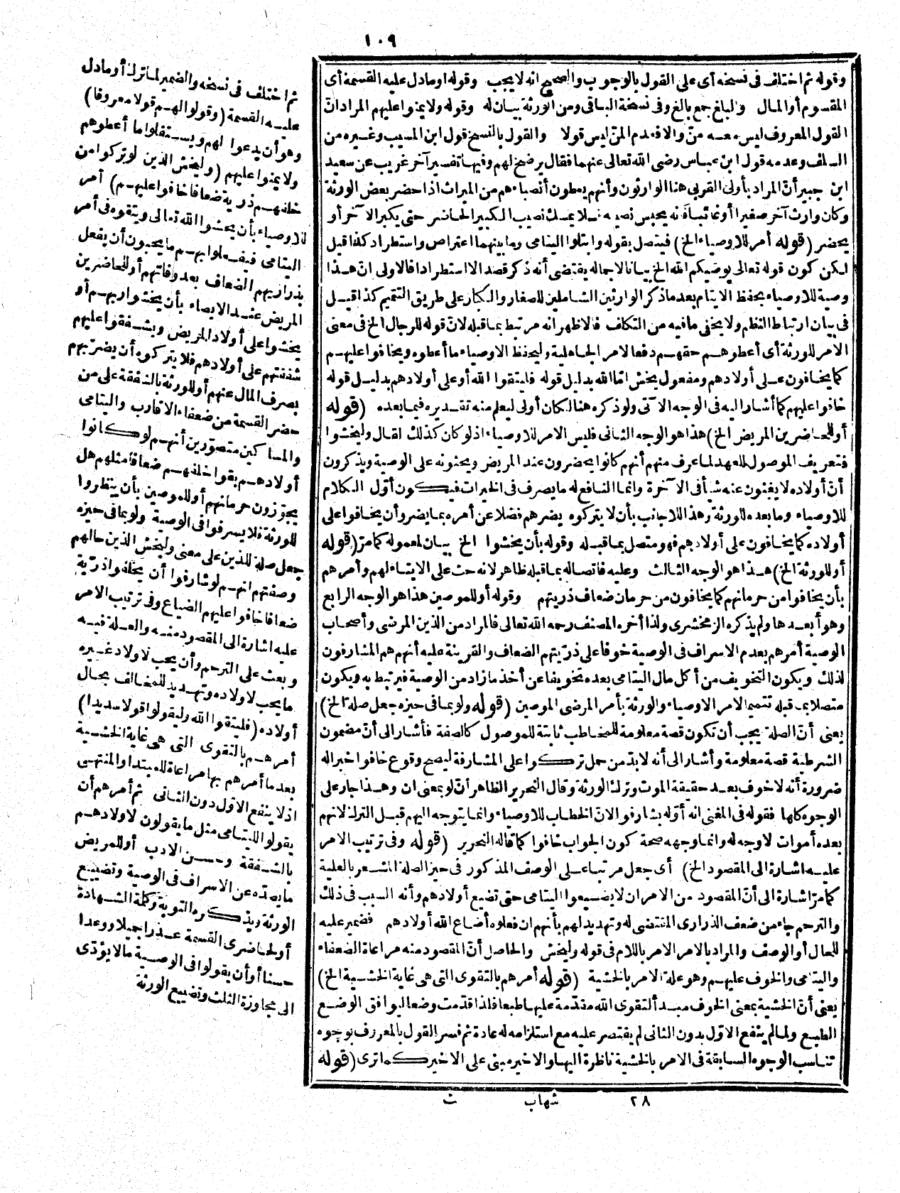 كلامه أنه متعد بنفسه وقيل: إنه يتعدى بالباء فيقال صلى بالنار، وذكر الراغب أنه يتعدّى بنفسه تارة وبالباء أخرى وسعيراً بمعنى مسعراً وموقداً، وتوله: وأي ناراً لتعظيم مستفاد من التنكير. قوله:) يأمركم ويعهد إليكم الخ) الوصية كما قال الراغب: أن يقدم إلى الغير ما يعمل فيه مقترنا بوعظ من قولهم أرض واصية متصلة النبات، وهي في الحقيقة أمر له بعمل ما عهده إليه فلذا فسرها المصنف رحمه الله تعالى بما ذكر وقوله: (في شأن) قدر المضاف ليصح معنى الظرفية، وقيل في بمعنى اللام وقوله: وهو إجمال الخ بيان لموقع الجملة فإنها مفسرة للوصية التي في ضمن الفع! فلا محل لها من الإعراب ولا حاجة إلى تقدير قول أي قائلا ونحوه وجوّز فيها أن تكون مفعولاً ليوصي لأن فيه معنى القول فيحكي به الجمل على أحد المذهبين المعروفين. قوله: (أي يعدّ كل ذكر بأنثيين الخ) إنما قيده بقوله: حيث اجتمع الصنفان أي من الذكور والإناث يعني واتحدت جهة إرثهما لأنه قد ينقص الذكر عن الأنثى في بعض الصور، وهذا أغلبي أيضا لتساوي الذكور والإناث من أولاد الأم كما سيأتي فمان كان المراد بيان حكم اجتماع الابن والبنت على الإطلاق، وهو الظاهر لم يحتج إلى تقييد أصلاً فتأمّل. قوله: (وتخصيص الذكر بالتنصيص! على حظه الخ) يعني أنّ الآية نزلت لبيان المواريث رداً لما كانوا عليه من توريث الذكور دون الإناث ومقتضاه الاهتمام بالإناث وأن يقال للاثنين مثل حظ الذكر لكنه عكس هنا فأشار إلى أنّ حكمته إنّ الذكر أفضل ففعل ذلك لفضله، ولأنّ ذكر المحاسن أليق بالحكيم من غير ولذا قال تعالى: {إِنْ أَحْسَنتُمْ أَحْسَنتُمْ لِأَنفُسِكُمْ وَإِنْ أَسَأْتُمْ فَلَهَا} [سورة الإسراء، الآية: 7] فلذا قدم ذكر الإحسان وكرّره دون الإساءة فلذا جعل الأوّل صريحا ونصاً والثاني ضمنا وعدل عن مقتضى الظاهر، وفضله معلوم من الخارج أو من تضعيف حظه، أو أنه مقتضى الظاهر، والمقصود هنا أن الذكور أولى فيكفي للأولوية تضعيف نصيبهم وهو كالقول بالموجب وقيل المقصود بالبيان تنقيص حظ الذكور عما كانوا عليه وذلك يقتضي التنصيص عليهم، وهو