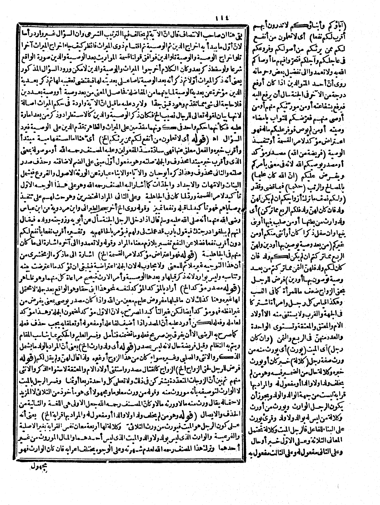 لأنه مجاز شائع وقد استعملوه كذلك، وذهب ابن مالك إلى أنه اسم جمع لقريب كصحابة فلا شاهد فيه حينئذ. قوله: (واكتفى بحكمه عن حكم المرأة الأن تقييد المعطوف عليه تقييد للمعطوف، وإن كان ليس بلازم وإنما فعل كذلك لأنّ توحيد الضمير بعد أو لا بد منه حتى أنّ ما ورد على خلاف ذلك مؤوّل عند الجمهور كقوله تعالى: {إِن يَكُنْ غَنِيًّا أَوْ فَقَيرًا فَاللهُ أَوْلَى بِهِمَا} [سورة النساء، الآية: 135] وأتى به مذكراً لأنك بالخيار بين أن تراعي المعطوف أوالمعطوف علبه فراعى المتقدم منهما ويجوز أن يكون الضمير لواحد منهما والتدّكير للتغليب. قوله: (سوّى بين الذكر والأنثى الخ) لأنّ الأولاد الأم في القسمة والاستحقاق سواء للواحد