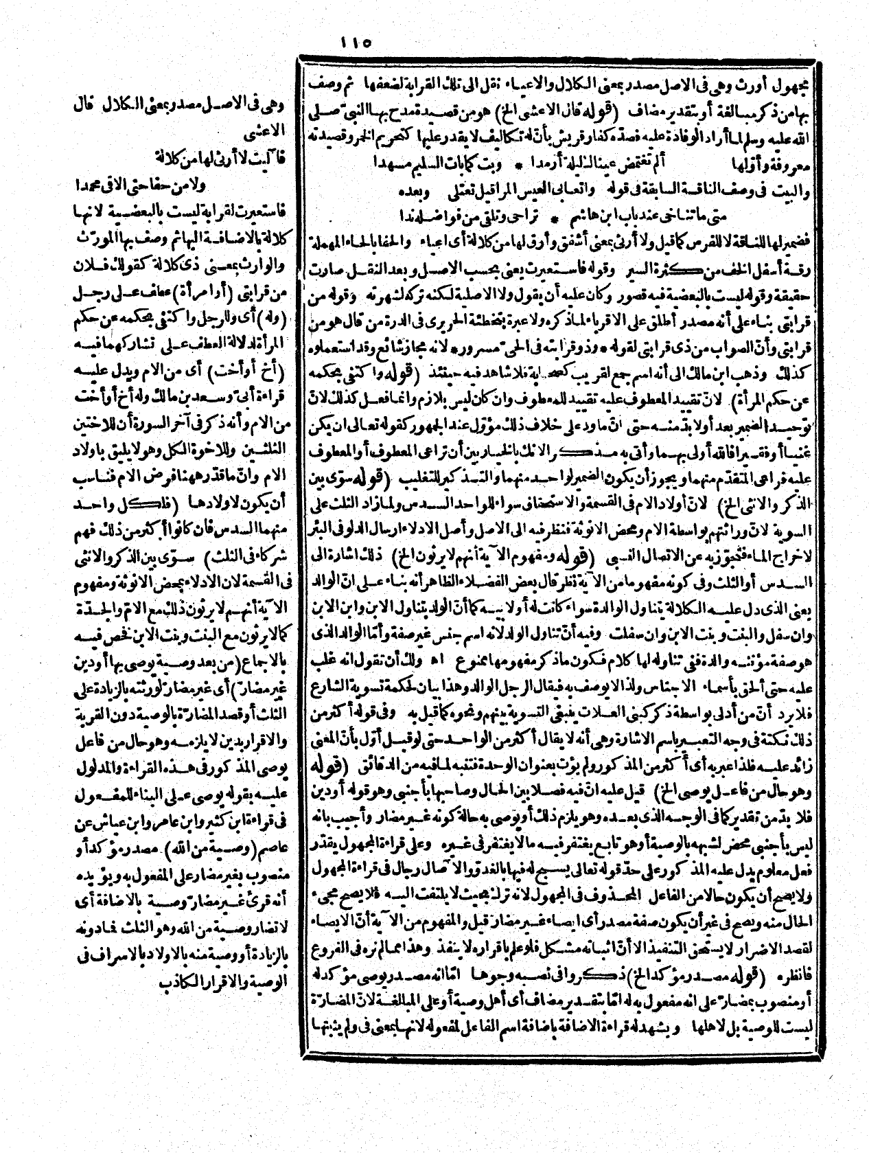 منها وقد وقعت هذه العبارة في قوله تعالى: {بَلَى قَادِرِينَ عَلَى أَن نُّسَوِّيَ بَنَانَهُ} في تفسير البغوي، وسأل عنها الناس ولم أر من فسرها إلا أنه وقع في همع الهوامع في المفعول به أنّ الكوفيين يجعلونه منصوبا بأعلى الخروج ولم يبينه فكان مرادهم أنه خارج عن طرفي الإسناد فهو كقولهم فضلة فانظره في محله وقوله: (والله عليم الخ) تهديد ووعيد على ذلك وأنّ عدم العقوبة ليس للعفو بل تأخيره لحكمه ستكون، وقول المصنف رحمه الله أو وصية منه أي وصية من الله في حق الأولاد بأن لا يدعهم عالة بالإسراف في الوصية ونحوه. قوله:) شرائعه الخ) يعني أنّ الحدود هنا استعارة شبهت الأحكام بالحدود المحيطة بشيء في أنه لا يتجاوزها أحد، ومراعاة اللفظ والمعنى فيما كان لفظه مفردا ومعناه مجموع كمن معروف وجعل الخلود حالاً مقدرة لأنه بعد الدخول لكن الفرق بين المثال وما نحن فيه ملاقاة أوّل الحال للعامل وعدمها، ثم إنّ الصفة ونحوها إن اتصف بها متبوعها وكان فاعلها فالأصل استتار الضمير ويجوز إبرازه والا فللنحويين فيه مذهبان وجوب الإبراز مطلقا، والثاني إن وقع لبس وجب إبرازه وإلا جاز إبرازه واستتاره والمشهور الأوّل، وعليه المصنف رحمه الله والزمخشري وإذا أبرز الضمير فهل هو فاعل أو الفاعل مستتر وهذا تأكيد له احتمالان ذكرهما في شرح التسهيل. قوله: (أي يفعلنها الخ) أي أن حقيقة الإتيان الذهاب فعبر به عن الفعل، وصار حقيقة عرفية فيه كما استعمل فيه المجيء ونحوه وأصل معنى الفاحشة ما اشتد قبحه فاستعمل كثيراً في اك نا لأنه من أقبح القبائح، وشناعتها بمعنى قباحتها، ووقع في نسخة بشاعتها وهو قريب منه. وقوله: (ممن قذفهن) أي رماهن وهو مما لزم من الكلام. قوله: (يستوفي أرواحهن الموت الخ (إشارة إلى