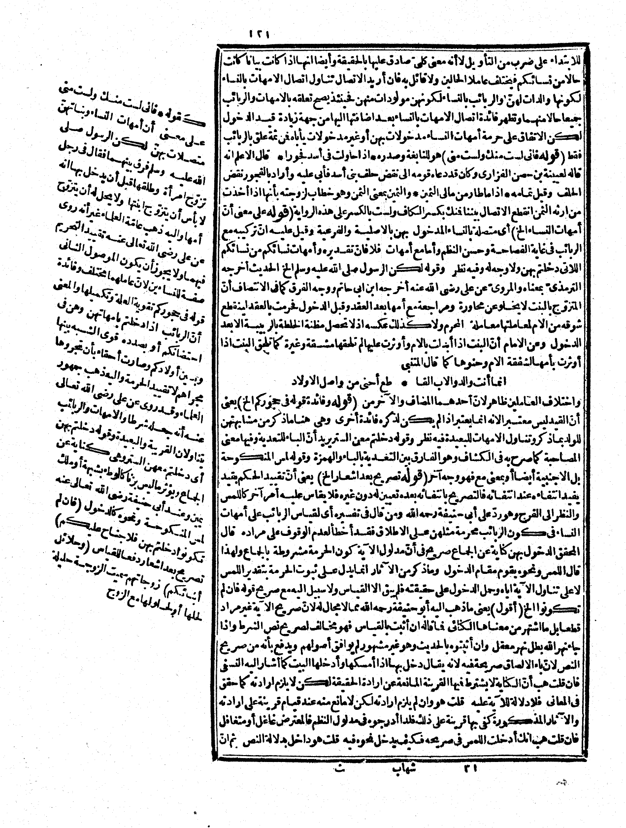 ما ذكر من كون الشرط مانعا مما ذكر ممنوع فإنه مبني على اعتبار مفهوم الشرط ونحن لا نقول به مع أنه غير عام، ولو سلم عمومه فقط خص ما فيه بعض المحرمات النسبية فيجوز تخصيصه بعد ذلك بالحديث فتأمل، وفيه كلام في بعض شروح الهداية فإن أردته فانظره، وقوله: ما لبس بزنا هو مذهب الشافعي وعندنا تحرم المصاهرة به. قوله: (احتراز عن المتبنين الخ (المتبني بصحيغة المفعول المتخذ ابنا، وذكر بعضهم فيه خلافا للشافعي رحمه الله والمنقول عنهم أنّ ذكر الأصلاب لإحلال حليلة المتبني لا لإحلال حليلة الابن من الرضاع ولا حليلة ابن الابن كمذهبنا بلا خلاف. قوله: (والظاهر أن الحرمة غير مقصورة على النكاح (فيشمل التسرّي وقوله: حرّمتهما الخ ذكره في الموطأ وقوله: مخصوصة الخ أي في غير الأختين. قوله: (ما اجتمع الحلال والحرام الأغلب الحرام) قالوا: هذه القاعدة مقرّرة، ولم يخرج عنها إلا بعض أمور نادرة لكن الكلام في كونه حديثاً فقال العراقيّ: لا أصل له وقال السبكي رحمه الله: في الأشباه إنه حديمث ضعيف، رواه جابر رضي الله عنه وكذا قال الزركثيّ وقد عورض الحديث المذكور بما رواه ابن ماجه والدارقطني عن ابن عمر رضي الله عنهما لا يحرّم الحرام الحلال، وجمع بينهما بأنّ المحكوم في الأوّل إعطاء الحلال حكم الحرام تغليبا واحتياطاً لا صيرورته في نفسه حراما وغلب الحرام بمعنى أنّ تركه أرجح كما في الحديث: " دع ما يريبك إلا ما لا يريبك ". قوله: (استثناء من لارّم المعنى الخ (قد تقدّم الكلام في هذا التركيب، وما فيه من