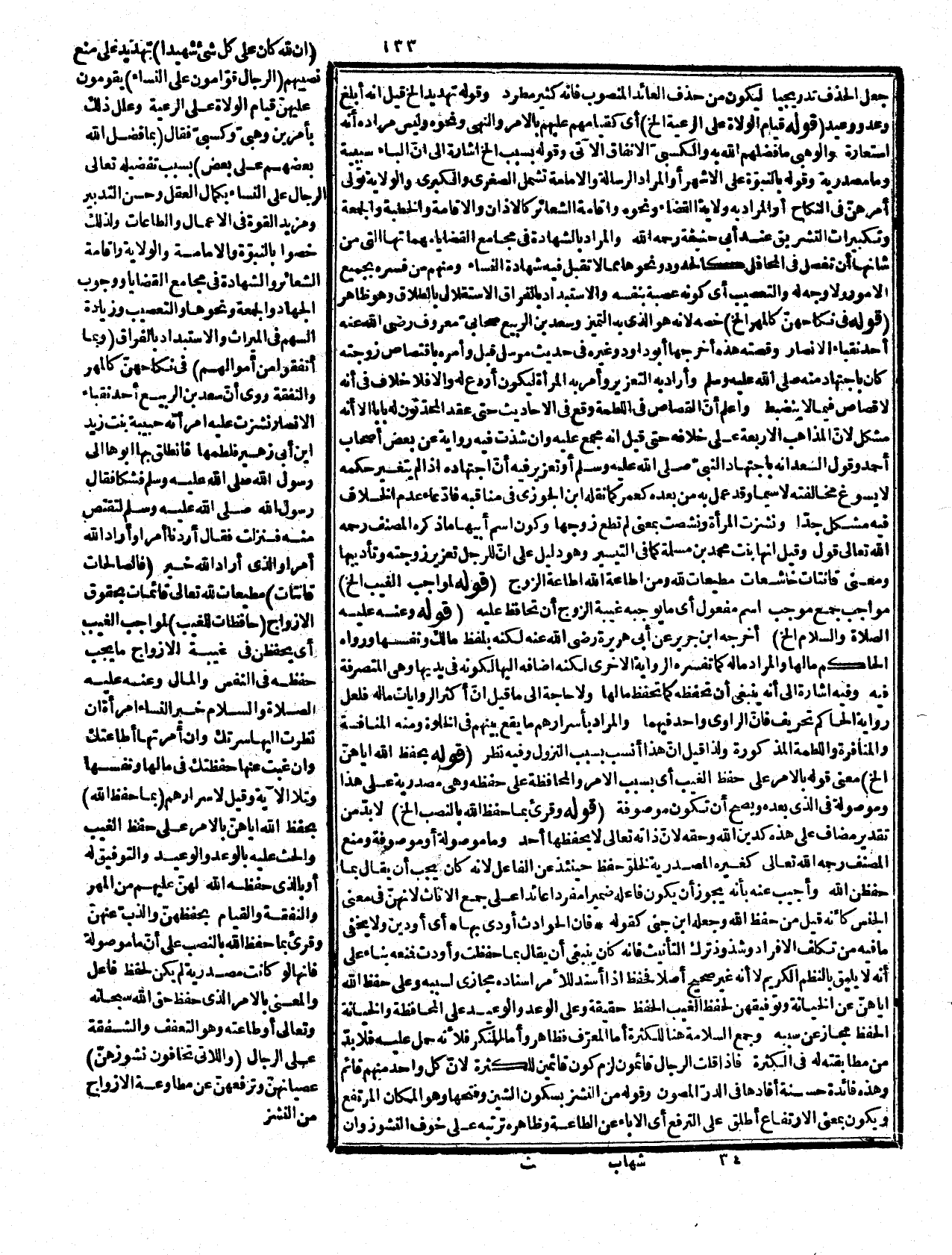 يخفى أنّ في فيل إنها للسببية فالمعنى اهجروهن بسبب المضاجع أي تخلفهن عن المضاجعة كذا قال أبو البقاء: وقيل إنها للظرفية، واهجروا بمعنى اتركوا والمضاجع بمعنى مضاجعهن أي اتركوهن منفردات في مضاجعهن وعليه فلا يرد ما ذكر رأساً؟ ولا حاجة لجوابه، وكأنّ المراد بالمبايت أخص من المضاجع والمراقد وهو هجر حجرهن ومحل مبيتهن من البيت والا فلا فرق بينه ويين ما قدمه، والمبرّح الشديد والشائن الذي فيه شين وعيب كنقص، وجراحة وكسر عضو وما! يقرب منه فالشائن بمعجمة ونون كذا في النسخ، وكونه بزاي هوز بمعنى شديد غليظ أظنه تحريفاً. قوله: (والأمور الثلاثة مرتبة الخ) الترتيب مأخوذ من السياق. والقرينة العقلية لأنها تنصح، ثم تهجر ثم تضرب إذ لو عكس استغنى عما قبله والا قالوا: ولا تدل على ترتيب، وكذا الفاء في فعظوهن لا دلالة لها على غير ترتيب المجموع دون غيره كما قيل، وفي الكشف الترتيب مستفاد من دخول الواو على أجوبة عختلفة في الشدة، والضعف مرتبة على أمر مدرّج فإنما النص هو الدال على هذا الترتيب. قوله: (والمعنى فأرّيلوا عنهن / الئعرض الخ) بغى هنا بمعنى ظلم فهو لازم، وسبيلاً منصوب على نزع الخافض وأصله بسبيل أي لا تظلموهن بطريق من الطرق بالتوبيخ اللساني والأذى الفعلي، وغيره أو بمعنى طلبءفهو متعد وسبيلاً مفعوله أي لا تطلبوا سبيلاً وطريقاً إلى التعدي عليهن، والجار والمجرور متعلق بتبغوا أو صفة سبيلاً قدم عليه فصار حالاً والمعنى على كل حال لا تتعرّضوا لهن بما يؤلمهن. وقوله: " التائب من الذنب) الحديث أخرجه ابن ماجه والطبراني والديلمي عن أنس، وابن عباس رضي الله تعالى عنهم. قوله: (فاحذروه فإنه أقدر عليكم الخ) أي المراد بوصفه تعالى بالعظمة والعلوّ ما يلزمه من تمام القدرة، وارتباطه بما قبله أنّ المراد منه أنّ قدرته عليكم أعظم من قدرتكم على من تحت أيديكم منهن فينبغي الخوف منه وأن لا يبغي أحد أو أنه مع القدرة التامّة يعفو وأنتم أحق بذلك، أو أنه قادر على الانتقام منكم غير راض بظلم أحد. قوله: (خلافاً بين المرأة وزوجها