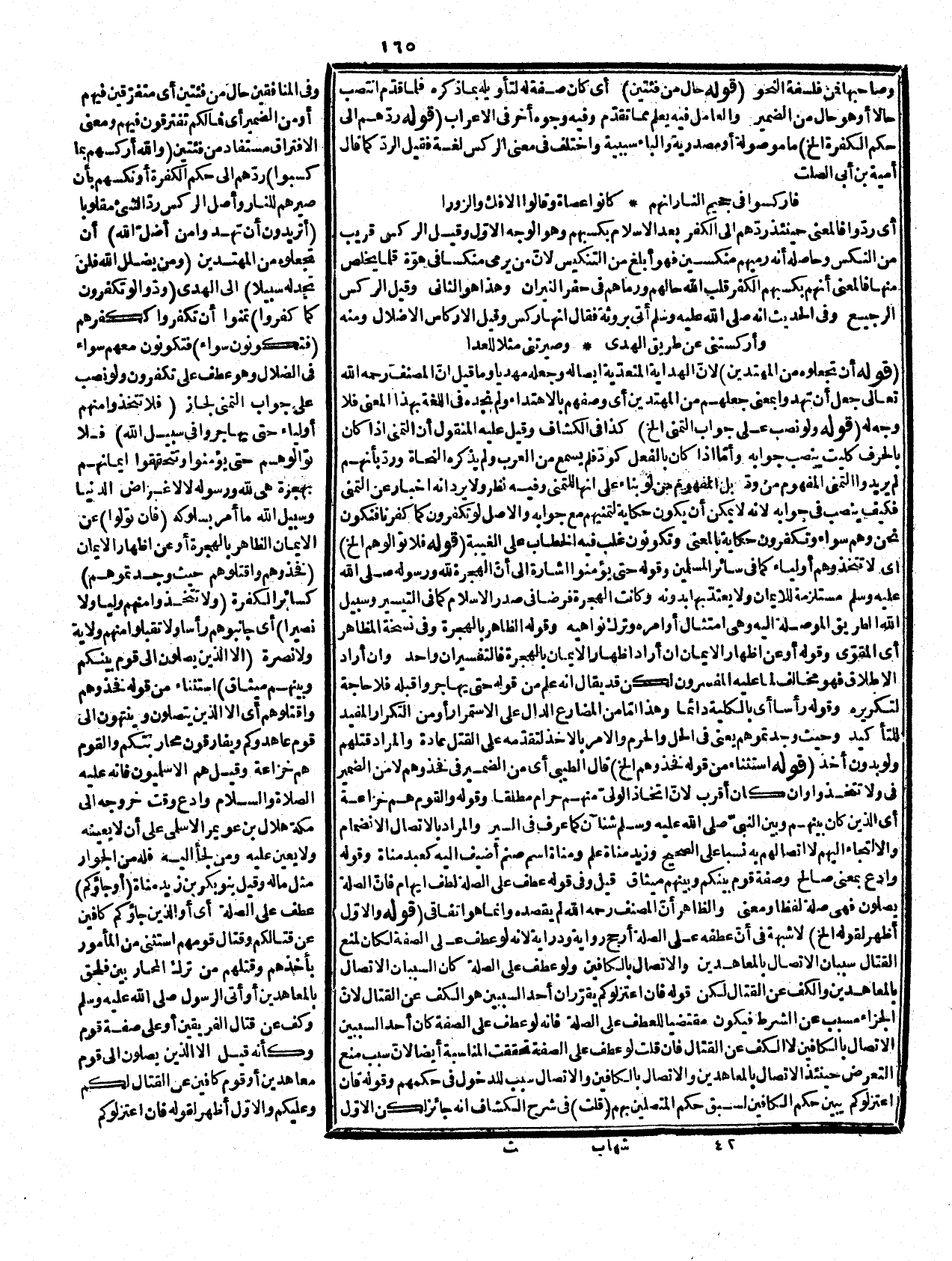 الموصوف فما ذكر التزام لزيادة الإضمار من غير ضرورة غير مسلم. قوله: (وحصرات) فيه نظر فإنه يجوز أن يكون صفة لقوم سببية لاستواء نصبه وجره، وقد يجاب عنه بأنّ الوصف الرافع لظاهر يوحد أو يجمع جمع تكسير، وجمعه جمع تصحيح قليل فهذا يؤيد الحالية، وفيه نظر وبنو مدلج قوم معروفون من العرب بالقيافة، والحصر بفتحتين ضيق الصدر من الجبن. قوله: (أي عن الخ (أي هو على تقدير الجارّ أو مفعول له مقدر له مضاف، وقوله: بأنه قوّى قلوبهم يعني أنّ التسليط عليهم معناه ما ذكر، والمقصود الامتنان على المؤمنين بأنّ تركهم القتال بسبب أن الله لم يسلطهم، وقذف في قلوبهم الرعب. قوله: (فلقاتلوكم) اللام جوابية لعطفه على الجواب ولا حاجة لتقدير لو وسماها مكيّ، وأبو البقاء لام المجازاة والازدواح، وهي تسمية غريبة وفي الإعادة إشارة إلى أنها جواب آخر مستقل، والسلم بفتحتين الانقياد، وقركما بسكون اللام مع فتح السين، وكسرها، وكأنّ إلقاء السلم استعارة لأنّ من سلم شيئاً ألقاه، وطرحه عند المسلم له وعدم جعل السبيل مبالغة في عدم التعرّض لهم لأنّ من لا يمرّ بشيء كيف يتعرّض له. قوله: (هم أسد الخ) هاتان قبيلتان، وقيل الآية في حق المنافقين، ومرّ تفسير أركسوا وتحقيقه، وقوله: وينبذوا إليكم العهد فسر السلم هنا بالعهد، وهو قريب من الأوّل لما سيأتي، وثقف بمعنى وجد والتمكن من الشيء في قوّة وجدانه، وقوله: مجرّد الكف يعني بدون المعاهدة التي يكون له بها ذمة، وجوز في السلطان أن يكون بمعنى الحجة ومصدراً بمعنى التسلط. قوله: (وما صح له وليس من شأنه) ما كان وما ينبغي يستعملان بمعنى لا يليق، ولا يصح والمراد بنفي الصحة نفي الإمكان دون الصحة الشرعية، والمقصود منه المبالغة، والا فالقتك لا يخرج عن الإمكان، وقيد القتل بغير