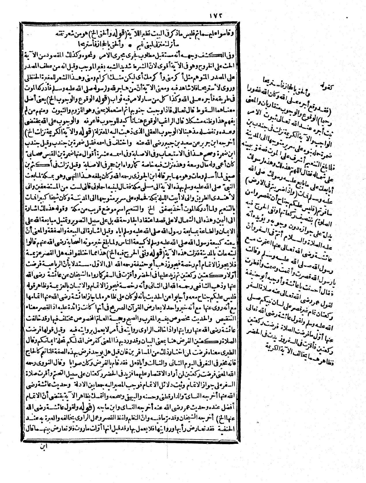 إليه الأمر من التخفيف لا أنها استمرّت منذ فرضت فلا يلزم من ذلك أنّ القصر عزيمة انتهى، ويدل على أنه رخصة حديث صدقة تصدّق الله بها عليكم الآتي وأما أنّ حديث عائشة رضي الله عنها غير مرفوع لأنها لم تشهد فرض الصلاة فغير مسلم لجواز أنها سمعته من النبيئ مج! يوو، ويرد على ما جمع به ابن حجر رحمه الله أنها لو كانت قبل الهجرة ركعتيى لاشتهر ذلك، وعلى كل حال فهو أمر صعب. قوله: (فإن صحا الخ الا يخفى أنهما صحيحان مخرّجان في السنن فلا يليق التردّد فيه كما مرّ، والمراد بالآوّل حديث عمر رضي الله عنه فقوله تامّ أي مجزئ إجزاء التام الغير المقصود والثاني حديث عائثة رضي الله عنها يعني أنّ ذكرها الركعتين لا ينفي الزيادة بناء على أنّ العدد لا مفهوم له ولا يخفى بعده، ثم أشار إلى جواب أبي حنيفة رضي الله عما في النظم مما يدل على خلاف مذهبه. قوله: (أربعة برد عندقا الخ) برد بضمتين جمع بريد، وهو اثنا عشر ميلاً كل ميل اثنا عشر ألف قدم، والفرسخ ثلامة أميال وكانوا يبنون ربطاً في الطريق يسمونها السكك بين كل سكتين اثنا عشر ميلا، وثمة بغافى معلمة بخلاف الأذناب، ويسمون كل واحد منها بريداً وهي كلمة فارسية أصلها بريده دم أي محذوف الذنب، ثم سمي الراكب به، والمسافة، وزيادة من في الإثبات مذهب الأخفش، وغيره يأباه، ومن عنده تبعيضية لأنّ المقصور بعض الصلاة، وهي الرباعية. قوله: (شريطة باعتبار النالب الخ الما كان ظاهره أن القصر إنما يكون في حال خوف العدوّ أشار إلى أنه شرط جرى على الغالب فلا مفهوم له كما في الآية المذكورة أو أنّ ثبوته في الأمن ثابت بالسنة وقوله: (كراهة الخ) يعني أنه مفعول له بتقدير مضاف وهو ضمير الفتنة، وذكر باعتبار الخبر أو لأنه مصدر. قوله: (لا يعتبر مفهومها الخ) قال المحقق الفناري في فصول البدائع فيه بحث لأنه ورد في الحديث أنّ عمر