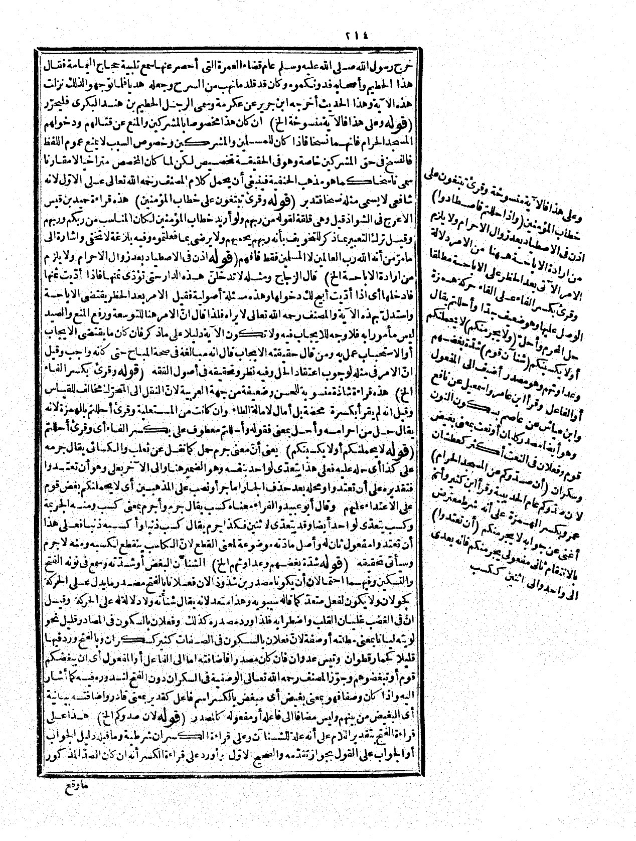 النهي عن الإثم والعدوان عدم التعرّض لقاصدي البيت الحرام دخولاً أوّلياً وعلى الوجه الأوّل يكون عطفا على، ولا يجرمنكم من حيث المعنى لأنه من باب لا أرينك ههنا كأنه قيل لا تعتدوا على قاصدي المسجد الحرام لأجل أن صدكم قريش عن البيت الحرام، وتعاونوا على العفو والإغضاء، ومن ثمّ قيل الوقف على أن تعتدوا لازم لأن الاعتداء منهيّ عنه، والتعاون على البرّ، والتقوى مأمور به، والتشفي طلب شفاء الصدر بالانتقام. قوله: (ما فارقه الروح من غير تذكية الخ) والمراد حتف أنفه من غير سبب خارج عنه، والدم المسفوح الذي أسالوه، وأخرجوه بآلة والأمعاء جمع معى، وهي المصارين والإهلال رفع الصوت، والمراد به هنا ذكر ما يدّبح له، وقوله: {من وقذته} إذا ضربته أصله أن تضربه حتى يسترخي، ومنه وقذه النعاس أي غلب عليه، وإنما قال في تاء النطيحة أنها للنقل لأنها المنطوح مطلقا مذكراً كان أو مؤنثا ولأن فعيلاً بمعنى مفعول لا تدخله التاء، وفسر ما أكل السبع بما أكل منه أي أكل بعضه لأن ما أكل كله لا يتعلق به حكم، ولا يصح أن يستثنى منه ما أدركه وذكى. قوله: (وهو يدل على أن جوارح الصيد الخ) جوارج الصيد أعم من كلابه، وطيوره كالبازي، وهي في حكم السباع والحياة المستقرّة هي التي لا تكون على شرف الزوال قيل، وعلامتها أن تضطرب بعد الذبح لا وقت الذبح فإنه لا يحسب، وقوله: (من ذلك) أي ما ذكر قبله من المنخنقة إلى هنا إذ لا يحتمل رجوعه إلى ما قبله، وعلى هذا لا تقيد المذكورات بقوله فماتت، والا لم يصح الاستثناء منها، وقوله: (في الشرع لقطع الحلقوم) أي موضوعة له، وفي نسخة بقطع الحلقوم بالباء متعلق بالذكاة، والمريء مجرى الطعام، وتفصيل التذكية في الفقه. قوله: (النصب واحد الأنصاب) معطوف على الميتة، واختلف فيها فقيل هي حجارة كانوا يذبحون عليها فعلى على أصلها، ولعل ذبحهم عليها كان علامة على كونها لغير إدلّه، وقيل هي الأصنام لأنها نصبت لتعبد. وعلى على أصلها أو بمعنى اللام، والنصب بضمتين جمع نصاب، وقيل هو مفرد