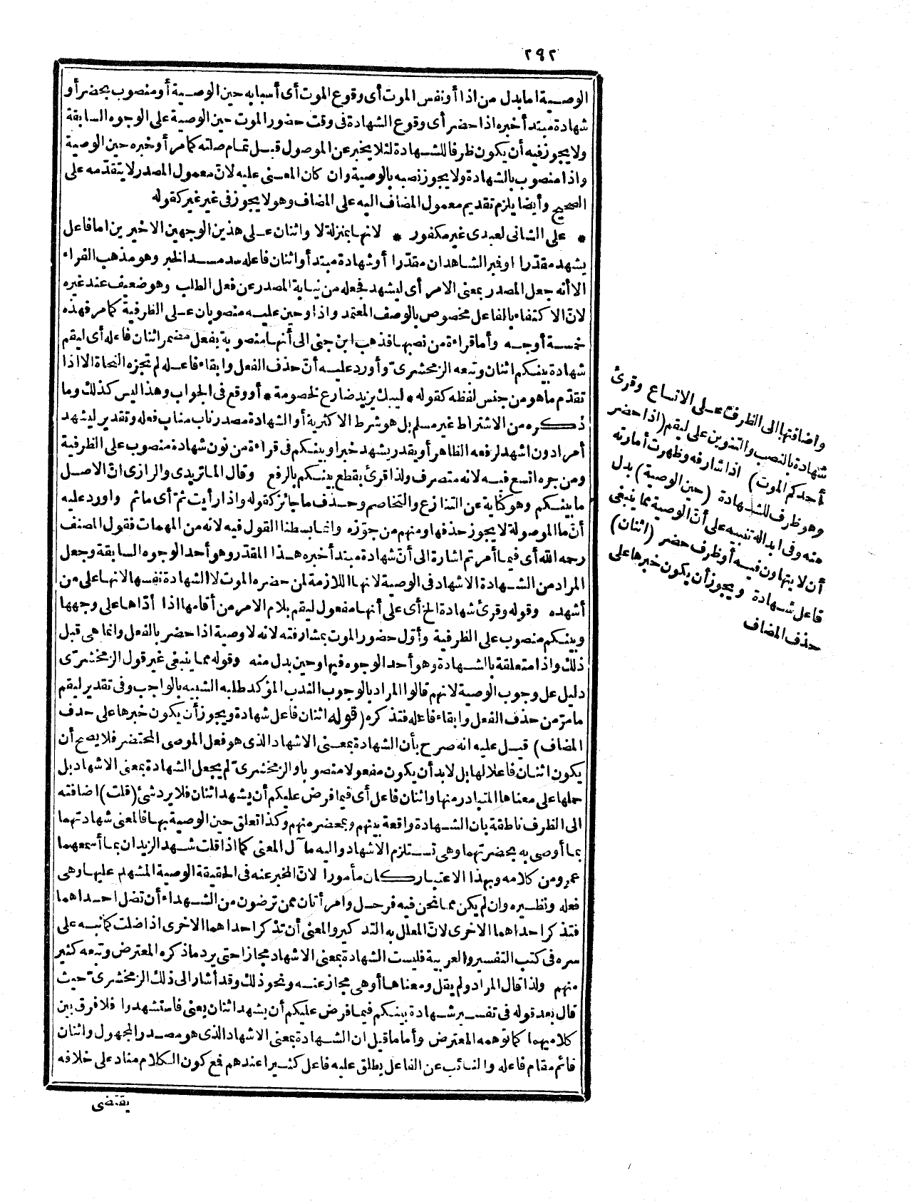 يقتضي الإتيان لمصدر الفعل المجهول بنائب فاعل، وهو اسم ظاهر مرفوع، وهذا وأن جوّزه البصريون كما في شرح التسهيل للمرادي في باب المصدر فقد منعه الكوفيون، وقالوا إنه هو الصحيح لأنّ حذف فاعل المصدر سائغ شائع فلا يحتاج إلى ما يسد مسد فاعله كفاعل الفعل الصريح، وحذف المضاف إما من المبتدأ أو الخبر كما مرّ، ووقع في النسخ هنا اختلاف ففي نسخة الأشهاد في الوصية، وفي أخرى بالوصية، وفي أخرى أو الوصية فيكون المراد بالشهادة الوصية، وسيأتي ما يتعلق به، والأخيرة ليست معتمدة، ولا تناسب الكلام فتأمّل. قوله: (من أقاربكم أو من المسلمين وهما صفتان الخ) التفسيران مبنيان على ما سيأتي. قوله: (ومن فسر الغير بأهل الذفة) بناء على أنّ منكم معناه من المسلمين، وفي كونه منسوخا، واجماعاً نظر أما الأوّل فلأنه قد سبق من المصنف رحمه الله تعالى في آية الوضوء أن القول بالنسخ في هذه السورة ضعيف لقوله صلى الله عليه وسلم المائدة آخر القرآن نزولاً فأحلوا حلالها وحرّموا حرامها، وأما الثاني فلأنّ ابن حنبل رضي الله تعالى عنه أجاز شهادة الكافر على المسلم في الوصية، وأبو حنيفة رحمه الله تعالى أجازها في بعض الصور المذكورة في الفقه فتأمل. قوله: (أي سافرتم فيها) لأنّ ضرب في الأرض! معناه سافر كما بين في كتب اللغة، وقوله أي قاربتم الأجل إشارة إلى أنه من مجاز المشارفة لأنّ الوصية قبل إصابته. قوله: (تقفونهما الخ) وقف يكون لازما ومتعديا قال الراغب: يقال وقفت القوم أقفهم وقفا، ووقفواهم وقوفا، وتصبرونهما من الصبر بالصاد المهملة بمعنى الحبس قال في