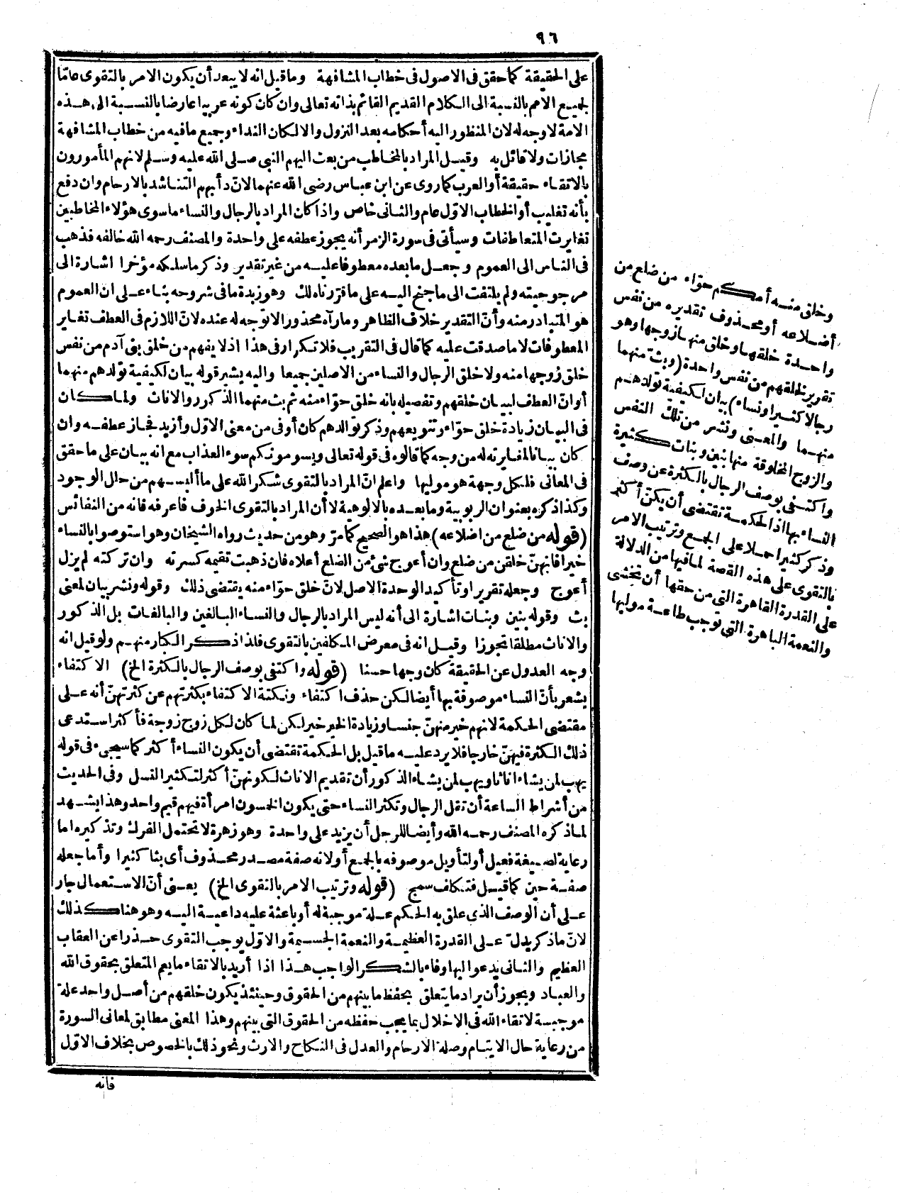 فإنه إنما يطابقها من حيث العموم فإنّ اتقاء الله باجتناب الكفر والمعاصي وسائر القبائح يتناول رعاية حقوق الناس ويؤيده ما رواه مسلم عن جرير وضي الله عنه قال كنا صدر النهار عند رسول الله صلى الله عليه وسلم فجاءه قوم مجتابي النمار أو العباءة متقلدي السيوف من مضر فتمعر وجهه لما رأينا بهم من الفاقة فدخل ثم خرج فأمر بلالاً فأذن فقام ثم خطب فقال: " يا أيها الناس اتقوا ربكم " إلى قوله: " إنّ الله كان عليكم وقيبا " أي عالما بأحوالكم فاحذروه ولا يخفى موقع الخاتمة مما قبلها. وقوله:) أو لآن المراد الخ (فالتقوى خاصة وعلى ما قبله عامة ة