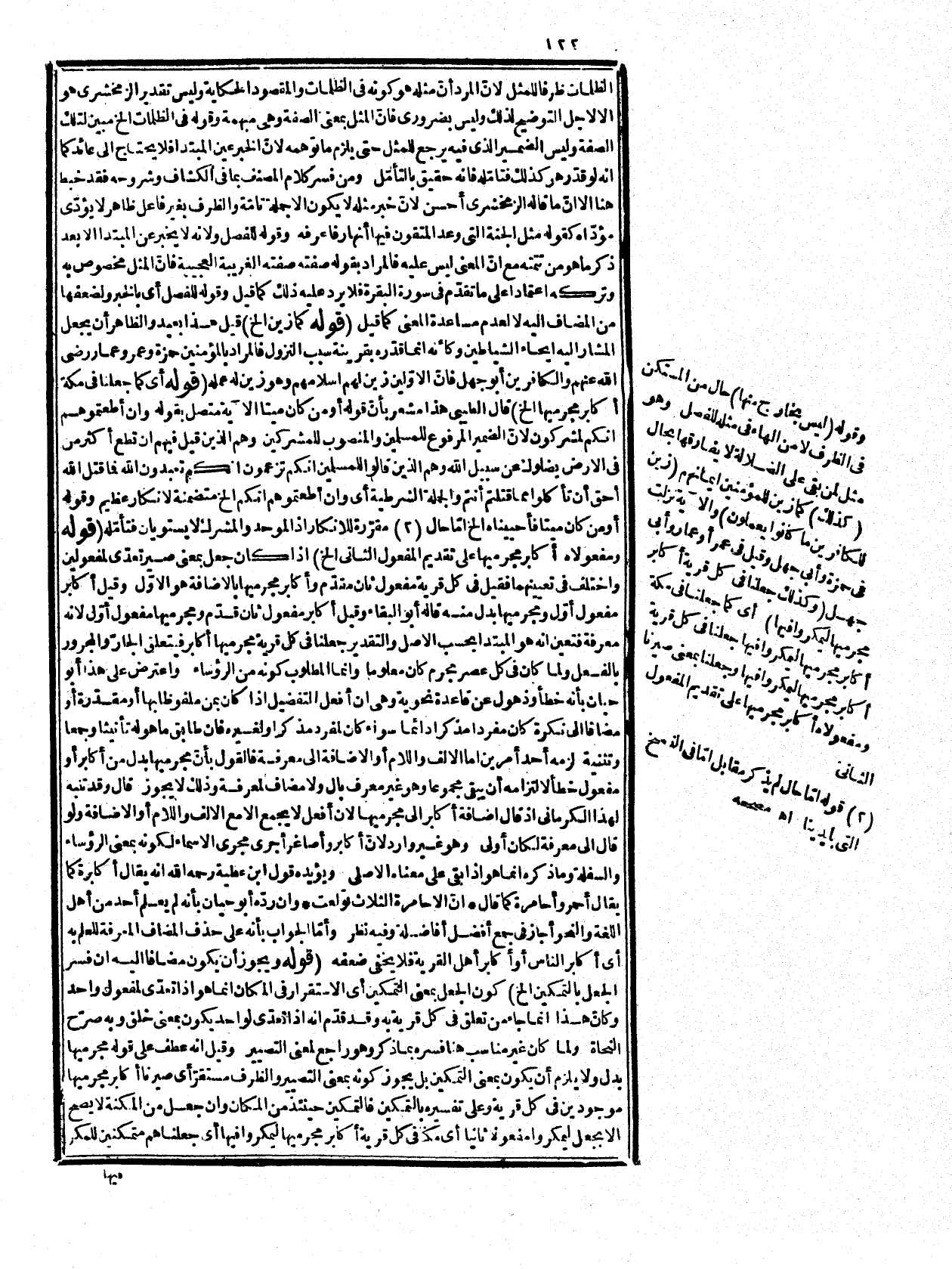 لغو من الكلام لا يفيد، وجعل أصل الكلام أكابر المجرمين فأضيف إلى ضمير القرية لزيادة الربط تكلف مستغنى عنه، فتعين أن يكون متعديا لواحد بمعنى مكناهم لأن معنى جعل زيد في البيت إسكانه وتمكينه فيه وكأنه معنى مجازي، وقى عليه جعل جعل بمعنى خلق ومنه يعلم ما وقع في بعض الحواشي، وقوله إذا أضيف يعني لمعرفة وهو الواقع وترك التصريح به لأنه معلوم، وقال النحرير: قيل في كل قرية أكابر مفعولاً جعلنا ومجرميها بدل أو مضاف إليه بدليل قراءة أكبر مجرميها، وقيل أكابر مجرميها مفعولاه بتقديم الثاني وفي كل قرية لغو، والذي يقتضيه النظر الصائب، والتأمّل الصادق إنّ في كك قرية لغو وأكابر أوّل وليمكروا ثان انتهى. قوله: (زاحمنا بني عبد مناف) يعني نافسناهم في الشرف، وقوله: (كفرسي رهان) هو مثل يضرب للتساوي ولما كان فرسا الرهان لا يلزمهما التساوي إذ قد يسبق أحدهما فسره في النهاية بقوله سابقان إلى غاية، وقال غيره المراد التشبيه باعتبار ابتداء الجري والخروج للرهان لا باعتبار النهاية. قوله: (استئناف للرذ عليهم الخ) أي جواب سؤال نشا من قولهم لن نؤمن الخ أي فما كان جواب الباري تعالى لهم قوله: وإنما هي بفضائل الخ في المواقف لا يشترط في الإرسال استعداد ذاني بل الله يختصبرحمته من يشاء، والله أعلم حيث يجعل رسالاته فقيل عليه دلالة الآية على الاستعداد أظهر لما روي عن أبي جهل ولما ذكره المصنف رحمه الله، وهذا لا يستلزم الإيجاب الذي يقوله الفلاسفة لأنه إن شاء أعطى النبوّة وان شاء أمسك وأن استعد المحل.