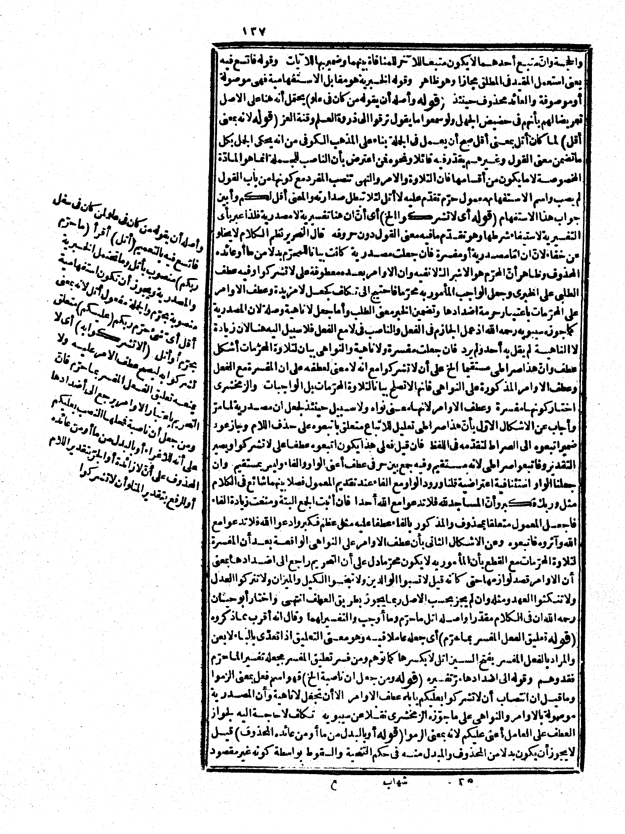 بالنسبة فلو حذف لفظاً أيضا لم يبق له اعتبار اً صلاً، والعجب من النحرير إنه جوّز ذلك هنا وقد أشار في المطول إلى ما حققناه في حواشيه وهو تحيل لا وجه له وقد مرّ ما فيه، وقيل إن جعلت إن مصدرية فلا إمّا زائدة أو ناهية أو نافية وكلها باطلة لعطف الأوامر فلو كانت زائدة لكان المأمور به محرّما لأن التقدير حينئذ حرّم أن تشركوا وأن تحسنوا وعلى النهي يجتمع ناصب وجازم على فعل واحد وهو غير جائز وعلى النفي يلزم عطف الطلب على الخبر إلا أن يقال الخبر متضمن للطلب إذ هو في معنى النهي، ورد بأن المعاني الواجبة تجعل محرّمة باعتبار أضدادها كما مرّ وأما جعل لا ناهية وان جوّز اجتماع الناصب والجازم فلا سبيل إليه كما مرّ، وتضمن الخبر معنى الطلب تكلف، وقيل الإنشاء هنا مؤوّل بمفرد فيجوز أن يعطف على الخبر المؤوّل به، وقيل إنه على هذا الأوامر معطوفة على تعالوا لا على لا تشركوا حتى يلزم ما ذكر وعلى تقدير اللام فالجواب عن عطف الأوامر ما مرّ، وقوله: (أو المحرّم أن تشركوا) إشارة إلى زيادة لا في هذا الوجه وقوله يحتمل المصدر فيكون معناه إشراكا ما وعلى المفعولية شريكا ما. قوله: (وضعه موضع النهي الخ) جعله كناية عن ذلك لتتناسب المعطوفات، ولأن الأمر بالشيء نهي عن ضده ولأنّ الإحسان إذا لم تترك معه الإساءة لا يعتد به كما قال أبو الطيب: