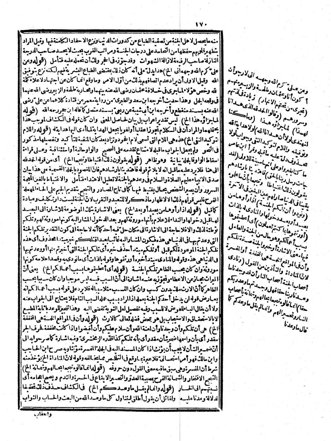 والعقاب وسائر أحوال القيامة لأنهم كانوا مكذبين بذلك أجمع، ولأن الموعود كله مما ساءهم وما نعيم أهل الجنة إلا عذاب لهم فأطلق لذلك يعني لم يذكر مفعولاه لأنّ المراد مطلق الموعود به سواء كان لهم أو لغيرهم فليس القصد إلى تخصيص موعود ولا موعود به ولو قيل كذلك لتقيد بما وعدوا به فلا يرد عليه ما قيل إنه لو ذكر المفعول على حسب ذكره في الأوّل فقيل فهل وجدتم ما وعدكم ربكم حقا لكان الفعل مطلقا أيضا باعتبار الموعود به لأنه لم يذكر فيتناول كل موعود به من البعث والحساب والعقاب التي هي أنواع من جملتها التحسر على نعيم أهل الجنة فليس ذلك خاصاً بحذف المفعول الواقع على الموعودين فالوجه أن حذفه تخفيفا وايجازا واستغناء عنه بالأول ولا ما قيل إن الجواب لا يطابق سؤاله لأن المدعي حذف المفعول الأول وهو ضمير المخاطبين والجواب وقع بالمفعول الثاني الذي هو الحساب والعقاب وسائر الأحوال فهو إنما يناسب لو سئل عن حذف المفعول الثاني لا الأول. قوله: (لأنّ ما ساءهم من الموعود الخ (قيل لا خفاء في كون أصحاب الجنة مصدقين بالكل والكل مما يسرّهم فكان ينبغي أن يطلق وعدهم أيضاً فلا بد من حمله على الاكتفاء بالسابق لا على الإطلاق. قوله: (وهما لنتان (ولا عبرة بمن أنكر الكسر مع القراءة به واثبات أهل اللغة له، وصاحب الصور إسرافيل عليه الصلاة والسلام وقوله بين الفريقين لا بين القائلين نعم كما قيل، ولا يرد أن الظاهر أن يقال بينهما لأنه غير متعين والكسر على إرادة القول مذهب البصريين بالتضمين أو التقدير، وعلى الحكاية بإذن لأنه في معنى القول فيجري مجراه مذهب الكوفيين، والتأذين المراد به النداء وهو إعلام بلعنة الله لهم أو ابتداء لعن. قوله: (صفة للظالمين مقرّرة (فلا يوقف بينهما وعلى القطع يصح الوقف، وإنما كانت صفة مقرّرة لأنّ الصدّ عن سبيل الله بمعنى الإعراض عنه لا منع الغير، وطلب ميلة لازم لكل ظالم شتكون الصفة مقرّرة مؤكدة بخلاف الصد بمعنى منع الغير، ولذا قيل صده عن كذا صرفه، ومنعه عنه