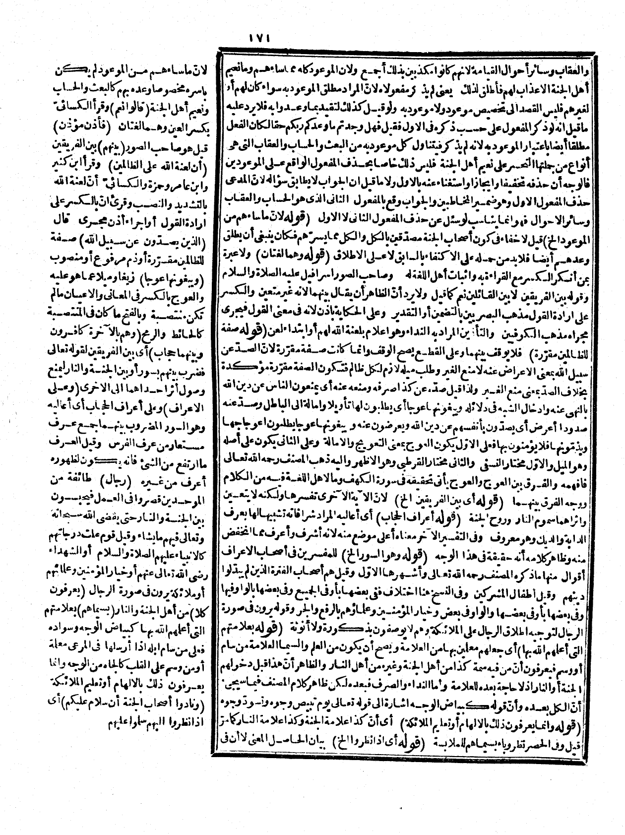 الكلام شرطاً مقدراً وفي الدرّ المصون أنه إشارة إلى أنه جزاء شرط محذوف، والداعي له مراعاة قوله وإذا صرفت أبصارهم. قوله: (حال من الواو) وفي الكشاف استئناف أو صفة رجال وضعف بالفصل. وقوله: (على الوجه الأوّل) أي في تفسير رجال الأعراف بمن حبس بين الجنة والنار. وأما على بقية الوجوه فهو حال من أصحاب الجنة لأنه لا يناسب قوله لم يدخلوها وهم يطمعون إلا أنه قيل إن يطمعون بمعنى يعلمون ويتيقنون وهو بهذا المعنى منقول عن أهل اللغة، وبه فسر قوله والذي أطمع أن يغفر لي أي أعلم أو يحرصون. وأمّا جملة وهم يطمعون فحال من واو لم يدخلوها بعد تسليط النفي أي كانوأ طامعين حال دخولهم الجنة لا قبله، فتأمل وتلقاء في الأصل مصدر وليس في المصادر تفعال بكسر التاء غير تلقاء وتبيان، ثم أستعمل ظرف مكان بمعنى جهة اللقاء والمقابلة فنصب على الظرفية. وفي قوله صرفت إشارة إلى أنهم لم يلتفتوا إلى جهة النار إلا مجبورين على ذلك لا باختيارهم، لأنّ مكان الشرّ محذور، ولذا استعاذوا منه وقوله من رؤساء الكفرة كأبي جهل بيان لقوله رجالاً. وما في ما أغنى استفهامية للتقريع والتوبيخ ويجوز أن تكون نافية، والجمع بمعنى الكثرة استعمال له في كماله، وعلى الثاني هو مصدر مفعوله مقدر وهو أنسب لعدم تكريره مع ما بعده. وما في ما كنتم مصدربة لعطفه على المصدر. قوله: (من تتمة قولهم الخ) فهو في محل نصب مفعول القول أيضا أي قالوا ما أغنى وقالوا أهؤلاء الخ. وجوّز فيه أن يكون جملة مستقلة غير داخلة في حيز القول، والمشار إليه على الأوّل هم أهل الجنة. والقائلون هم أهل الأعراف والمقول لهم أهل النار، والمعنى قال أهل الأعراف لأهل النار أهؤلاء الذين في الجنة اليوم هم الذين كنتم تحلفون أنهم لا يدخلونها وادخلوا الجنة بمعنى قالوا لهم أو قيل لهم ادخلوا الجنة وعلى الاستئناف اختلف في المشار إليه فقيل هم أهل الأعراف، والقائل ملك مأمور بذلك، والمقول له أهل النار وقيل المشار إليه أهل الجنة والقائل الملائكة والمقول له أهل النار، وقيل المشار إليهم هم أهل الأعراف وهم القائلون أيضا والمقول لهم الكفار وادخلوا الجنة من قول أهل الأعراف أيضا أي يرجعون فيخاطب بعضهم بعضا ولا ينالهم الخ جواب القسم. قوله: (أي فالتفتوا إلى أصحاب الجنة الخ (أي ومعنى ادخلوا دوموا فيها غير خائفين ولا محزونين، وقوله وهو أوفق للوجوه إلا خيرة هي تفسير